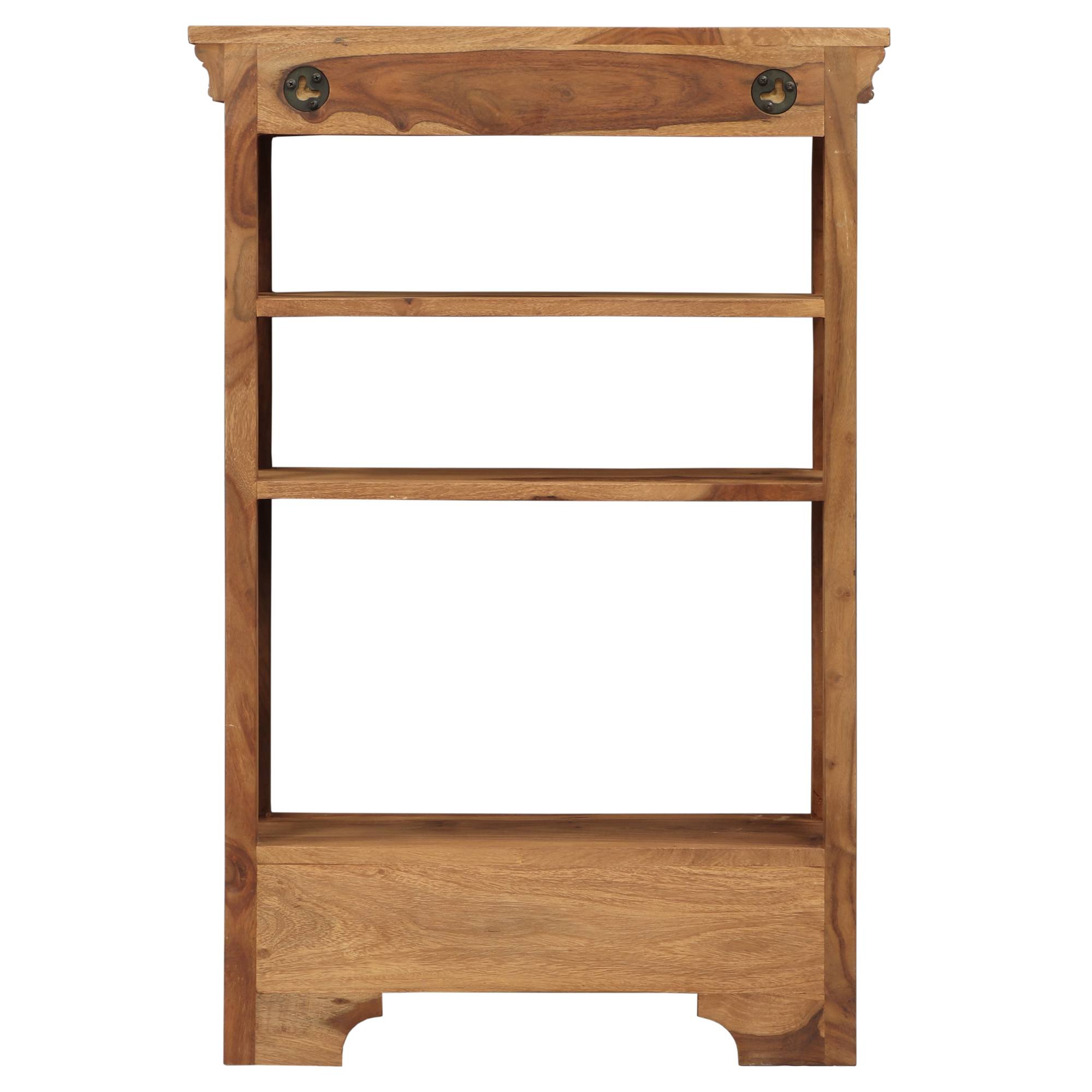 Vyroben je z masivního dřeva shishamu, velmi odolné exotické dřeviny rovněž známé jako palisandr. Ten vyniká svojí pevností a výraznou kresbou dřeva s unikátními barevnými přechody, které se kus od kusu liší. Každý kus je tak svým způsobem naprosto jedinečný. Regál je vybaven 2 vloženými policemi, které nabízí dostatek místa pro uložení všeho potřebného i vystavení dekorací.