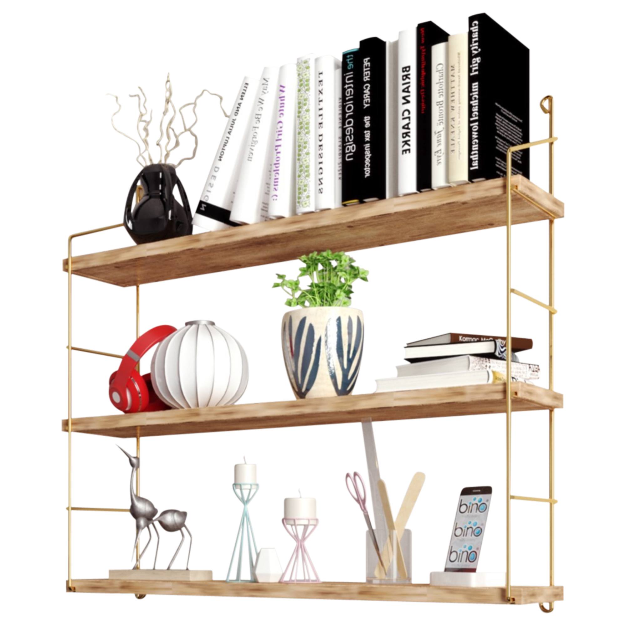 Nástěnný regál KITA elegantně vyzdobí každý obývací pokoj, pracovnu, ale i koupelnu. Nejenže vás uchvátí svou kovovou konstrukcí ve zlaté barvě a třemi dřevěnými policemi, ale také svým kvalitním provedením. Díky jeho praktickému designu a stylovému vzhledu ho můžete umístit do jakéhokoli interiéru. Získáte tak plno prostoru pro uložení všeho potřebného. Povrch policového regálu se vám bude snadno udržovat.