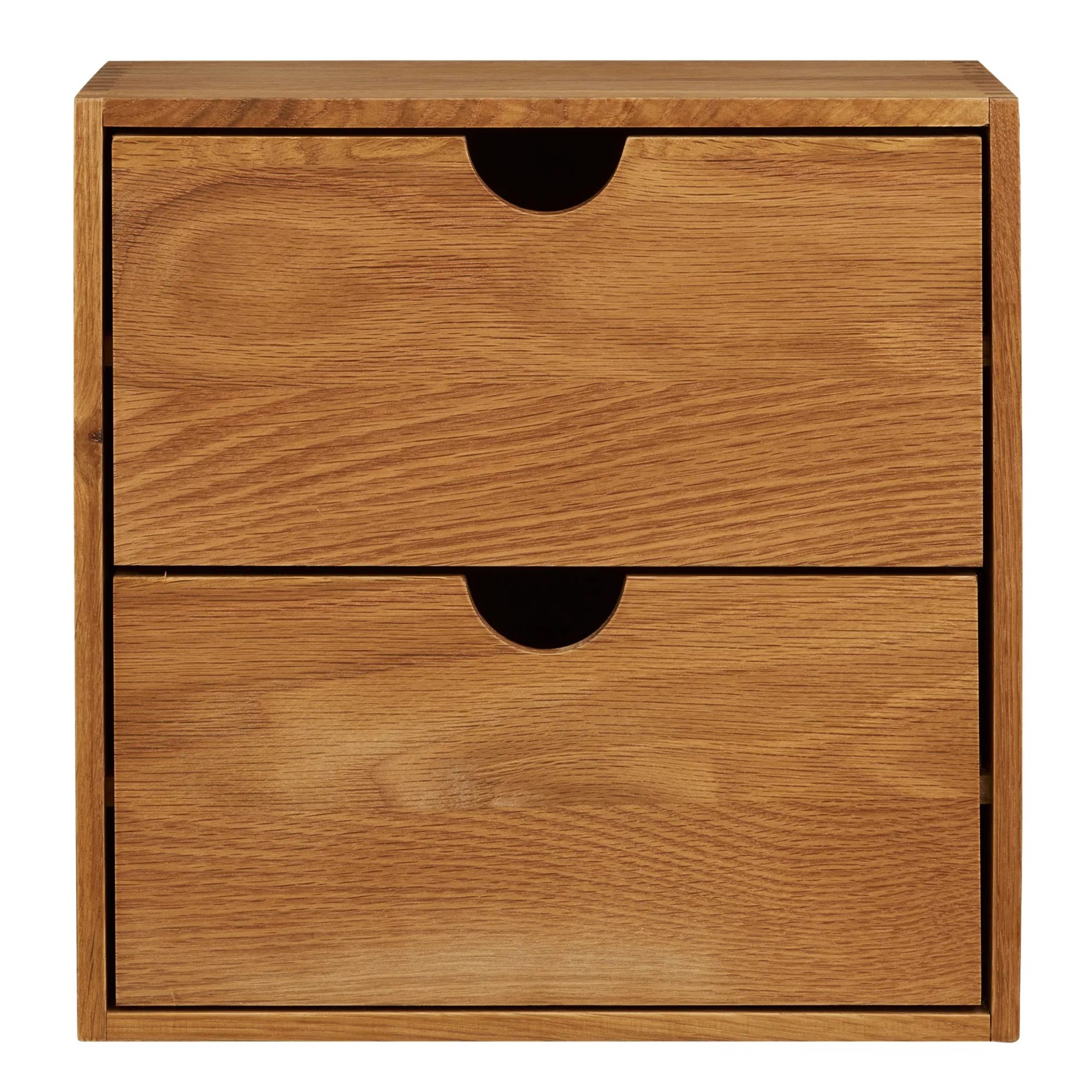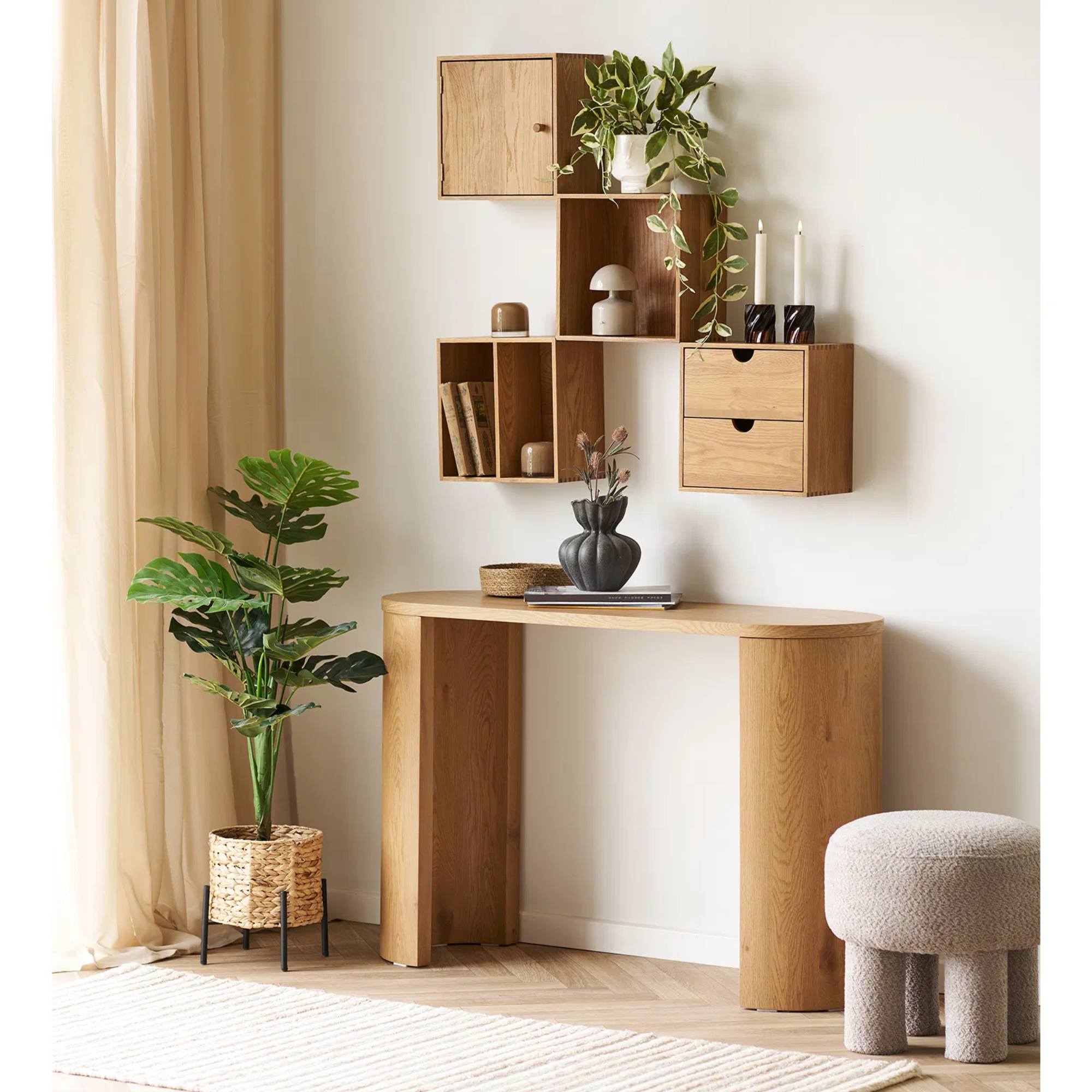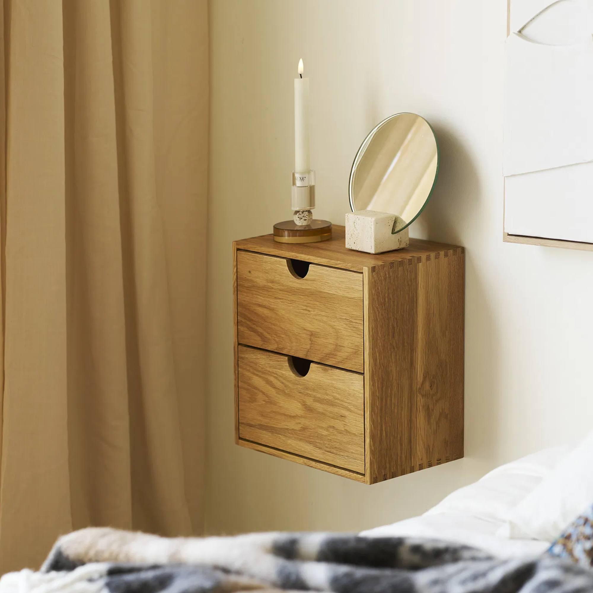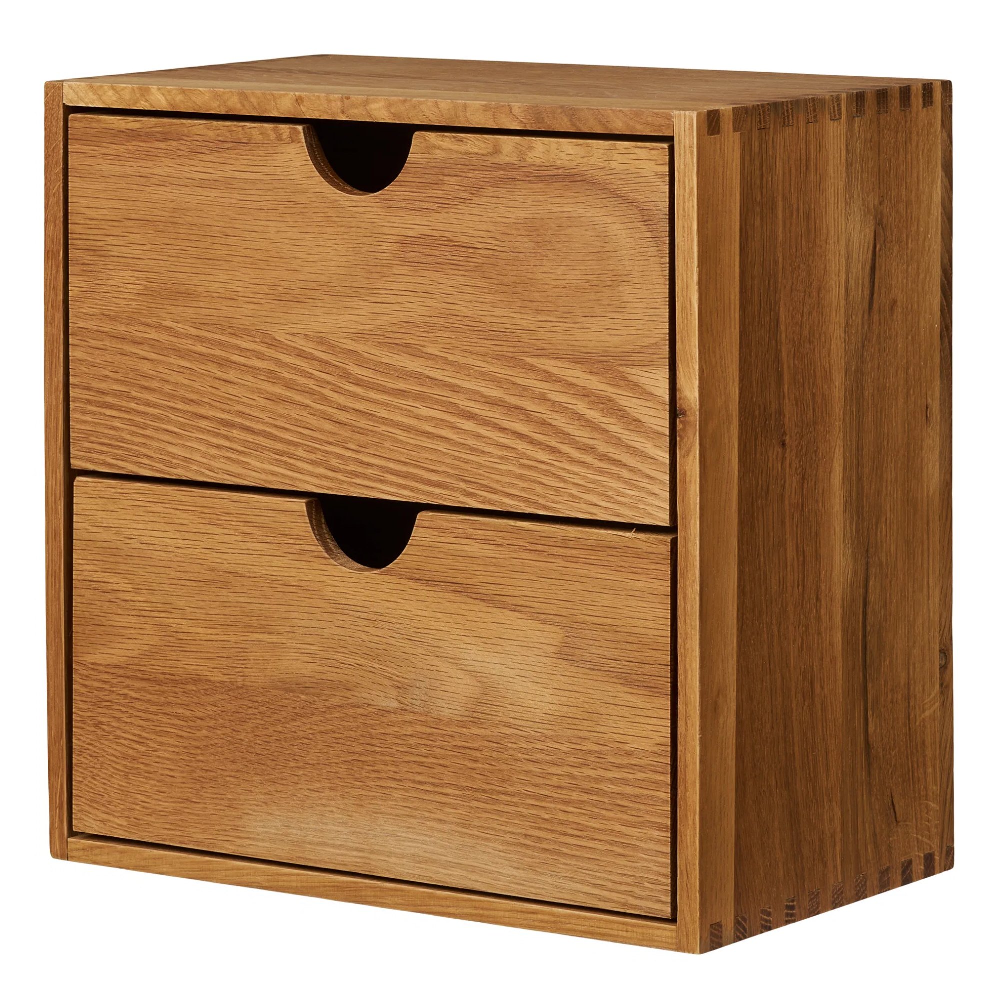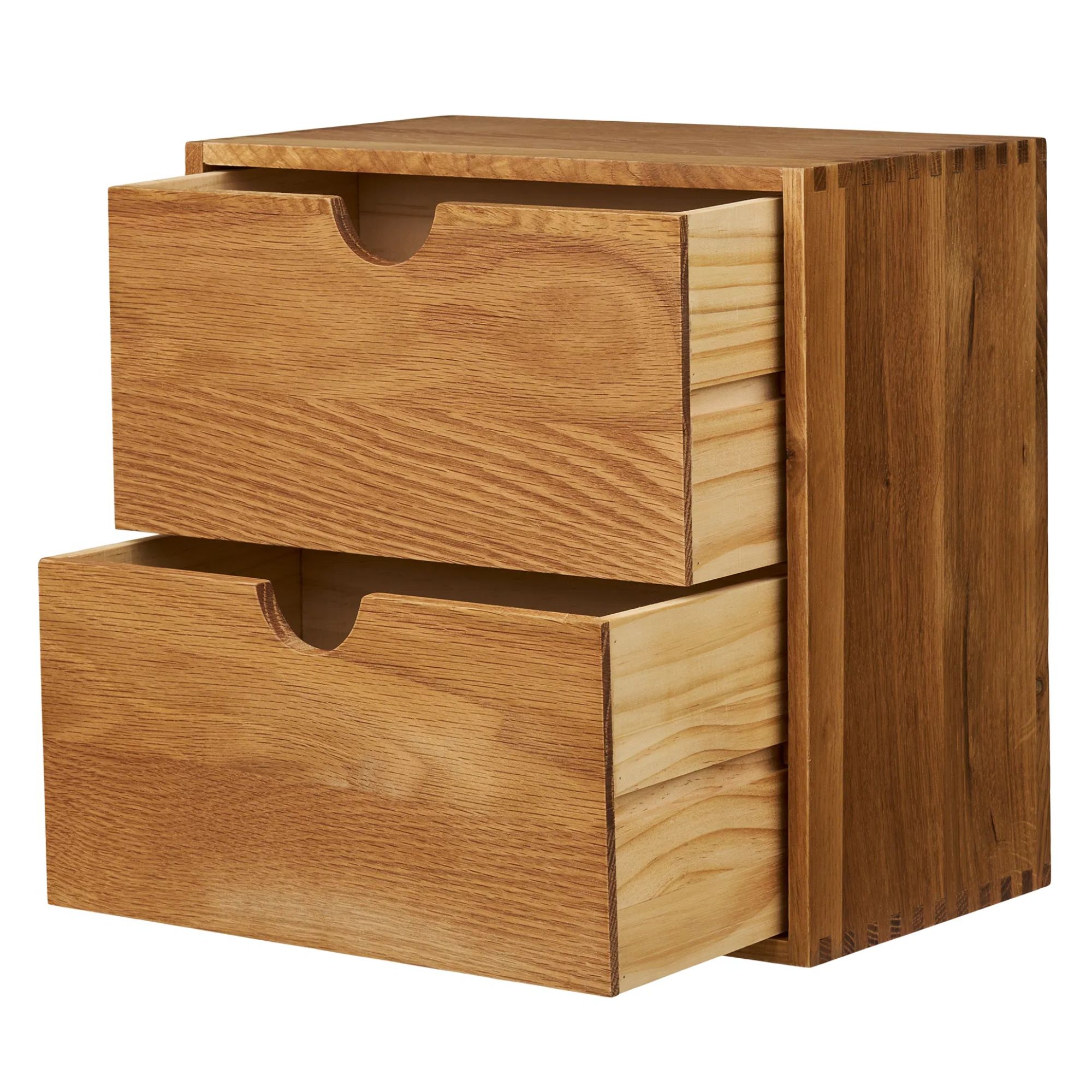 Regál vám nabídne dodatečný odkládací prostor, který je tvořený 2 zásuvkami. Na jeho výrobu bylo využito masivní dubové dřevo.