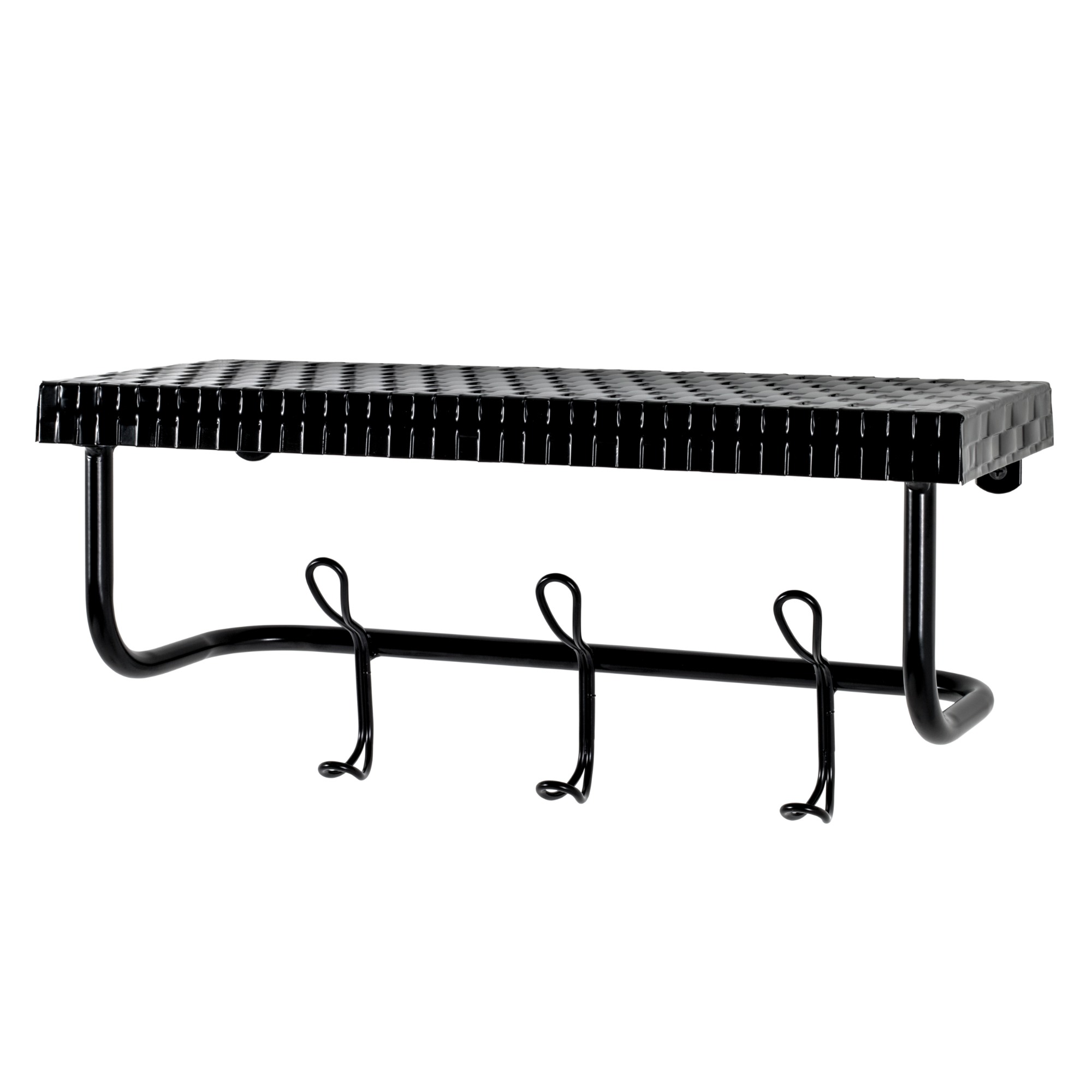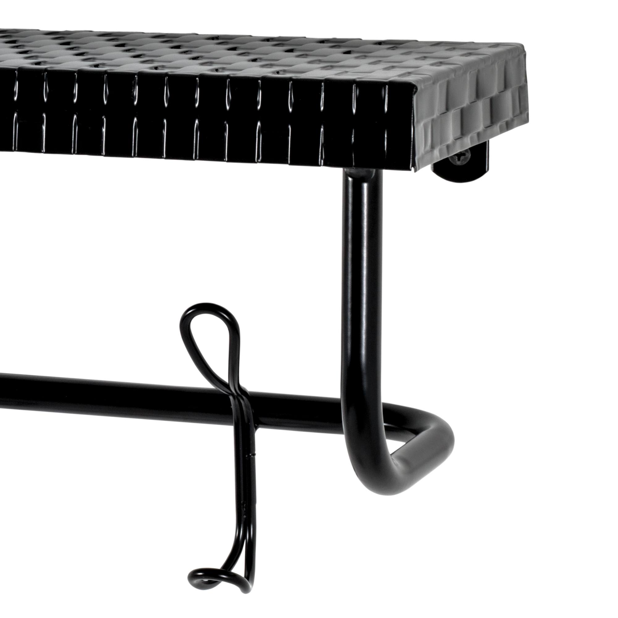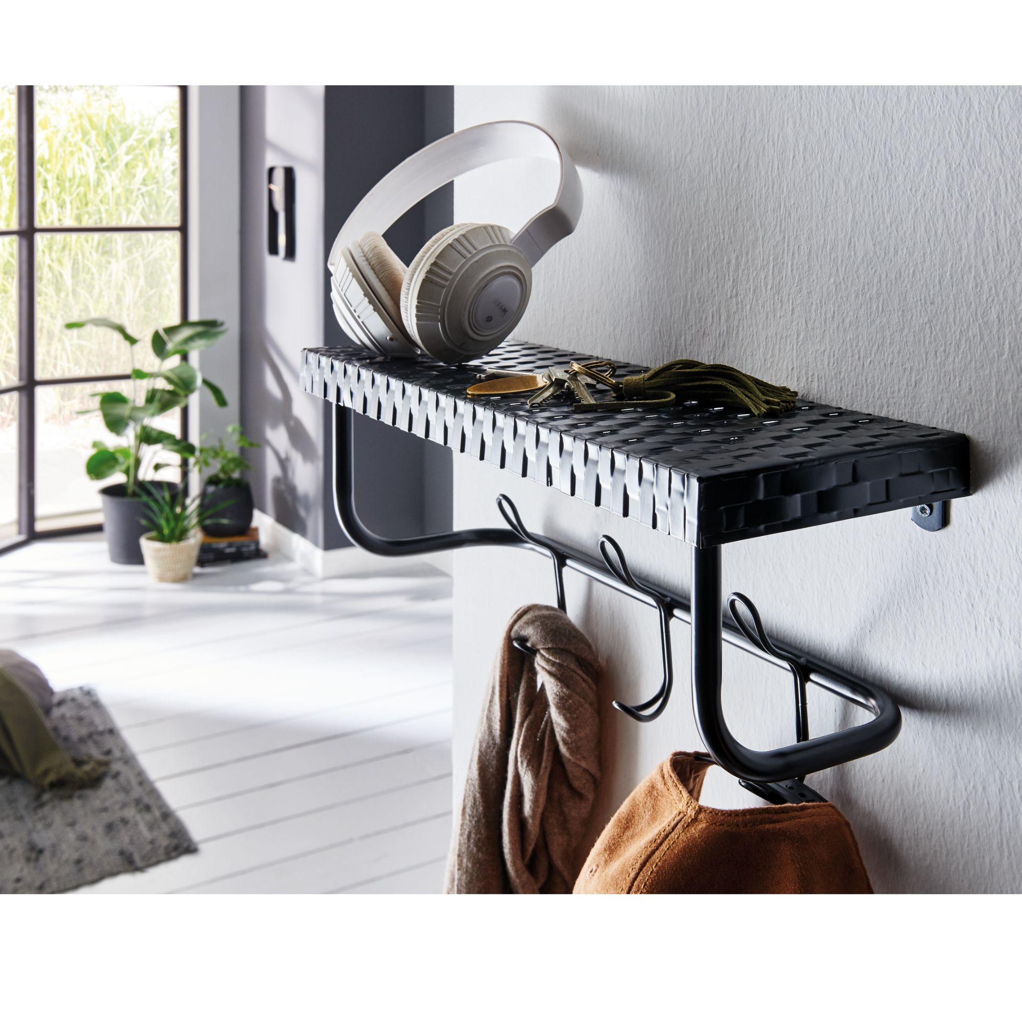 Věšák je vyroben z kovových trubek ošetřených matným lakem. Háčky poskytnout zázemí odloženým bundám i čepicím, poslouží i k zavěšení kabelky, nazouvací lžíce i vodítka pro psa. Horní police zase nabízí místo pro klíče nebo neroztříděnou poštu.