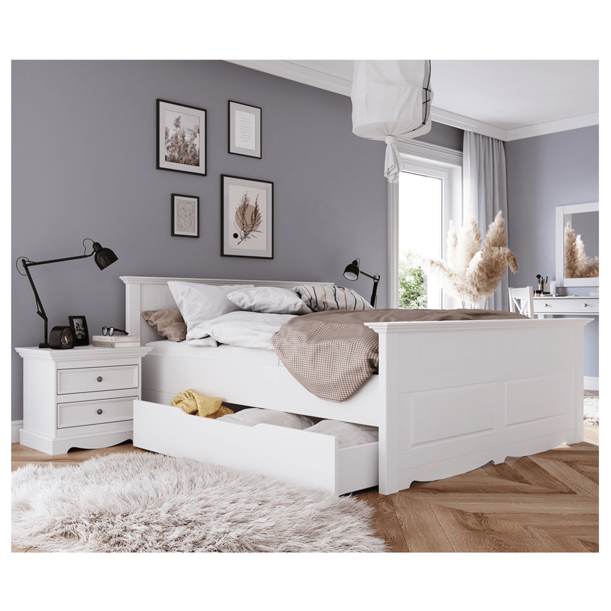 Vyroben je z masivního dřeva finské borovice, které dodává konstrukci potřebnou pevnost, odolnost a dlouhou životnost. I přes bílou barvu, která dodá místnosti čistý vzhled, je znát originální kresba dřeva. Dekorativní frézování předních ploch a zdobný pilastr dotváří celkový venkovský vzhled s romantickým nádechem. Stolek je vybaven 2 zásuvkami s tichým dovíráním a kovovými úchyty, které snadno nahmatáte i během noci. Vrchní odkládací deska se postará o předměty, které chcete mít po ruce těsně před spaním a i hned po probuzení.