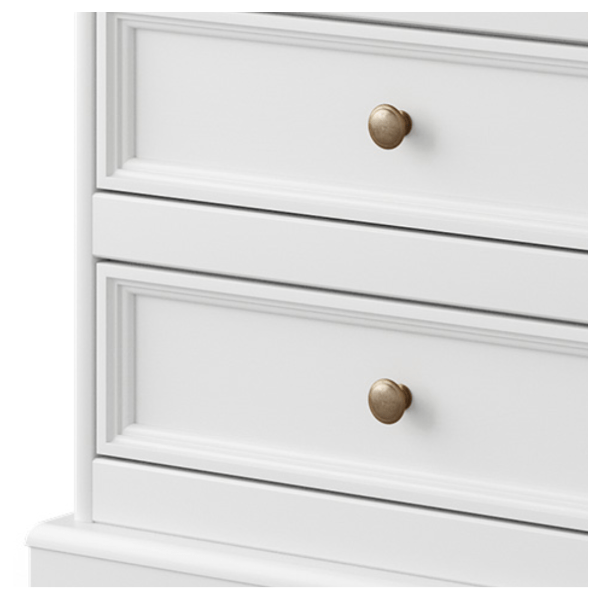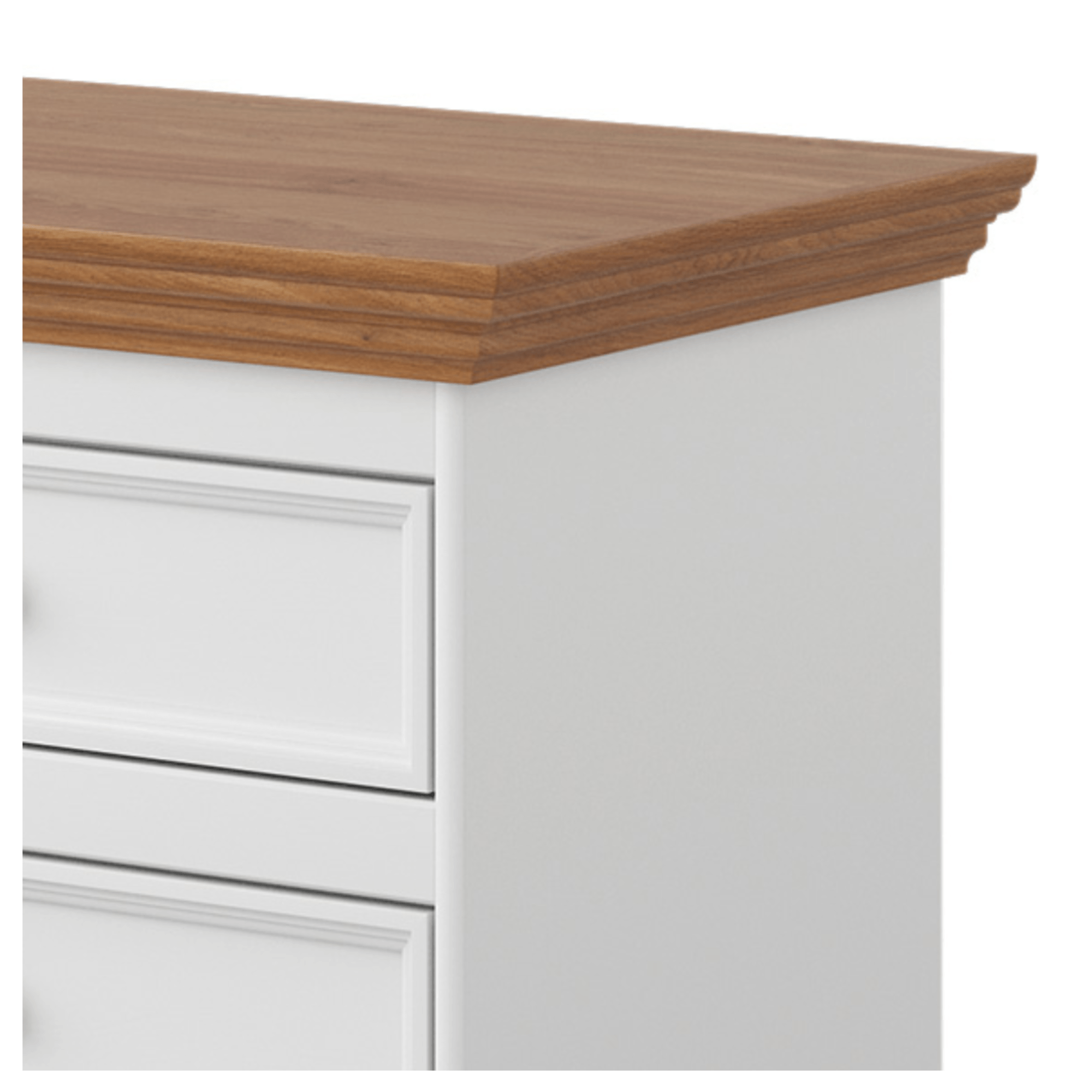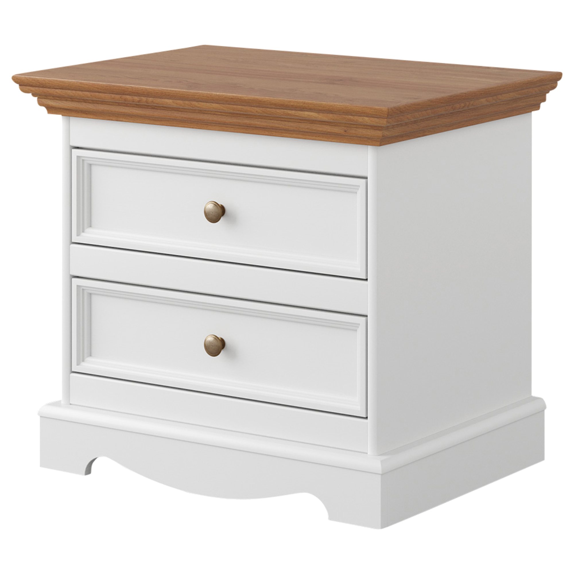 Vyroben je z masivního dřeva finské borovice, které dodává konstrukci potřebnou pevnost, odolnost a dlouhou životnost. I přes bílou barvu, která dodá místnosti čistý vzhled, je znát originální kresba dřeva. Dekorativní frézování předních ploch a zdobný pilastr dotváří celkový venkovský vzhled s romantickým nádechem. Stolek je vybaven 2 zásuvkami s tichým dovíráním a kovovými úchyty, které snadno nahmatáte i během noci. Vrchní odkládací deska se postará o předměty, které chcete mít po ruce těsně před spaním a i hned po probuzení.