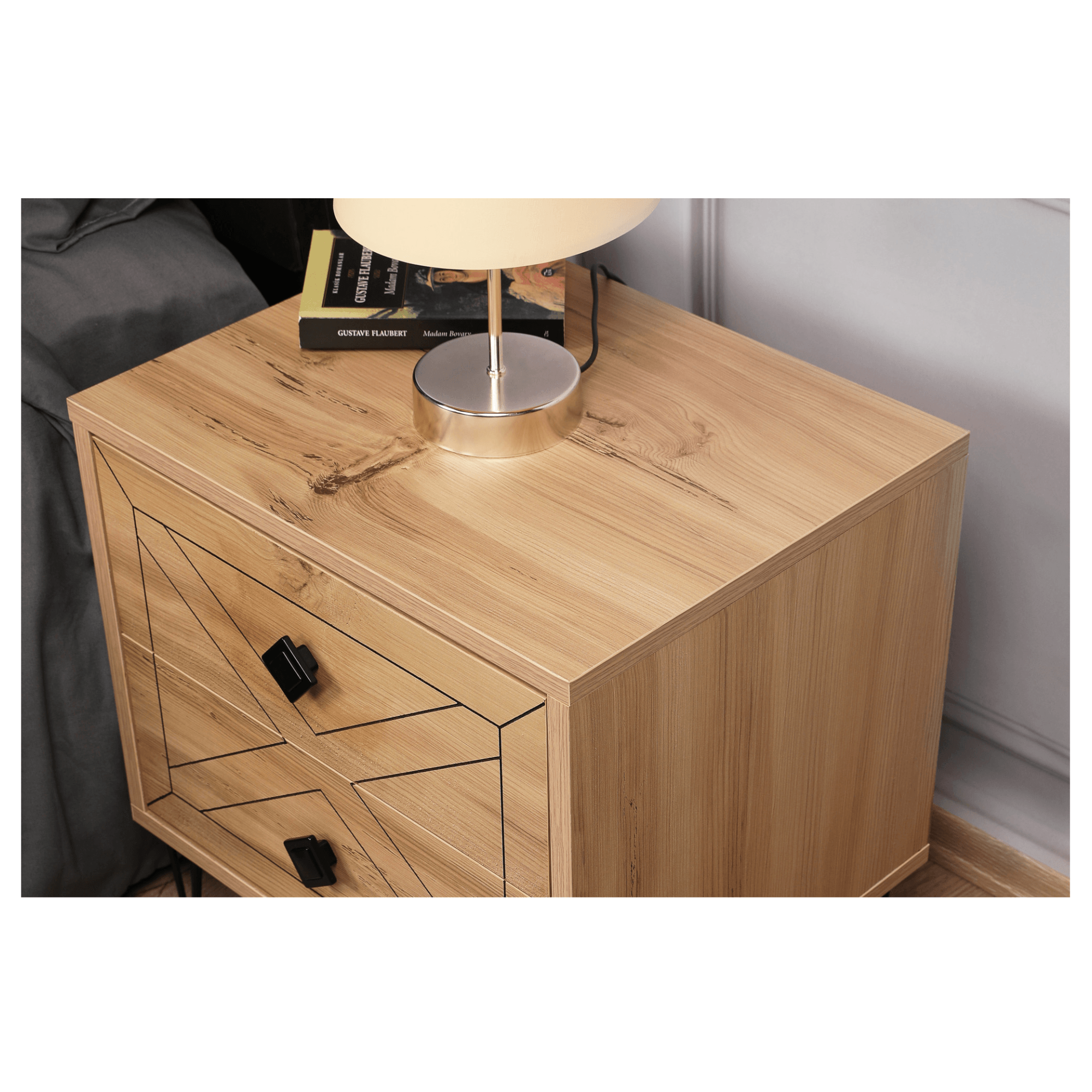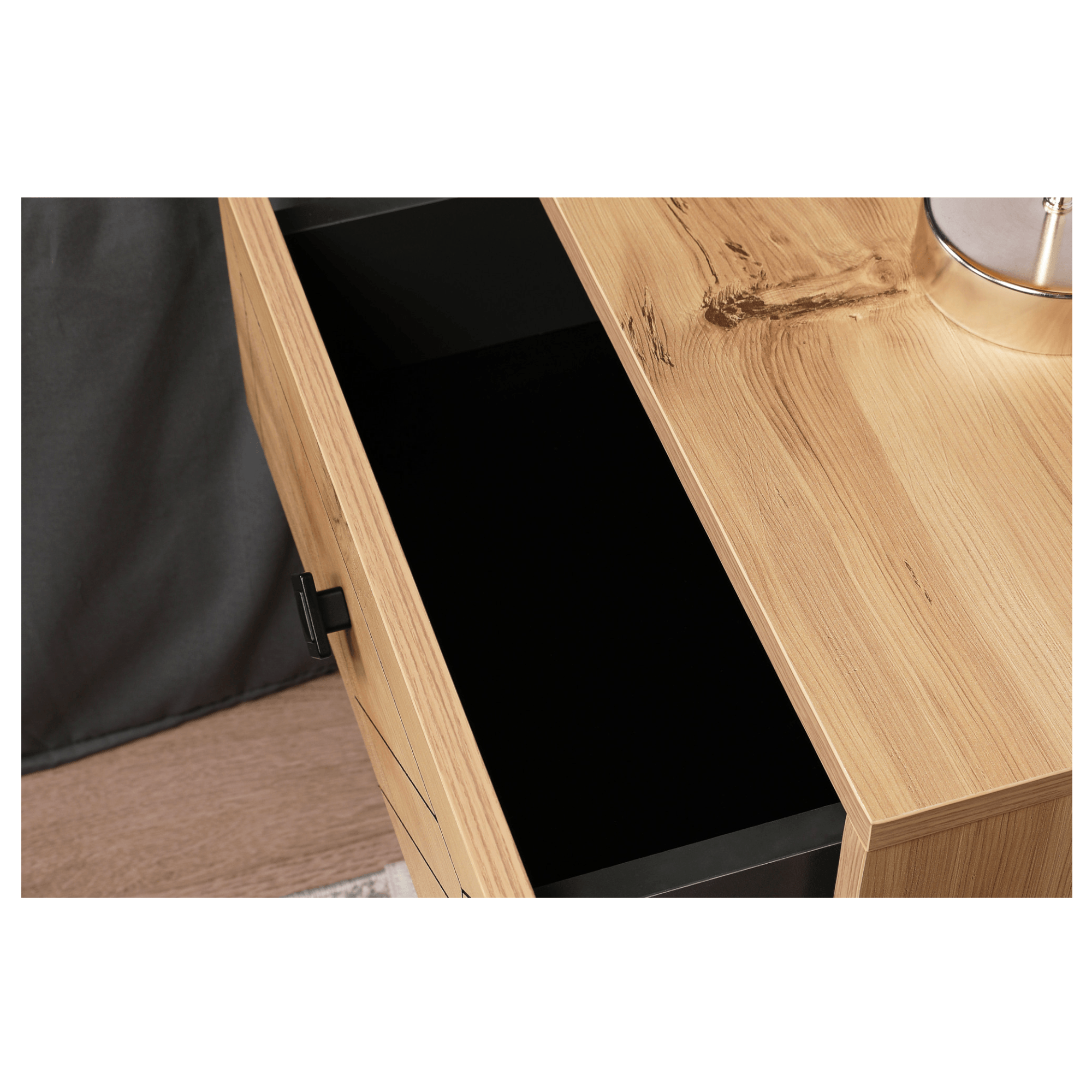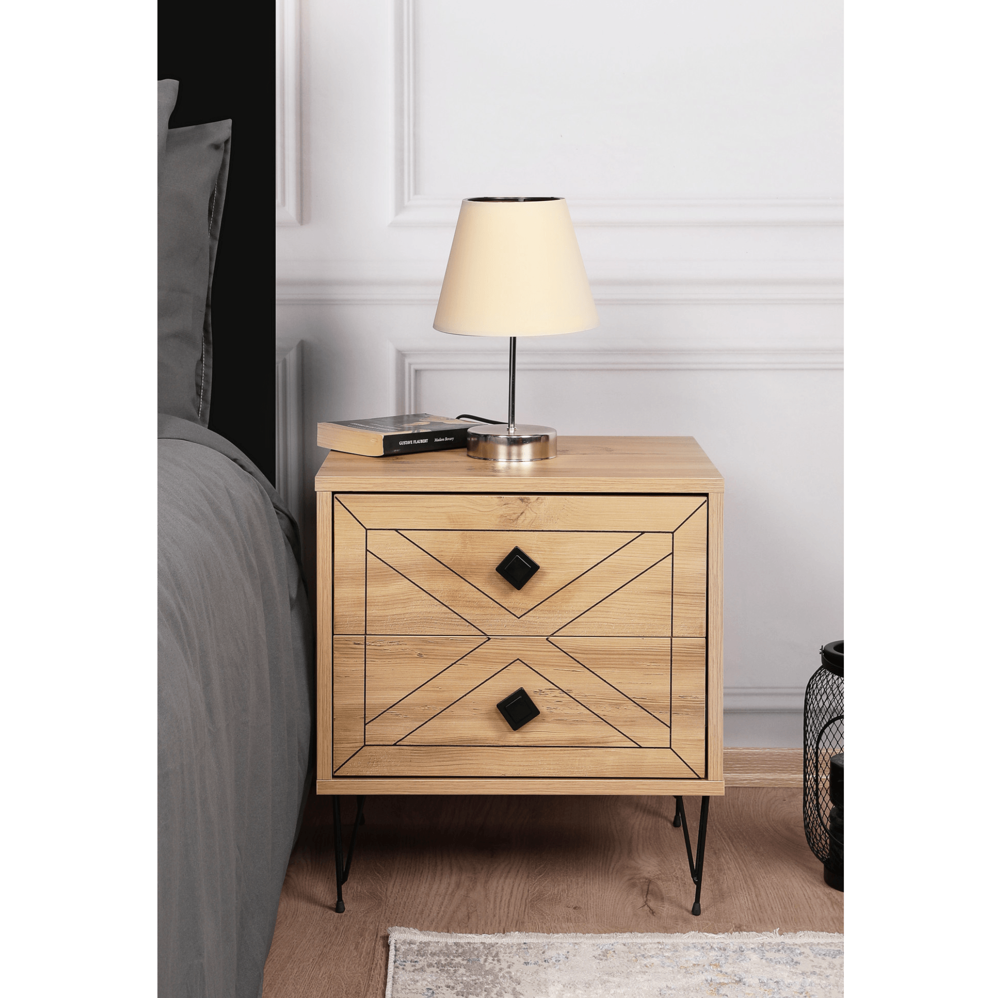 Součástí stolku jsou 2 zásuvky poskytující dostatek prostoru pro uložení všech nezbytností. Prostorné šuplíky doplňují kulaté kontrastní úchytky, které zajišťují snadnější manipulaci a přední plochy jsou zdobeny zajímavým designem. Díky vrchní odkládací desce už nebudete muset večer vstávat z postele kvůli odložení mobilního telefonu, knihy, brýlí a dalších drobností. Celkový dojem doplňují štíhlé kovové nožky. Díky jeho atraktivnímu provedení ho můžete využít také jako stylový, odkládací stolek v obývacím pokoji nebo v předsíni. Stolek je vyrobený z dřevěného materiálu potaženého melaminem.