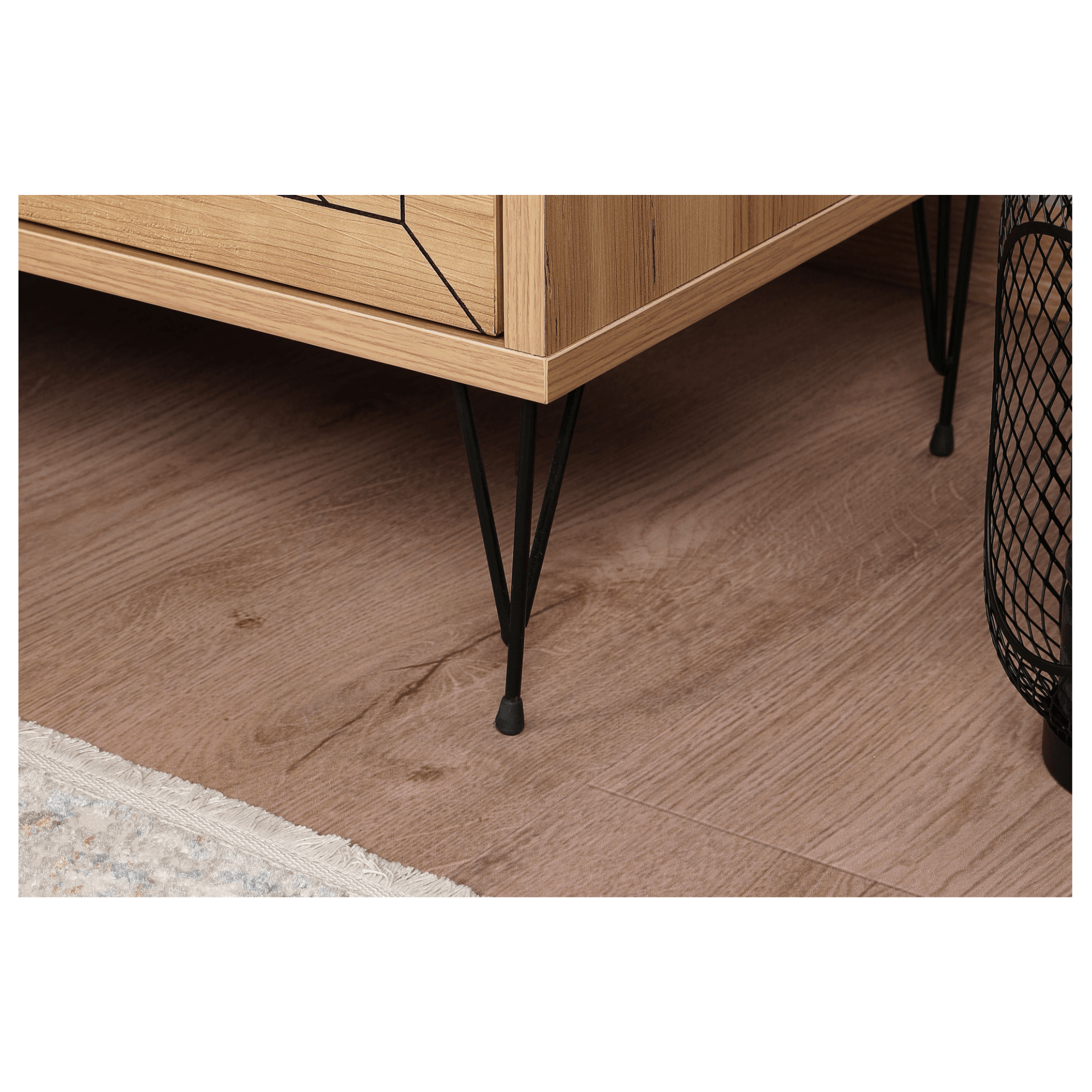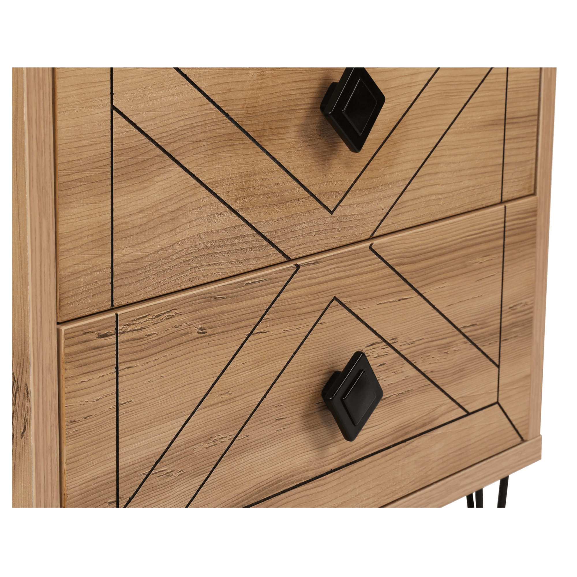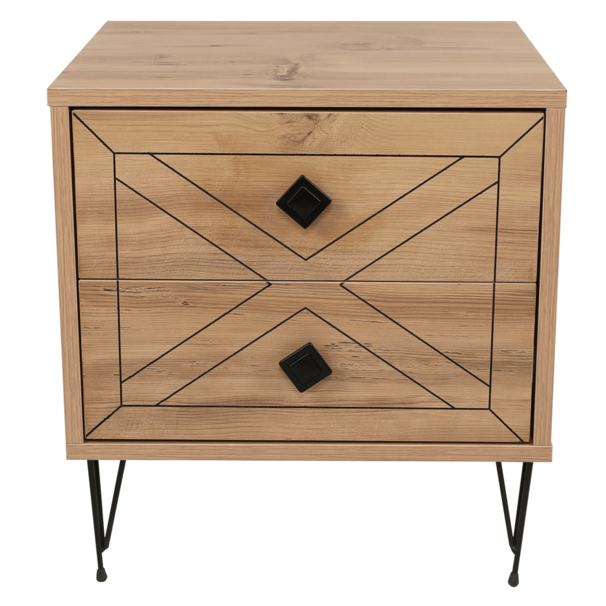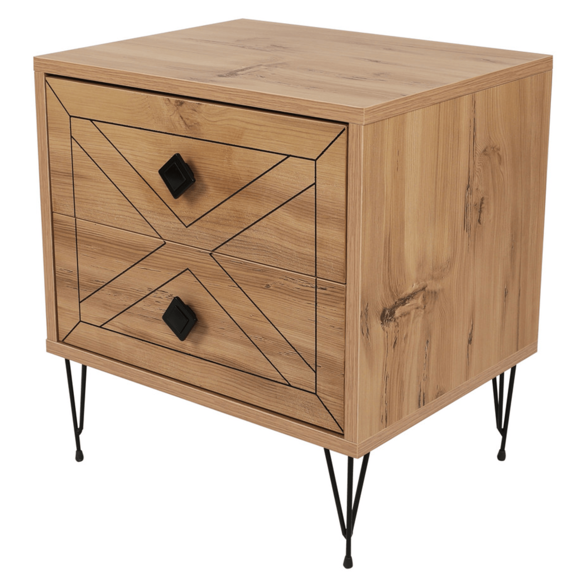 Součástí stolku jsou 2 zásuvky poskytující dostatek prostoru pro uložení všech nezbytností. Prostorné šuplíky doplňují kulaté kontrastní úchytky, které zajišťují snadnější manipulaci a přední plochy jsou zdobeny zajímavým designem. Díky vrchní odkládací desce už nebudete muset večer vstávat z postele kvůli odložení mobilního telefonu, knihy, brýlí a dalších drobností. Celkový dojem doplňují štíhlé kovové nožky. Díky jeho atraktivnímu provedení ho můžete využít také jako stylový, odkládací stolek v obývacím pokoji nebo v předsíni. Stolek je vyrobený z dřevěného materiálu potaženého melaminem.