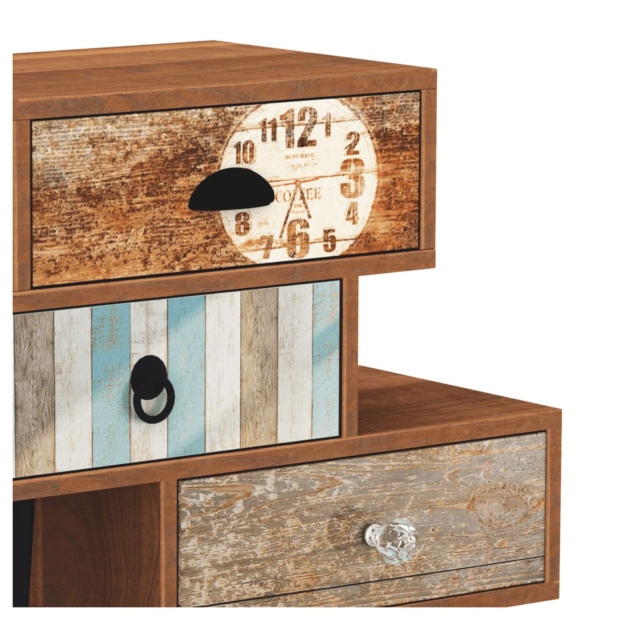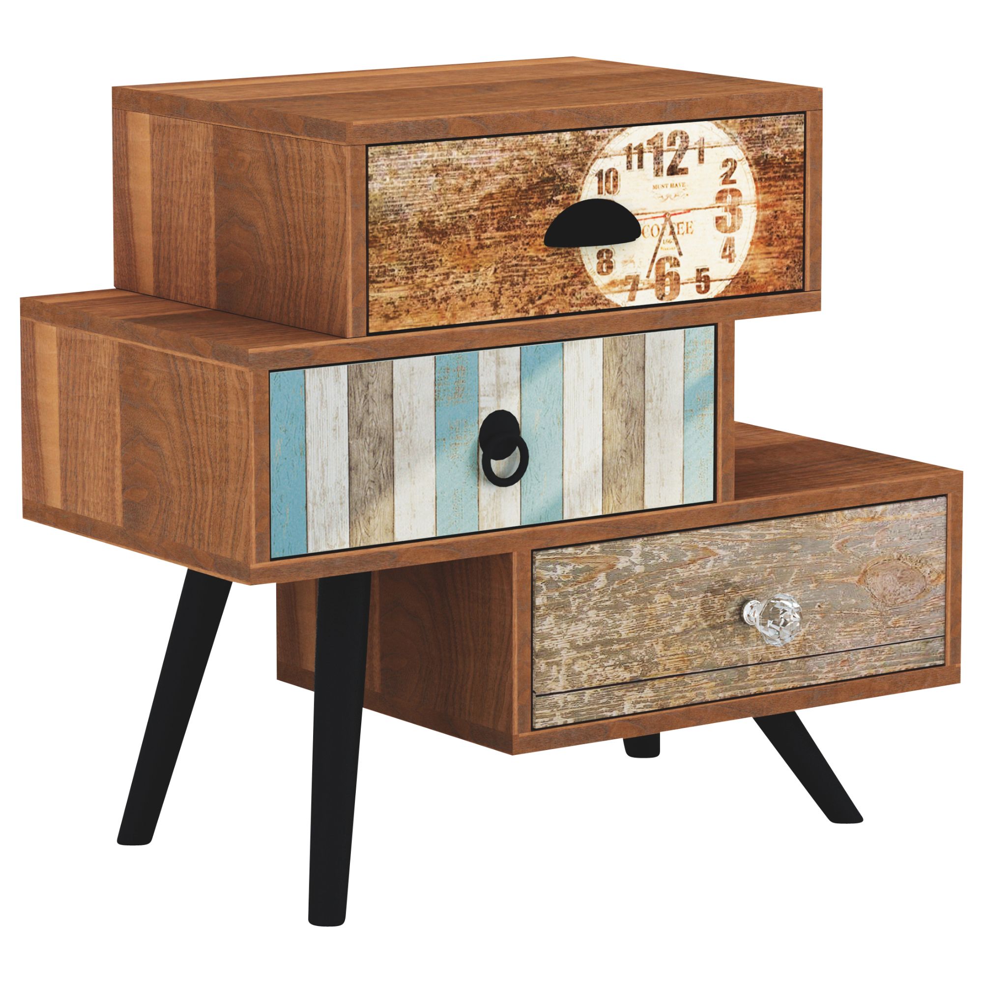Obsahuje celkem 3 praktické zásuvky v různých barvách, které nabízí dostatek místa pro uložení všech nezbytností, které chcete během večer i rána při ruce. Odlišně řešené úchyty zajišťují snadnou každodenní manipulaci. Díky vrchní odkládací desce už nebudete muset večer vstávat z postele kvůli odložení mobilního telefonu, knihy, brýlí a dalších drobností. Celý stolek podpírají kónické nohy z práškově lakovaného kovu. Konstrukce je vyrobena z laminovaného dřevěného materiálu nenáročného na údržbu.