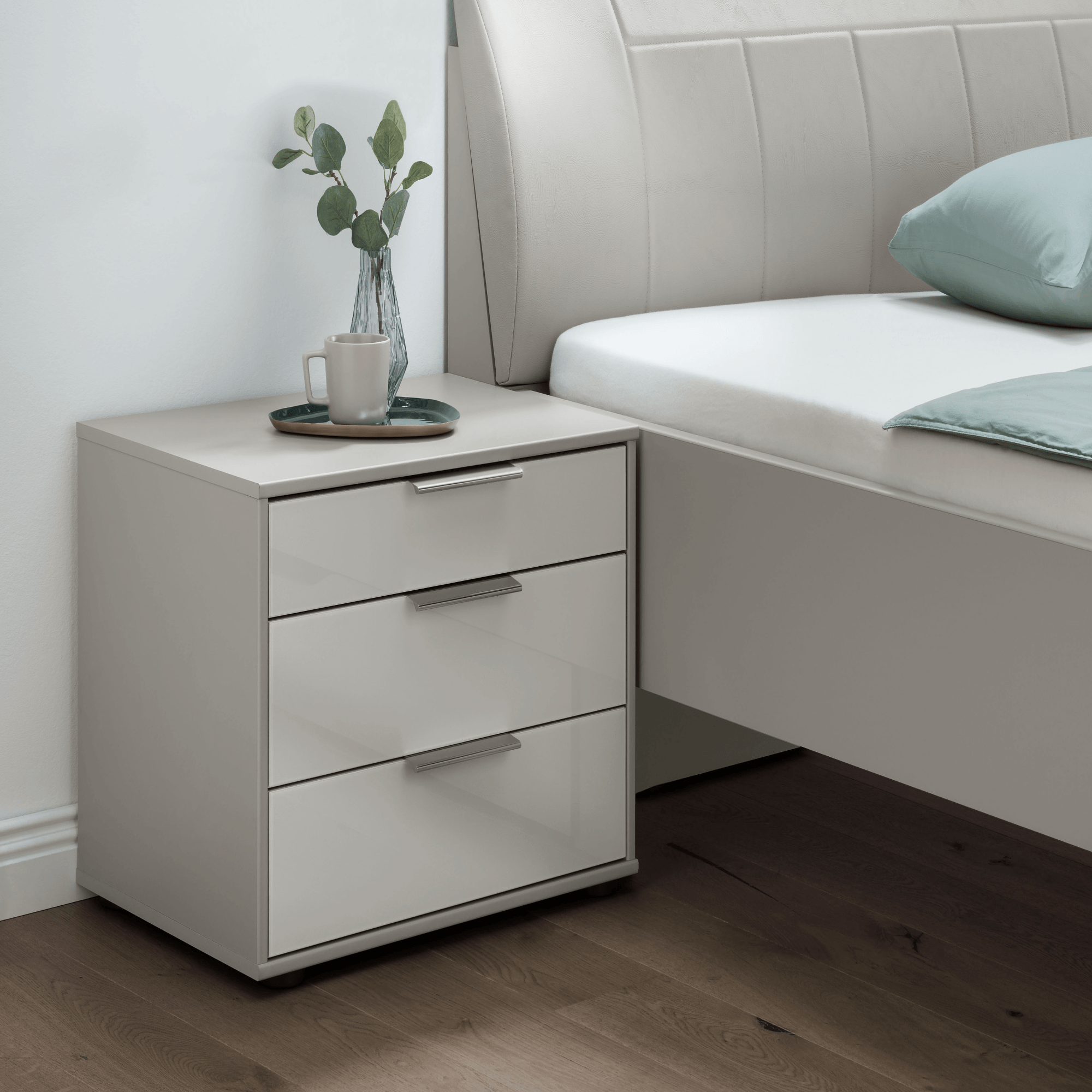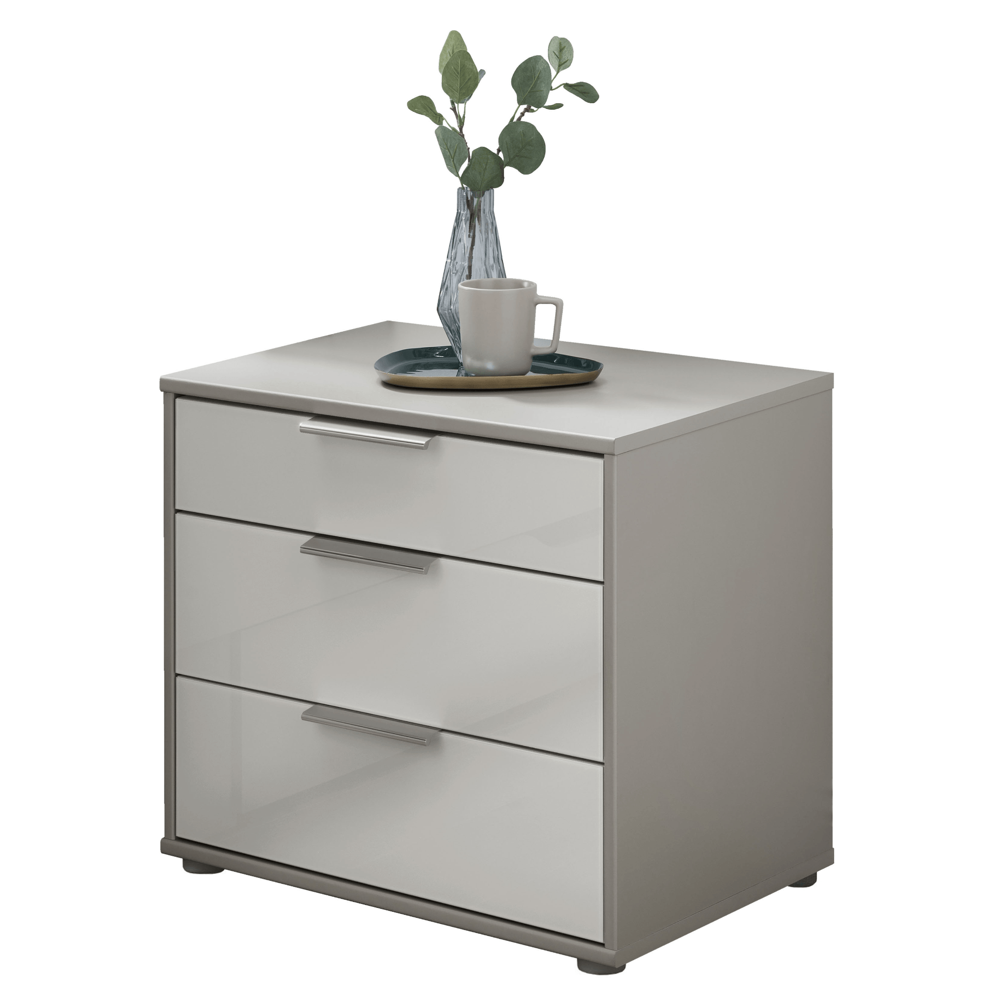 Stolek obsahuje 3 prostorné zásuvky poskytující dostatek místa pro uložení všeho, co chcete mít i během pozdního večera či brzkého rána při ruce. Povrch předních částí je potažen skleněnou vrstvou, která vytváří elegantní vzhled ve vysokém lesku. Zásuvky jsou doplněny o praktické chromové úchyty zajišťující snadnější manipulaci, které snadno nahmatáte i po tmě. Díky vrchní odkládací desce už nebudete muset večer vstávat z postele kvůli odložení mobilního telefonu, rozečtené knihy, brýlí a dalších drobností. Celkový dojem doplňuje čtveřice drobných nohou. Stolek je vyrobený z laminovaného dřevěného materiálu.