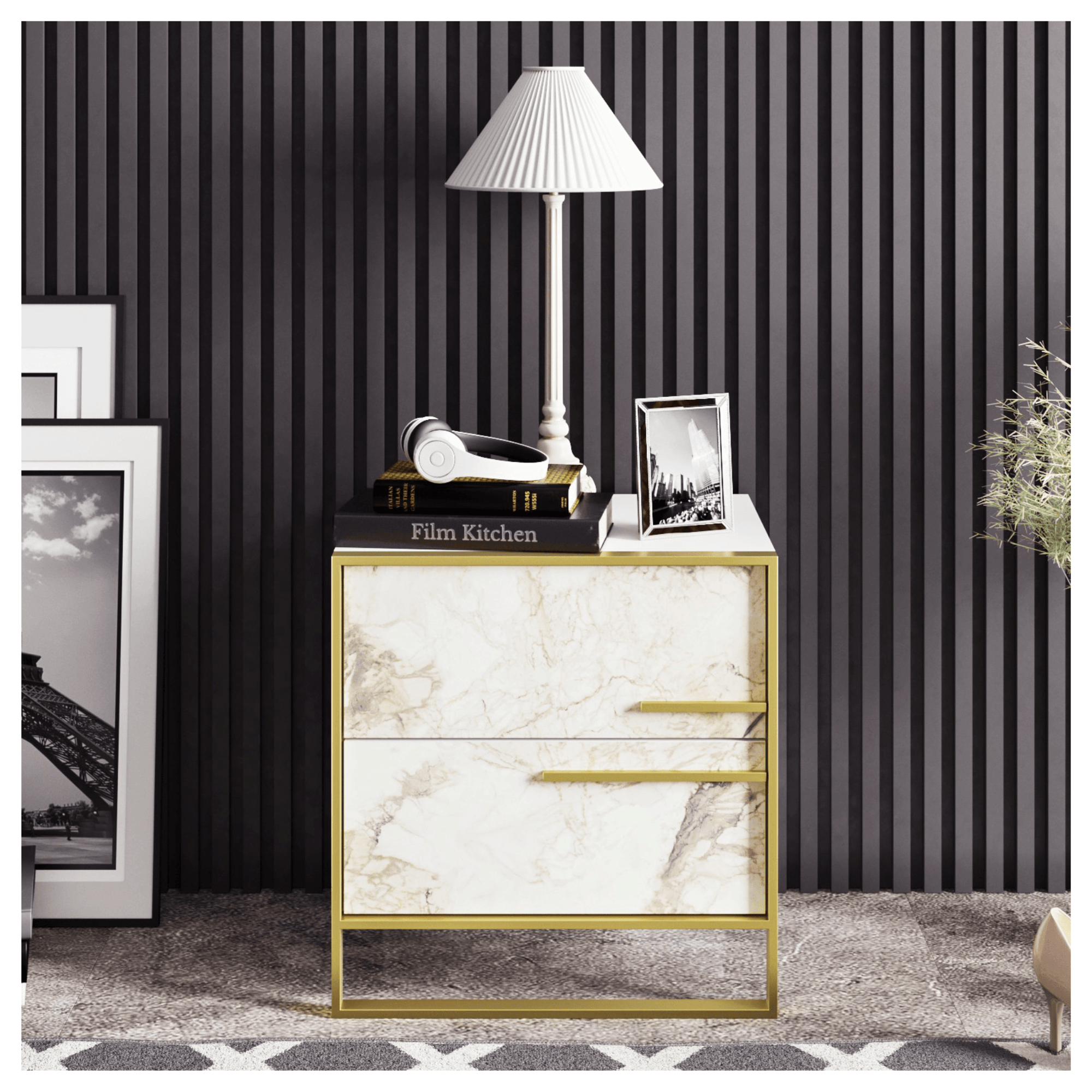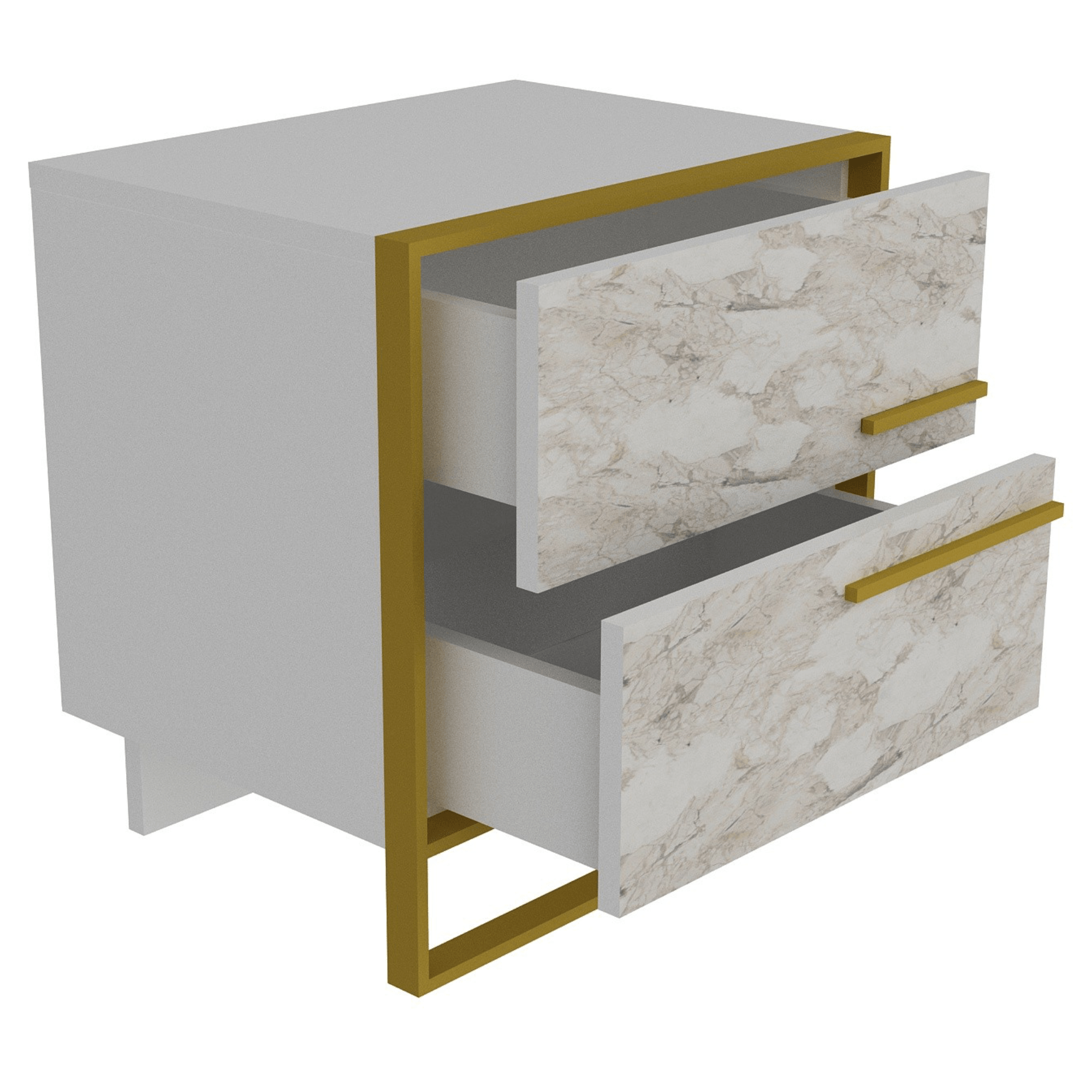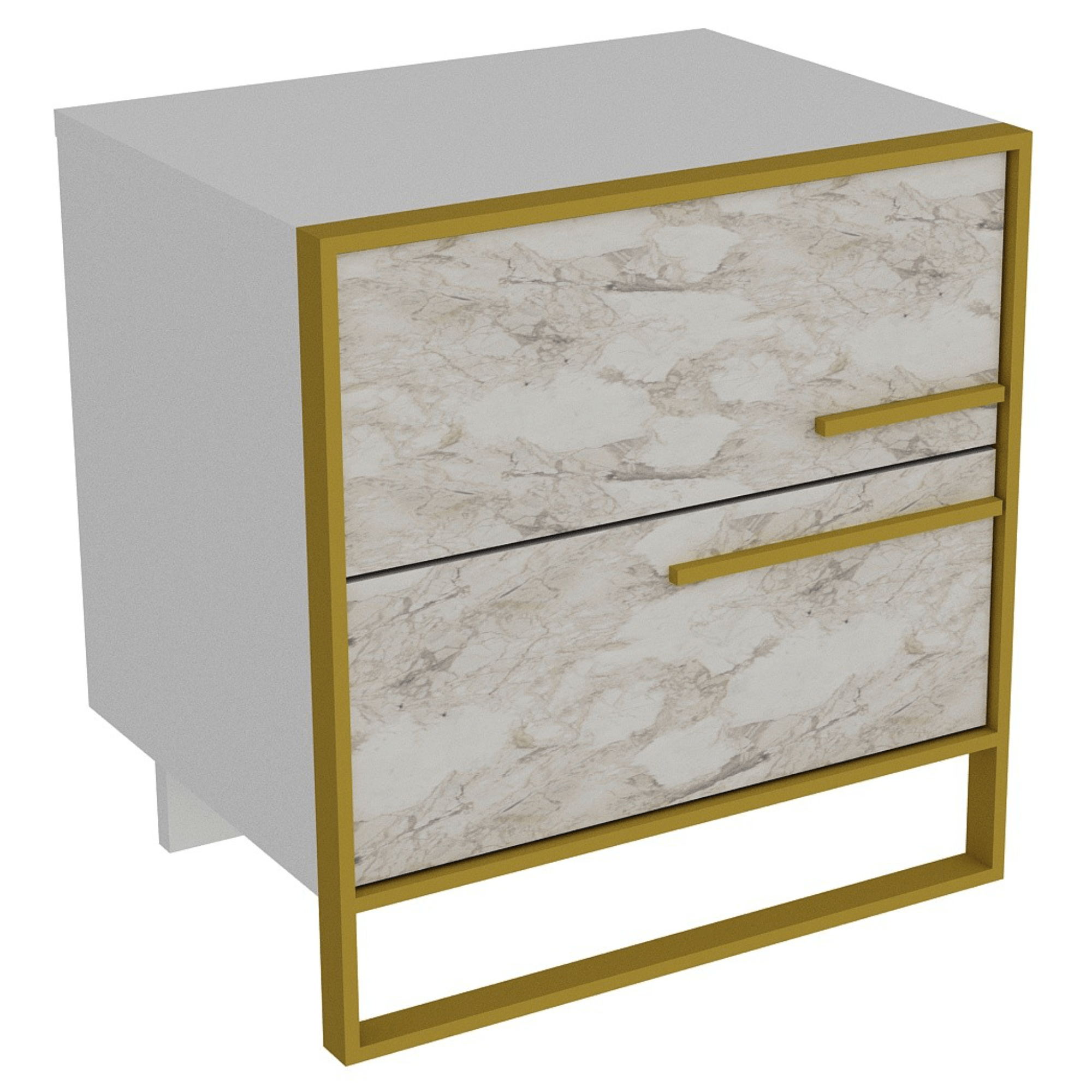 Disponuje 2 zásuvkami, které vám poskytnou dostatek místa pro odložení všech nezbytností. Zásuvky jsou opatřeny úchytkami ve zlaté barvě, které vám usnadní manipulaci. Přední plochy jsou vyhotoveny v dekoru bílého mramoru. Díky vrchní odkládací desce už nebudete muset večer vstávat z postele kvůli odložení mobilního telefonu, knihy, brýlí a dalších drobností. Noční stolek je vyroben z laminovaného dřevěného materiálu, který se vyznačuje snadnou údržbou. V přední části stolek podpírá zajímavě řešená, kovová noha.