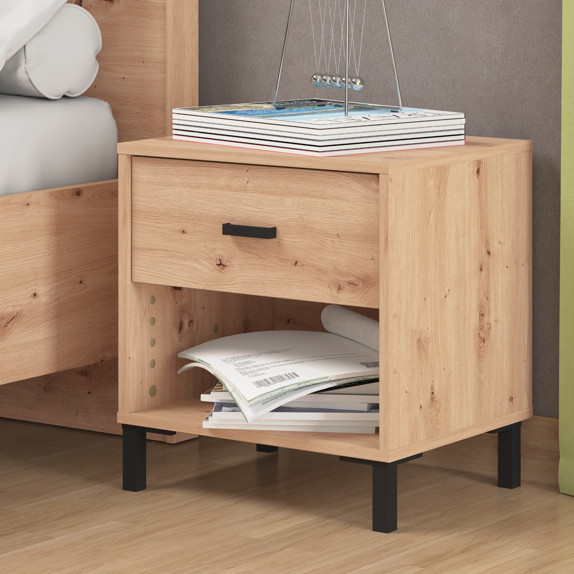 Na nočním stolku RELIA oceníte i dostatek úložného prostoru. Kromě horní desky, na kterou můžete umístit lampu i budík, je jeho součástí i 1 zásuvka. Pro snadnější manipulaci je zásuvka vybavena praktickým úchytem.