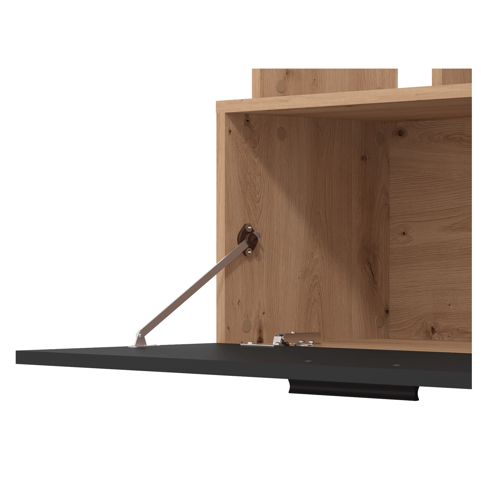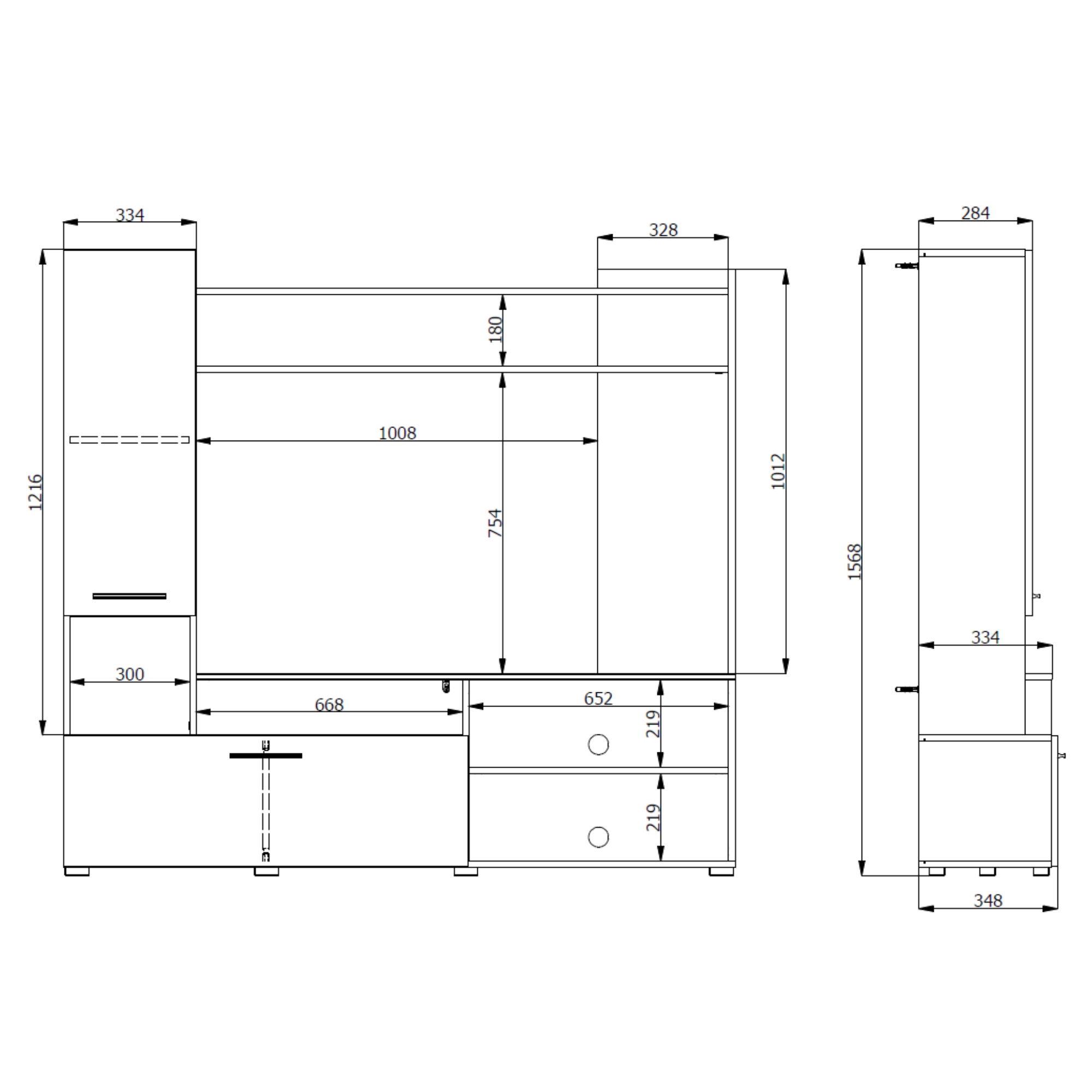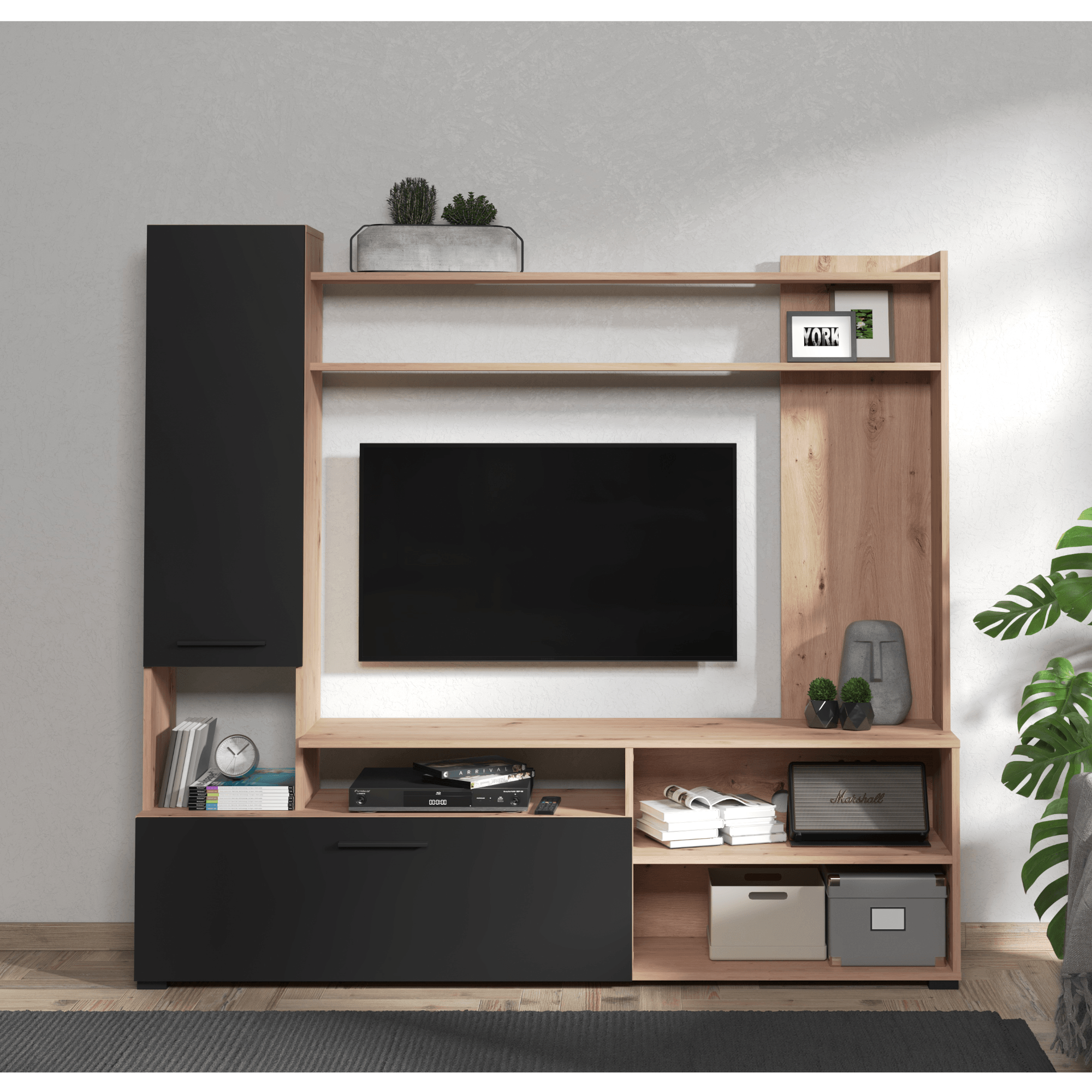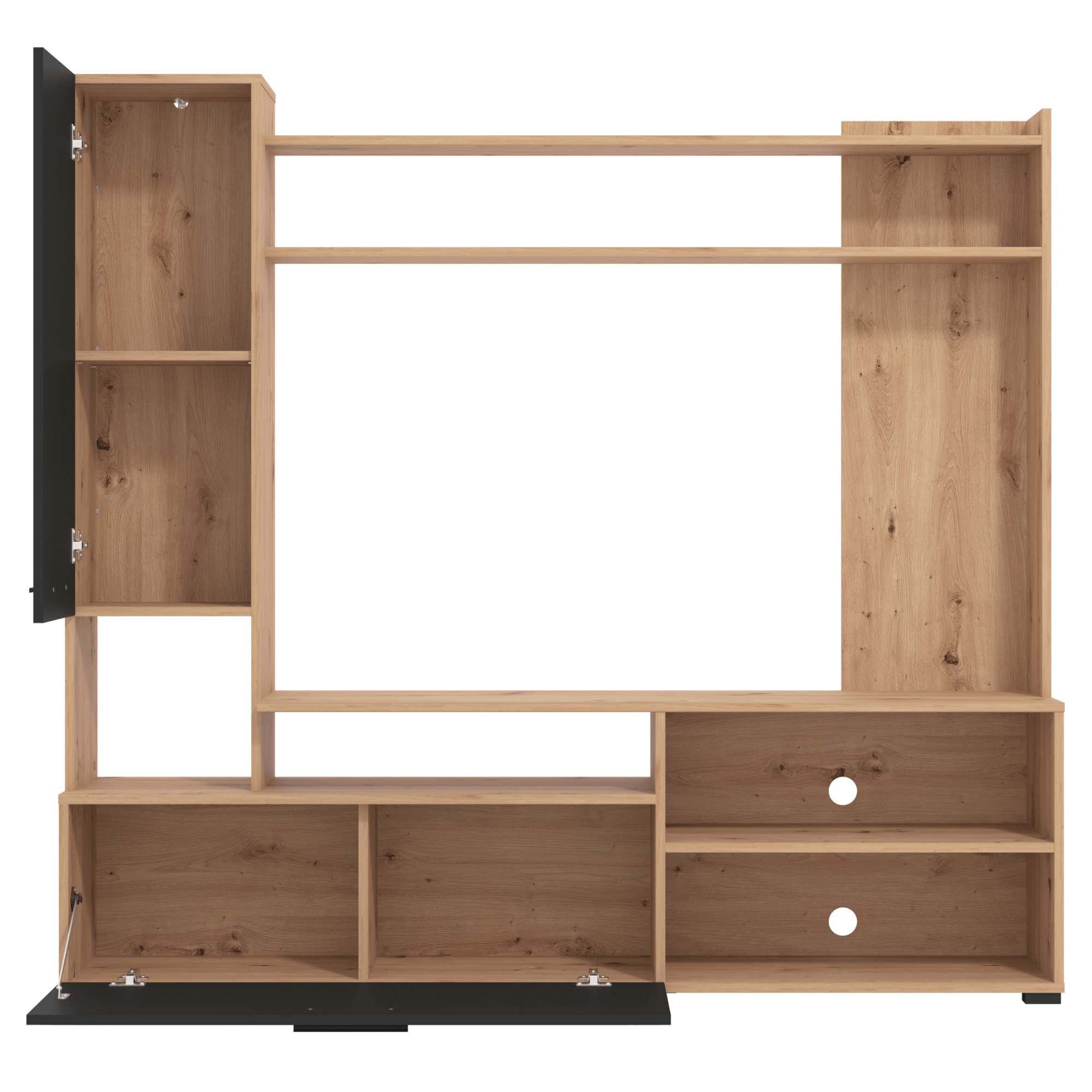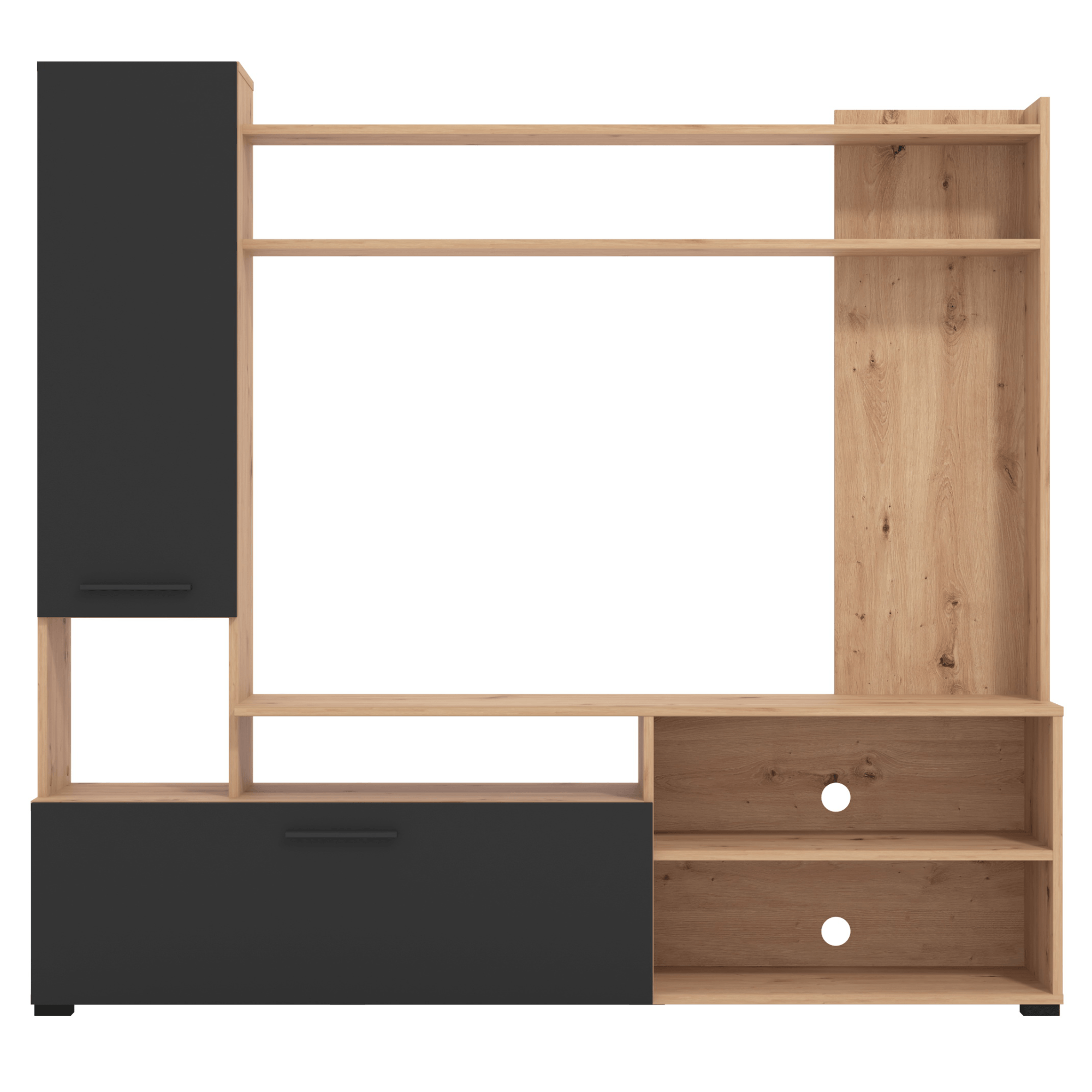 Nejdůležitější částí je TV komoda ve spodní části. Ta prakticky kombinuje otevřené i uzavíratelné prostory, kam bez problému uložíte veškeré TV příslušenství. Na levé straně na komodu navazuje regál s jednou vloženou policí, která prakticky rozděluje velký vnitřní prostor. Otočná dvířka regálu a výklopná dvířka komody jsou doplněny o praktické úchytky ve stejné barvě jako dvířka. Mezi komodou a vysokým regálem se nachází otevřená odkládací mezera. Horní části stěny dominuje dvojitá nástěnná police, která je ideální pro vystavení fotografií, suvenýrů z cest, rostlin a dalších dekorativních prvků. Stěnu nelze volně rozestavět do prostoru, jelikož je tvořena celistvým blokem s funkcemi.