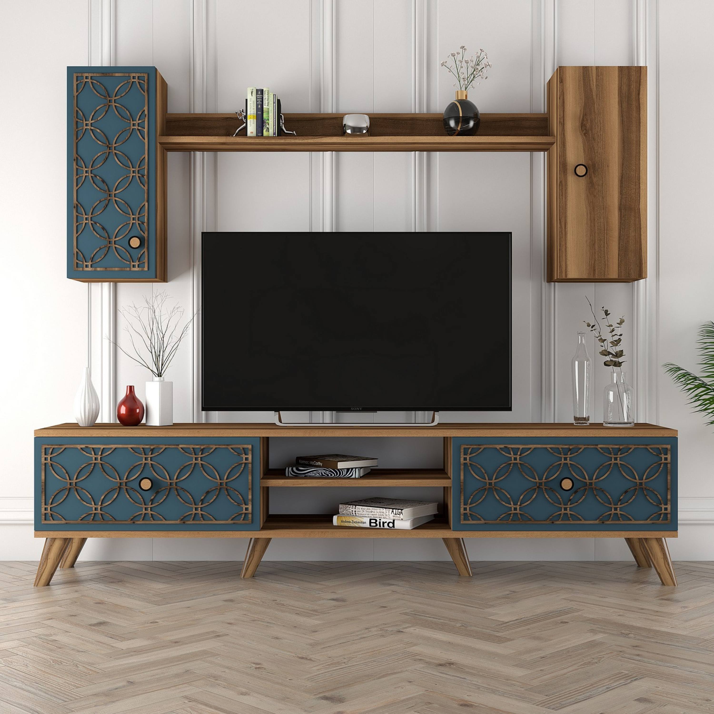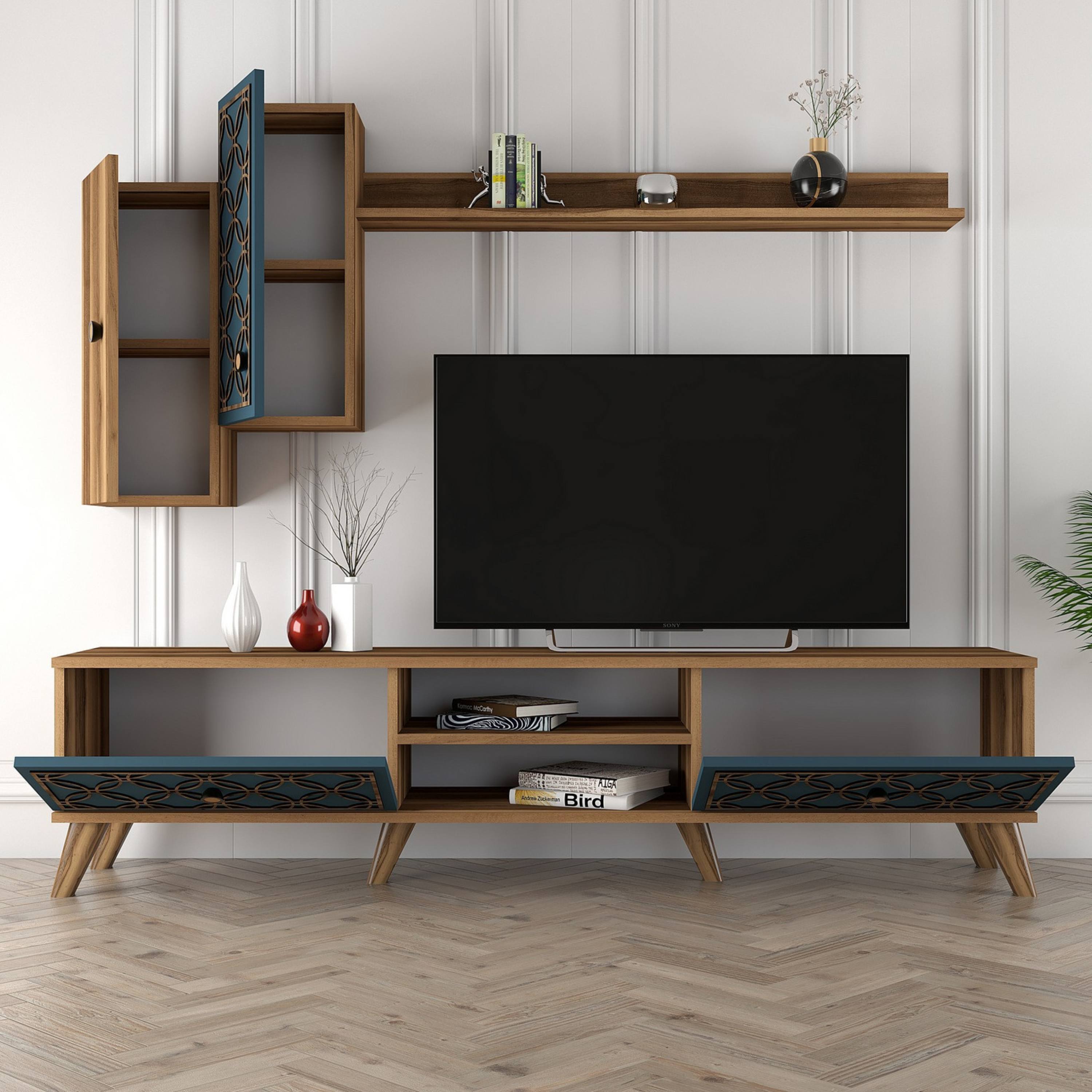 Obývací stěna CLASS 2 představuje komplexní řešení funkčního nábytku do obývacího pokoje. Kombinace dekoru ořechu a odstínu modré barvy vnese do vašeho obývacího pokoje přírodní nádech.