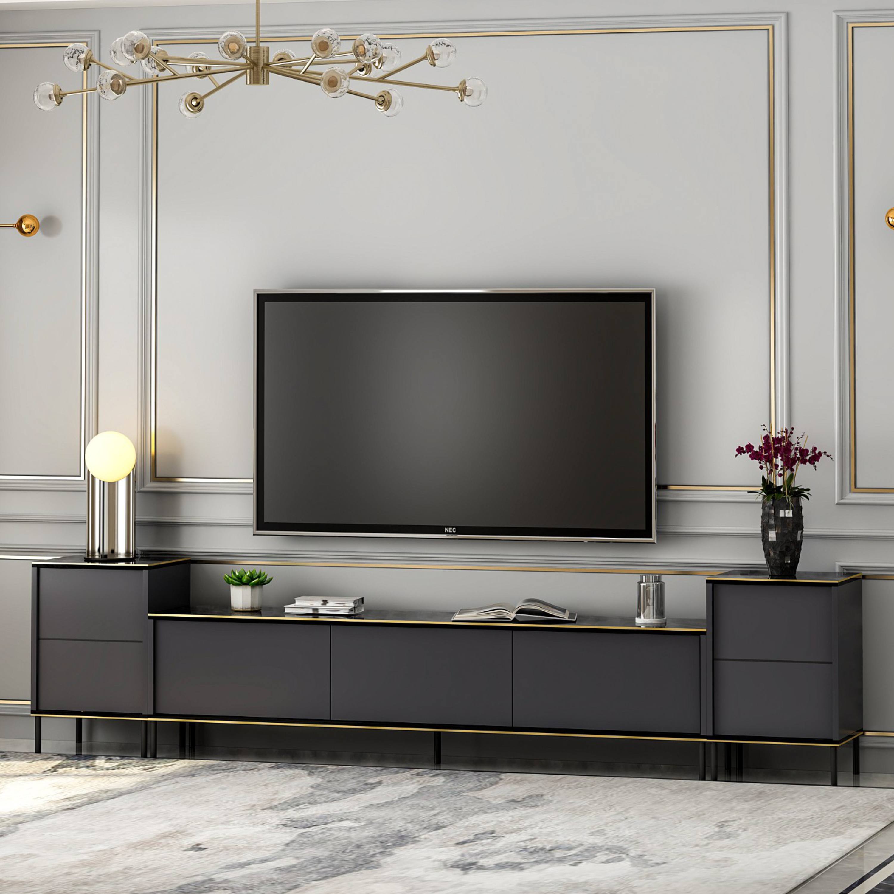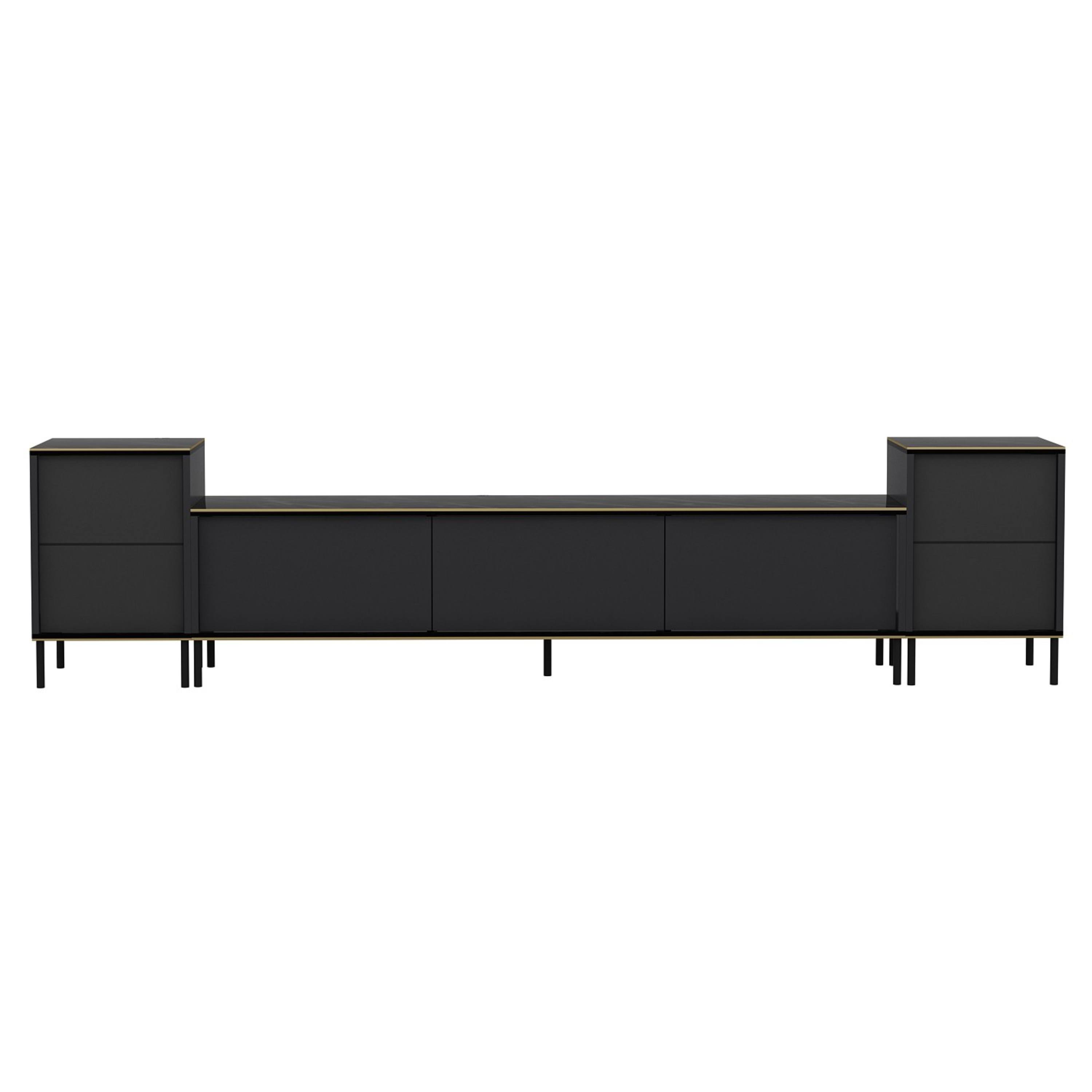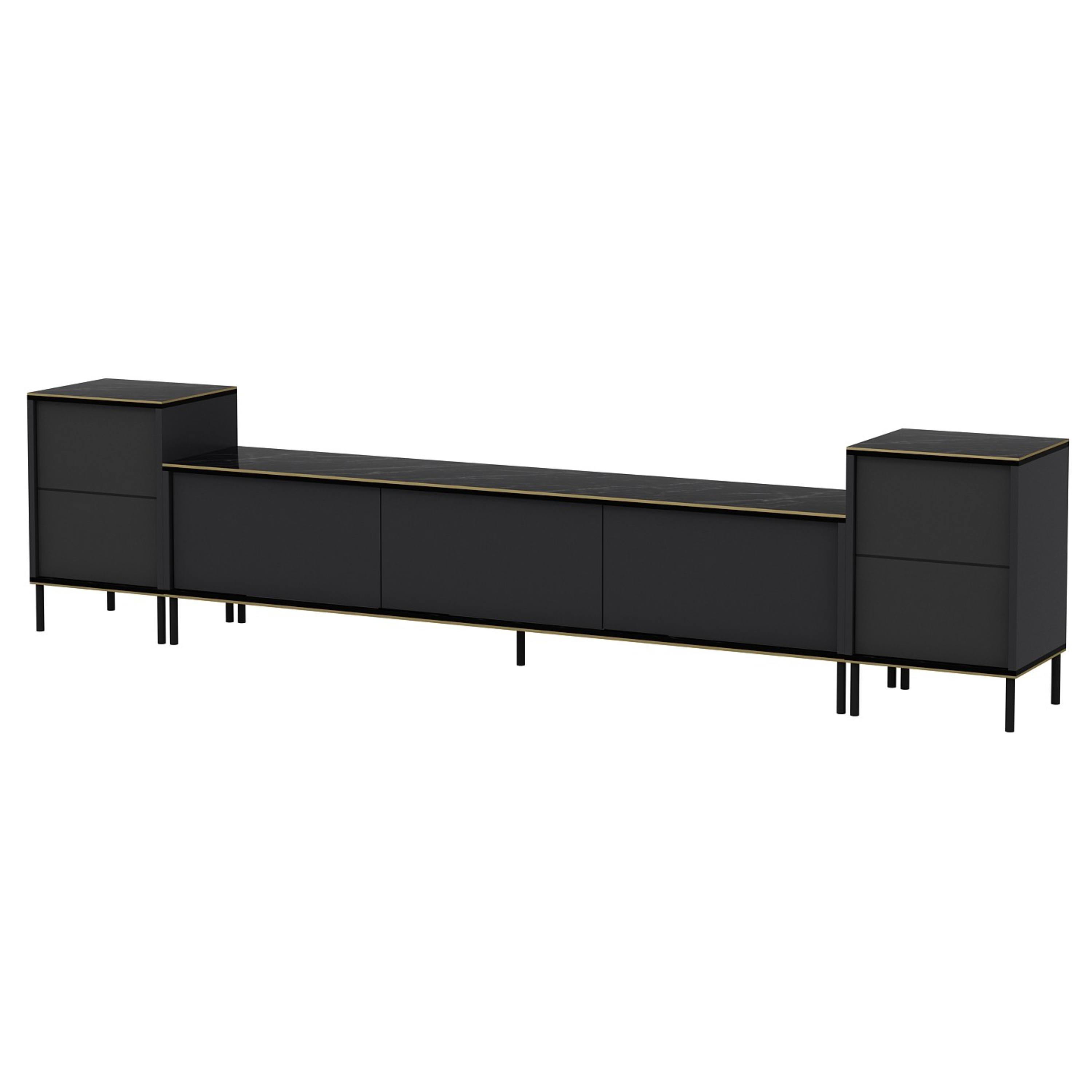 Hlavním prvkem je široká TV komoda disponující množstvím uzavíratelného, úložného prostoru, kam ukryjete nejen TV příslušenství, ale i další nezbytnosti. Uzavírají ji 3 výklopné dveře, které umožňují naplno využít vnitřní prostor. Komodu doplňují 2 malé skříňky, kdy každá z nich je vybavena vloženou policí za otočnými dveřmi. Set je vyroben z laminované dřevotřísky s povrchem nenáročným na údržbu.