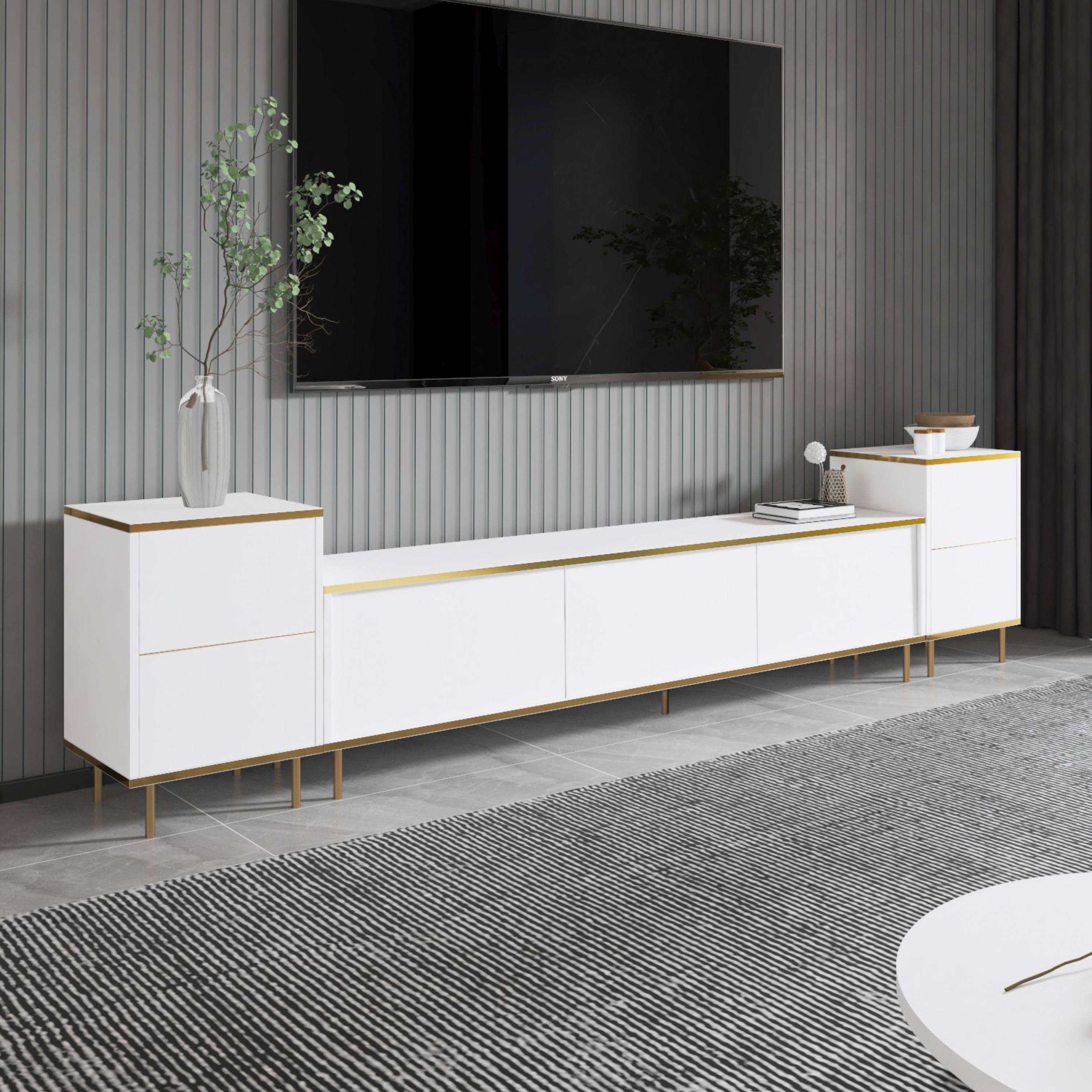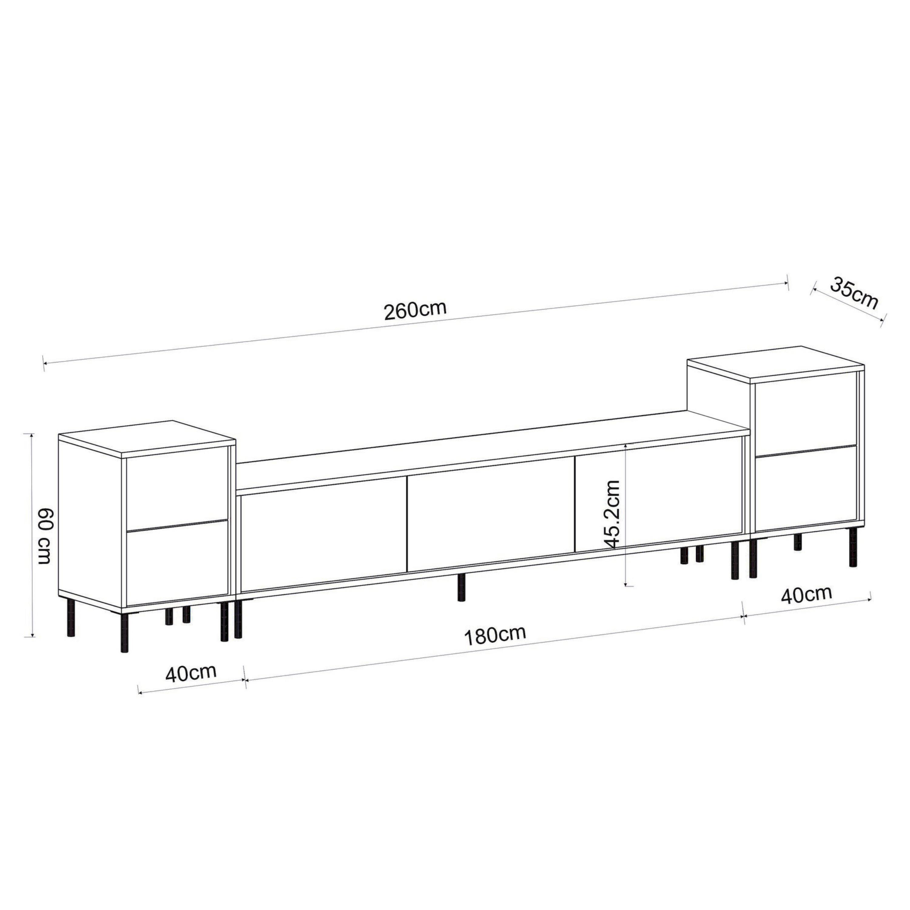 Hlavním prvkem je široká TV komoda disponující množstvím uzavíratelného, úložného prostoru, kam ukryjete nejen TV příslušenství, ale i další nezbytnosti. Uzavírají ji 3 výklopné dveře, které umožňují naplno využít vnitřní prostor. Komodu doplňují 2 malé skříňky, kdy každá z nich je vybavena vloženou policí za otočnými dveřmi. Set je vyroben z laminované dřevotřísky s povrchem nenáročným na údržbu.