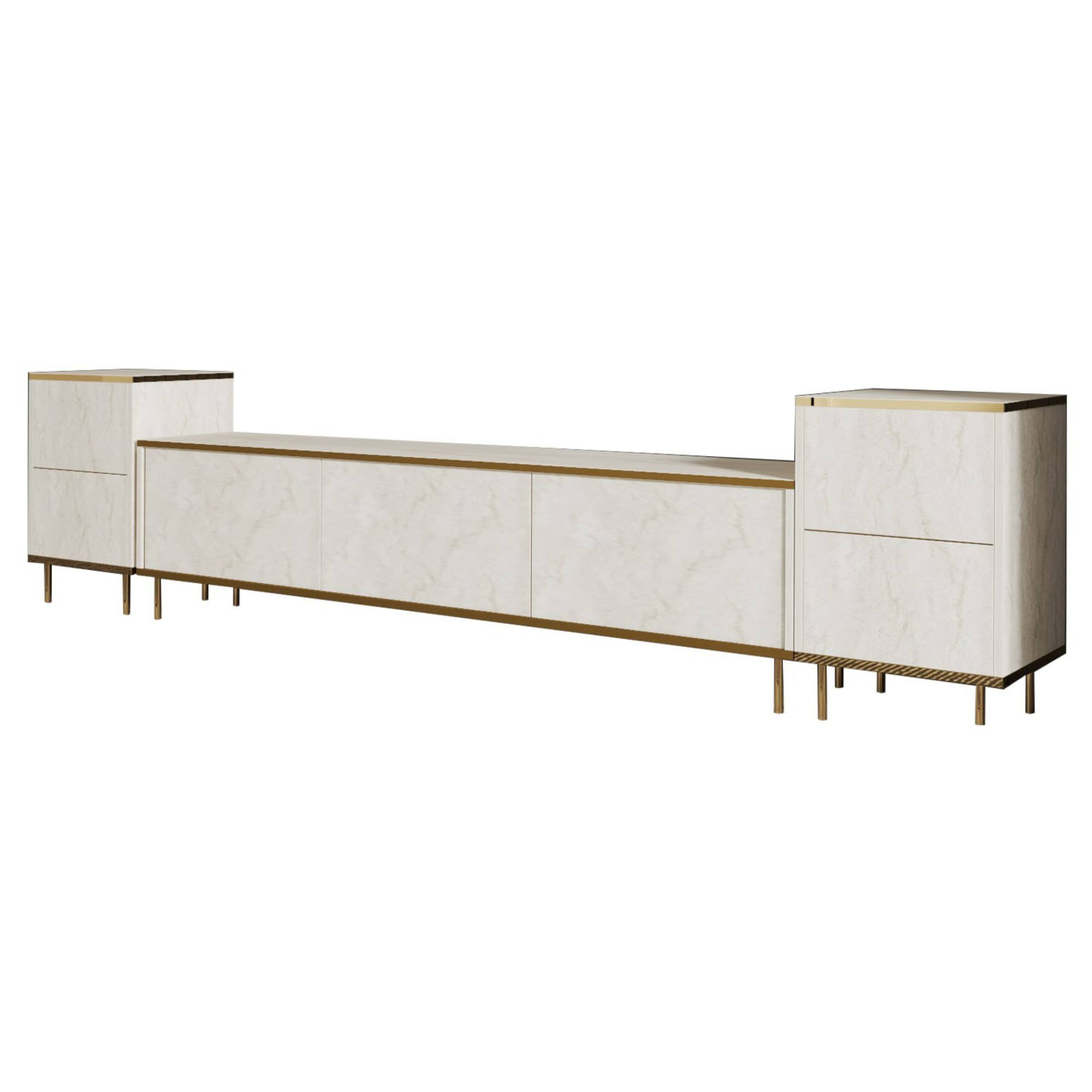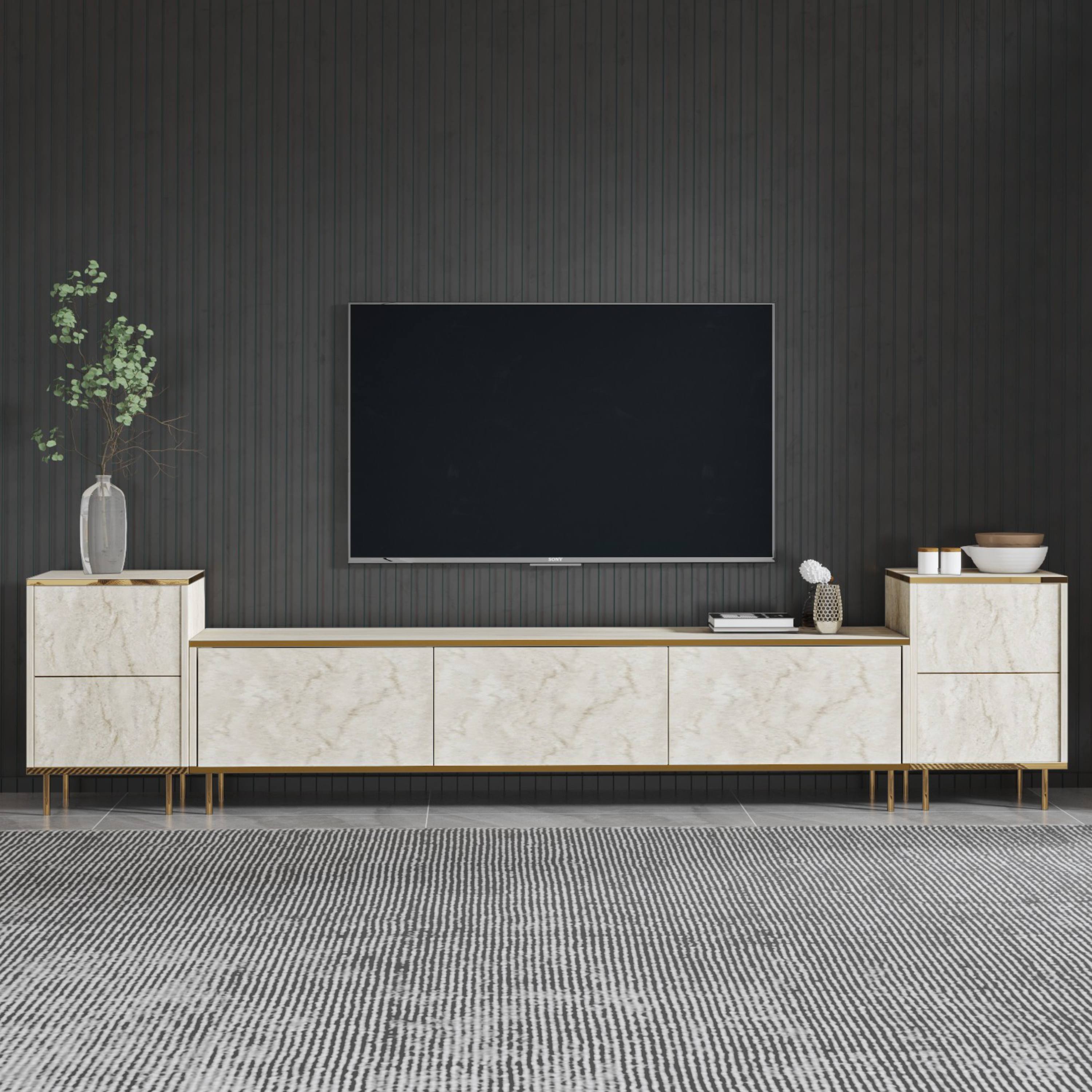 Hlavním prvkem je široká TV komoda disponující množstvím uzavíratelného, úložného prostoru, kam ukryjete nejen TV příslušenství, ale i další nezbytnosti. Uzavírají ji 3 výklopné dveře, které umožňují naplno využít vnitřní prostor. Komodu doplňují 2 malé skříňky, kdy každá z nich je vybavena vloženou policí za otočnými dveřmi. Set je vyroben z laminované dřevotřísky s povrchem nenáročným na údržbu.