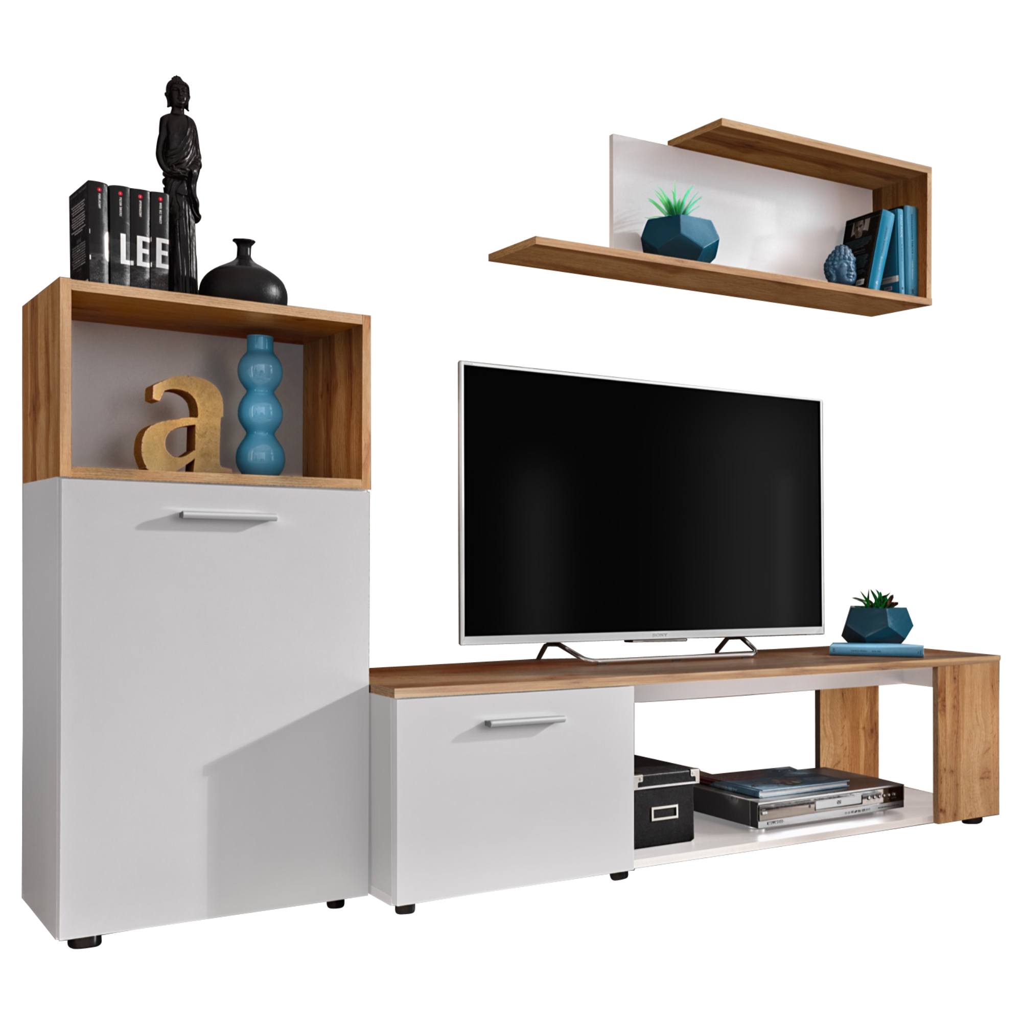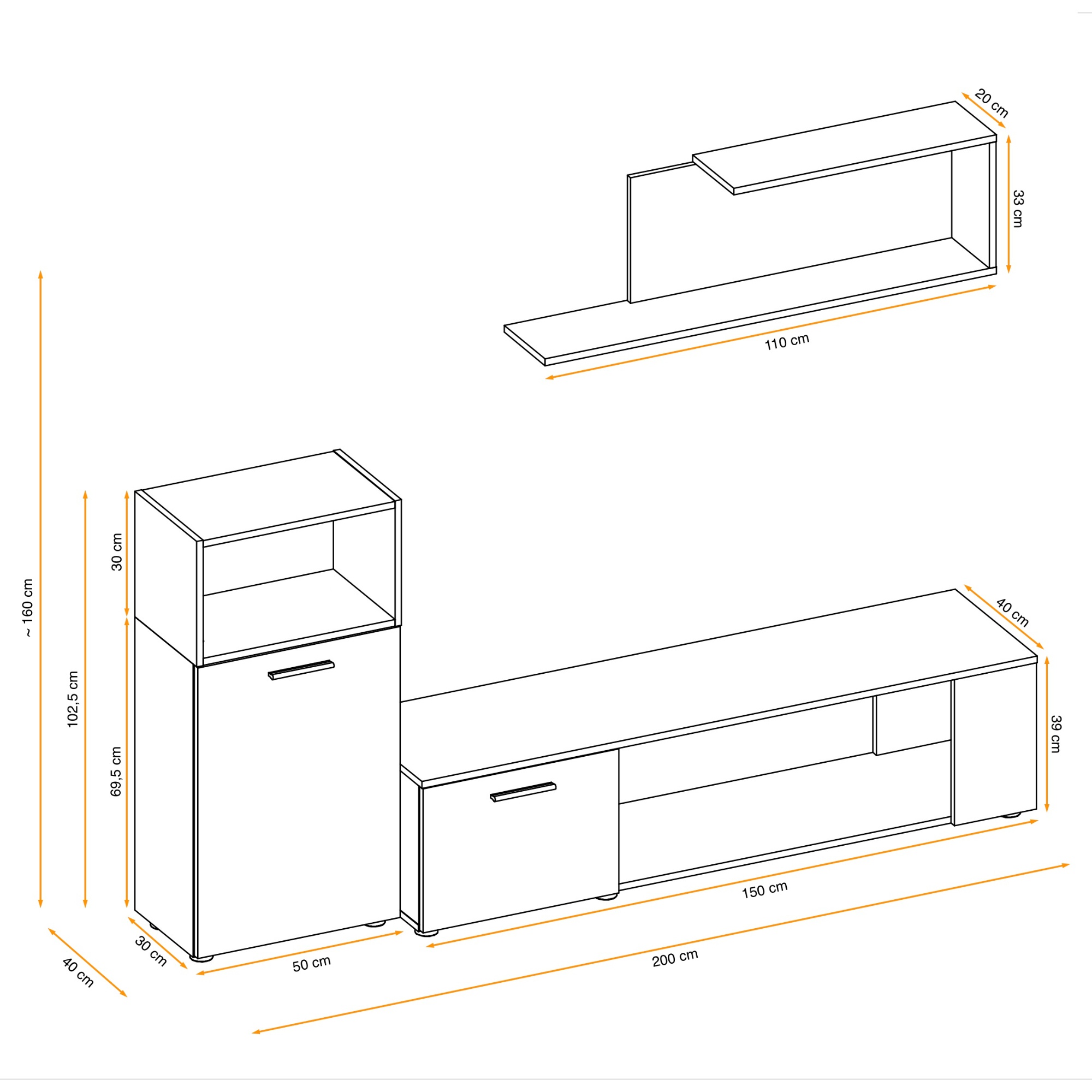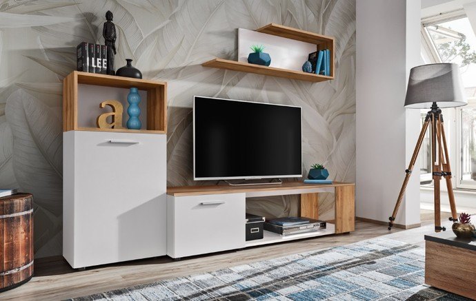 Součástí stěny je komoda s vloženými poličkami. Součástí sestavy je také TV komoda, která obsahuje krytý úložný prostor za výklopnými dvířky a prostor pro multimediální zařízení v pravé části komody. Sestava obsahuje ještě nástěnnou polici, kde se budou skvěle vyjímat dekorace a květiny. Sestava je vyrobena z laminovaného dřevěného materiálu, který je nenáročný na údržbu.