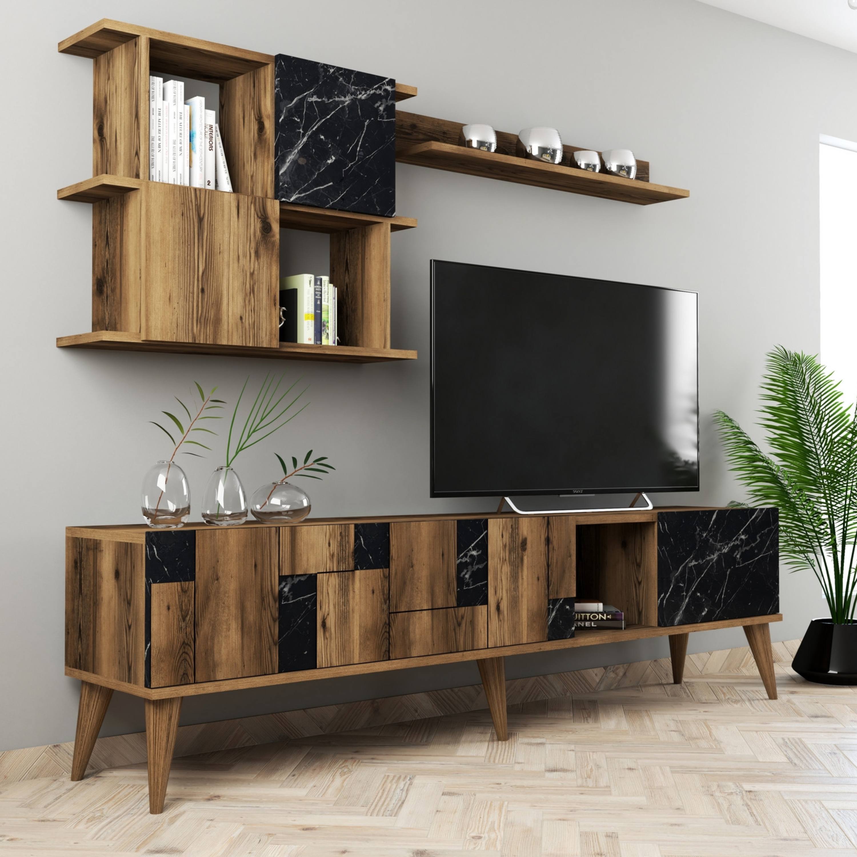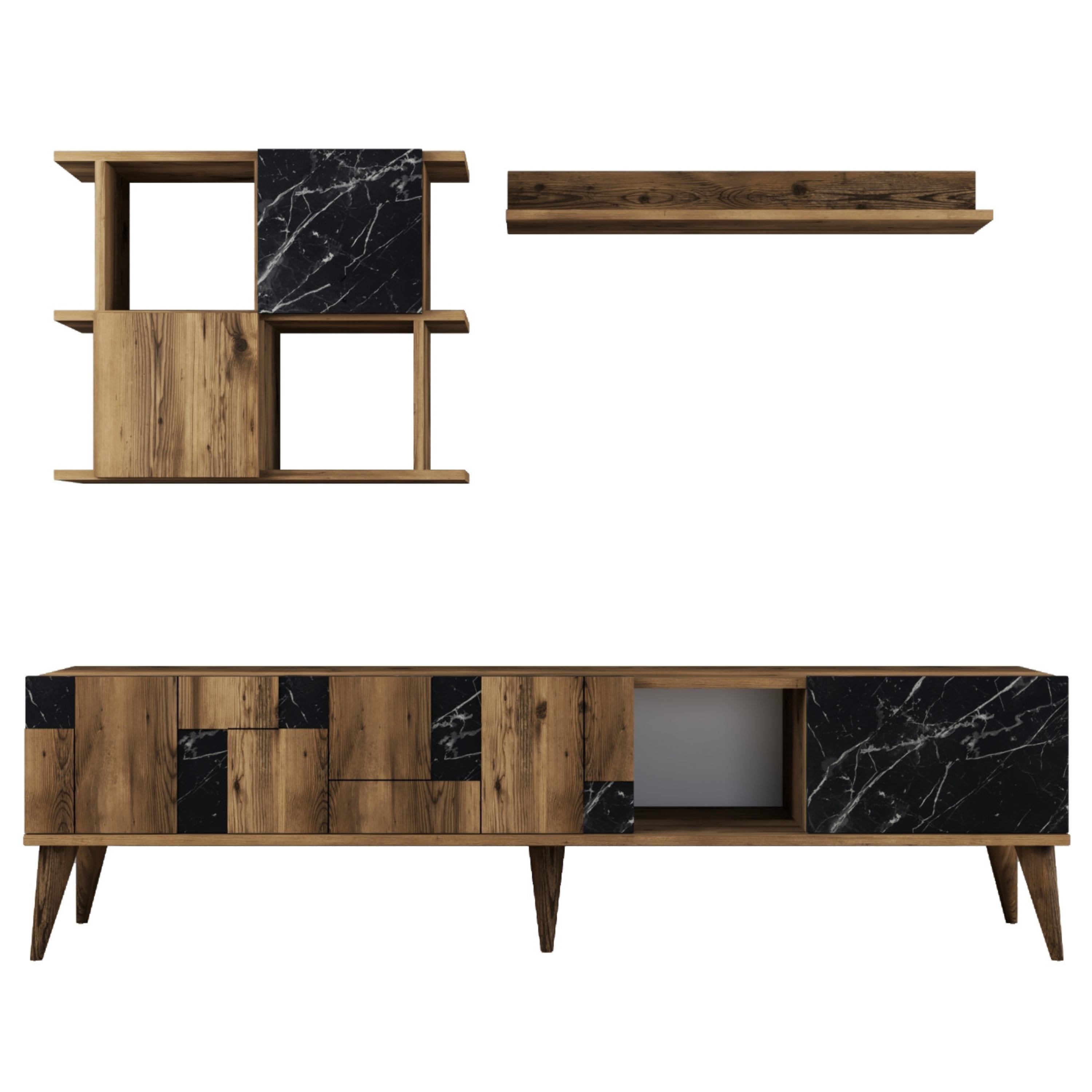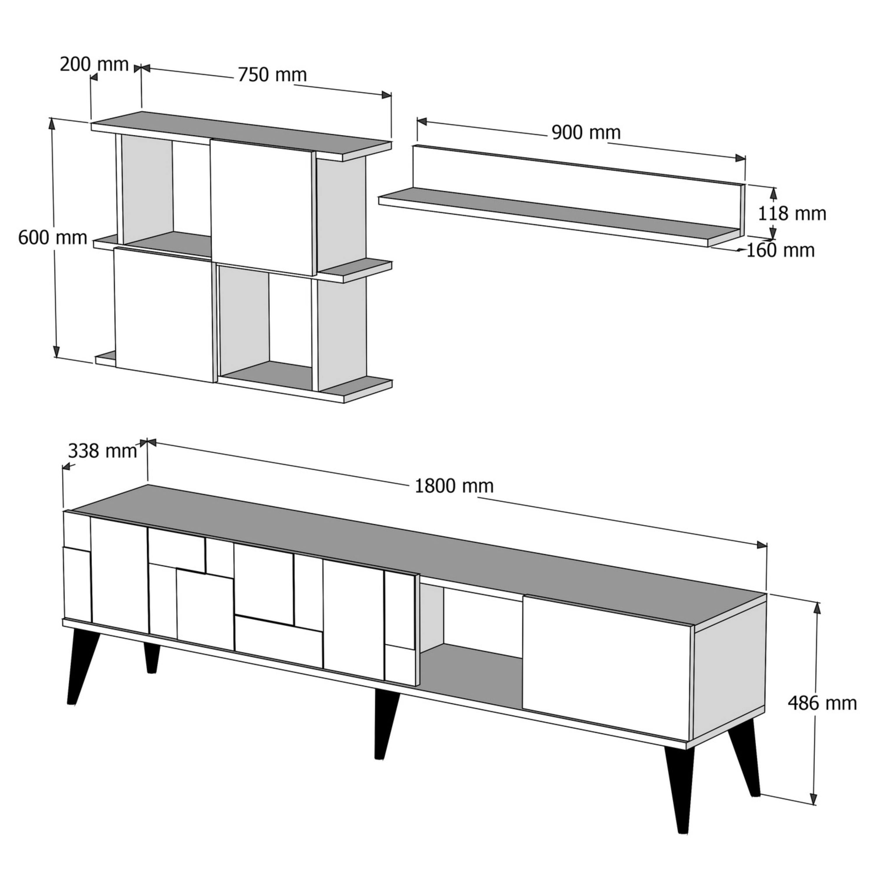 - Skládá se z: TV komoda, nástěnný regál, nástěnná police