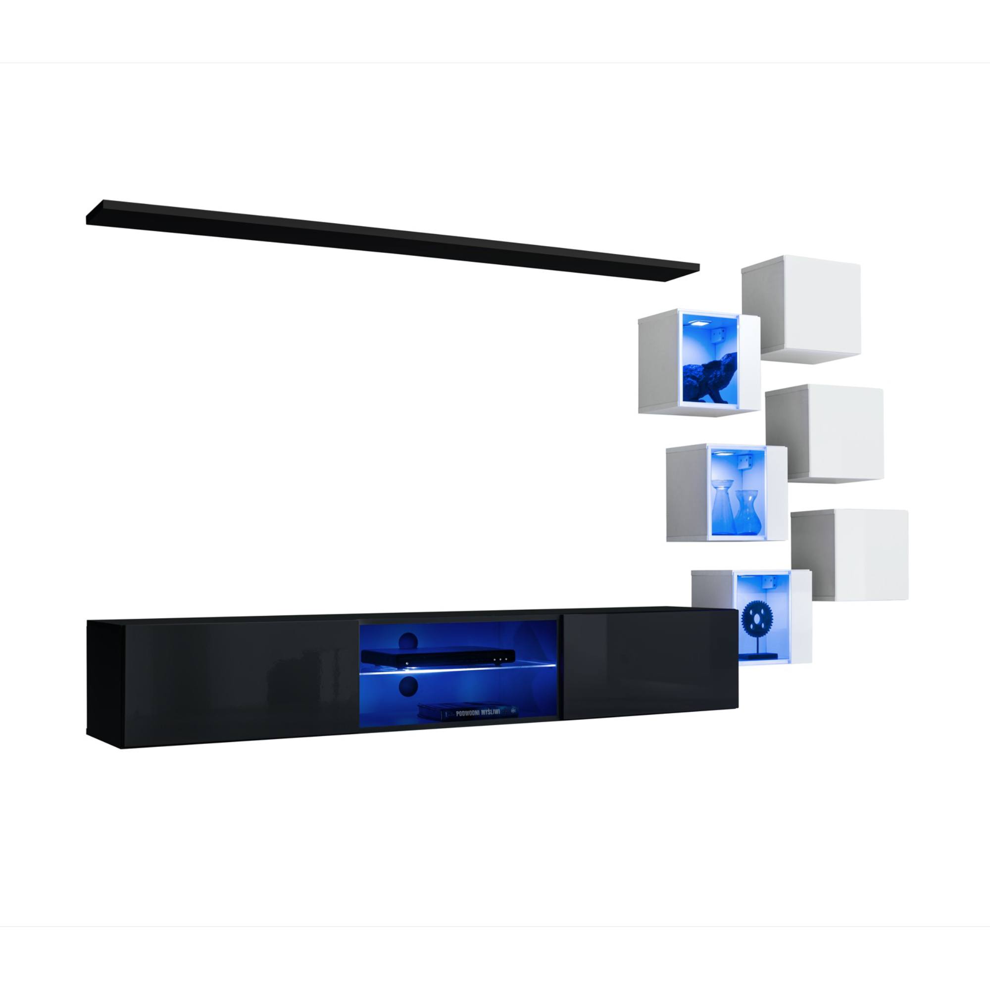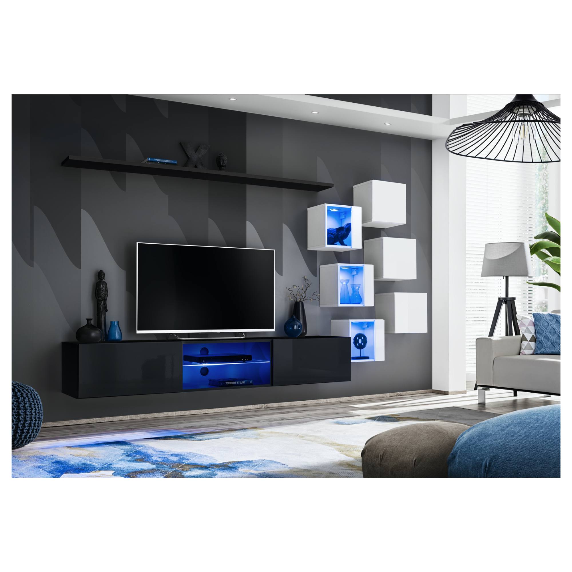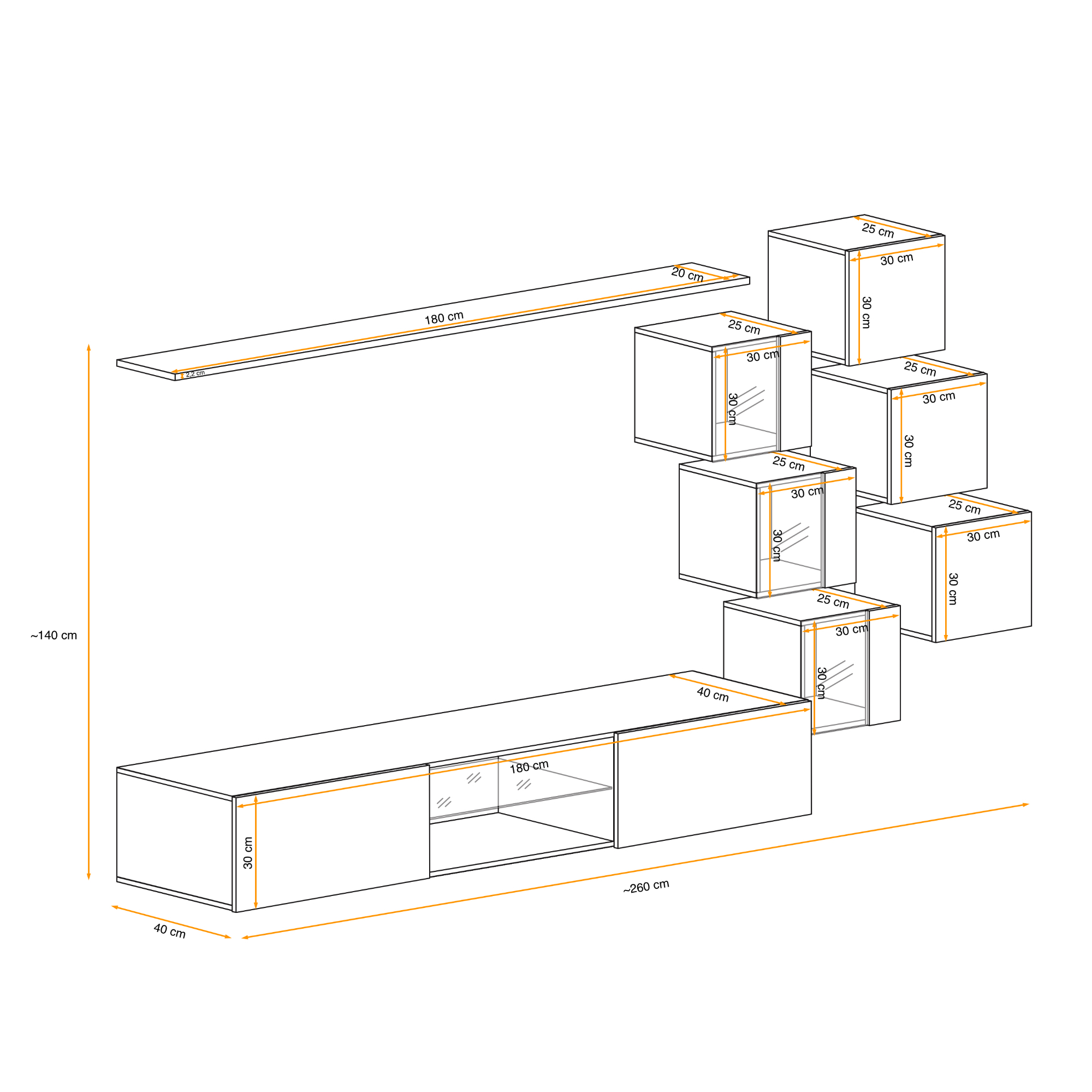- Skládá se z: Nástěnná TV komoda, 3x nástěnný blok, 3x nástěnná vitrína, police