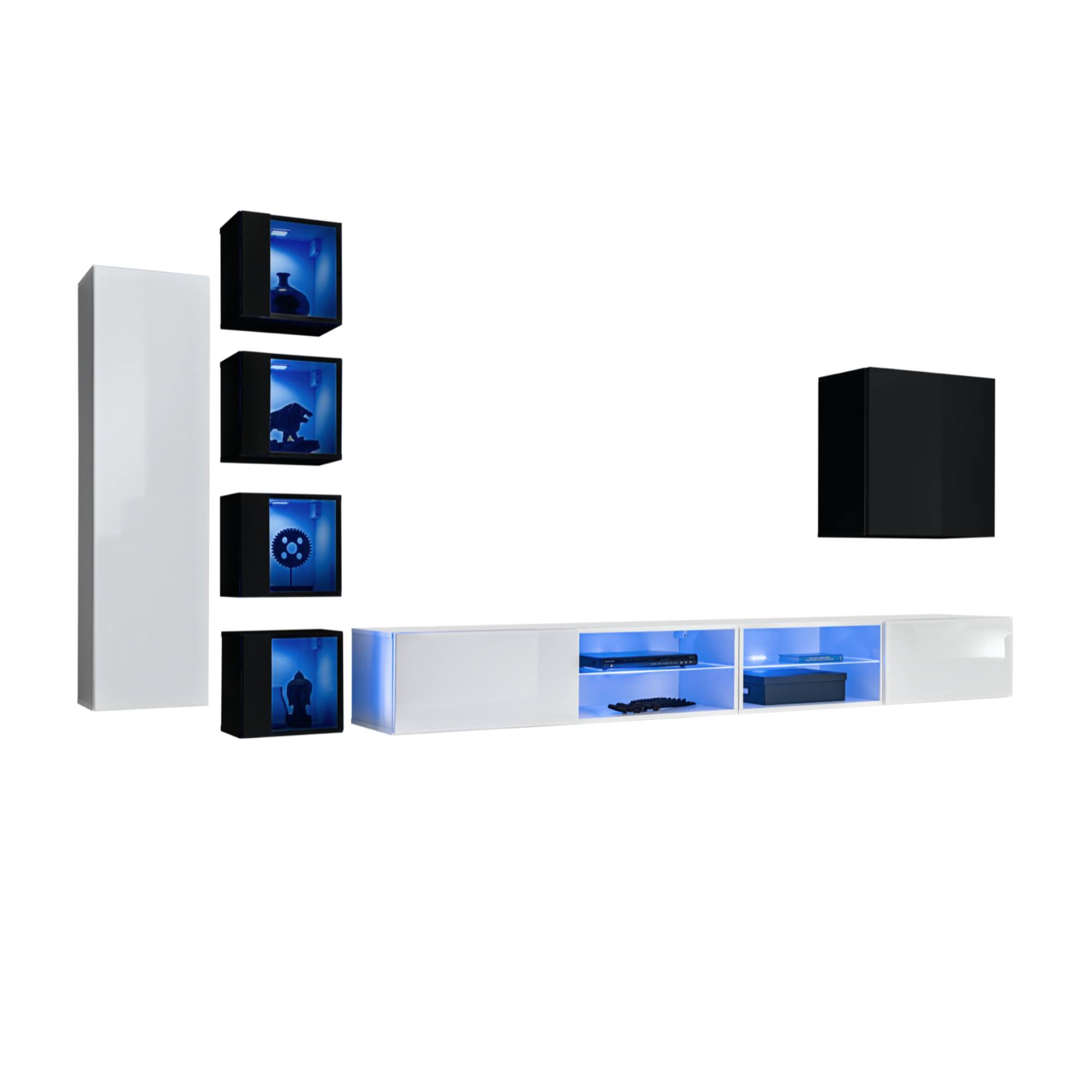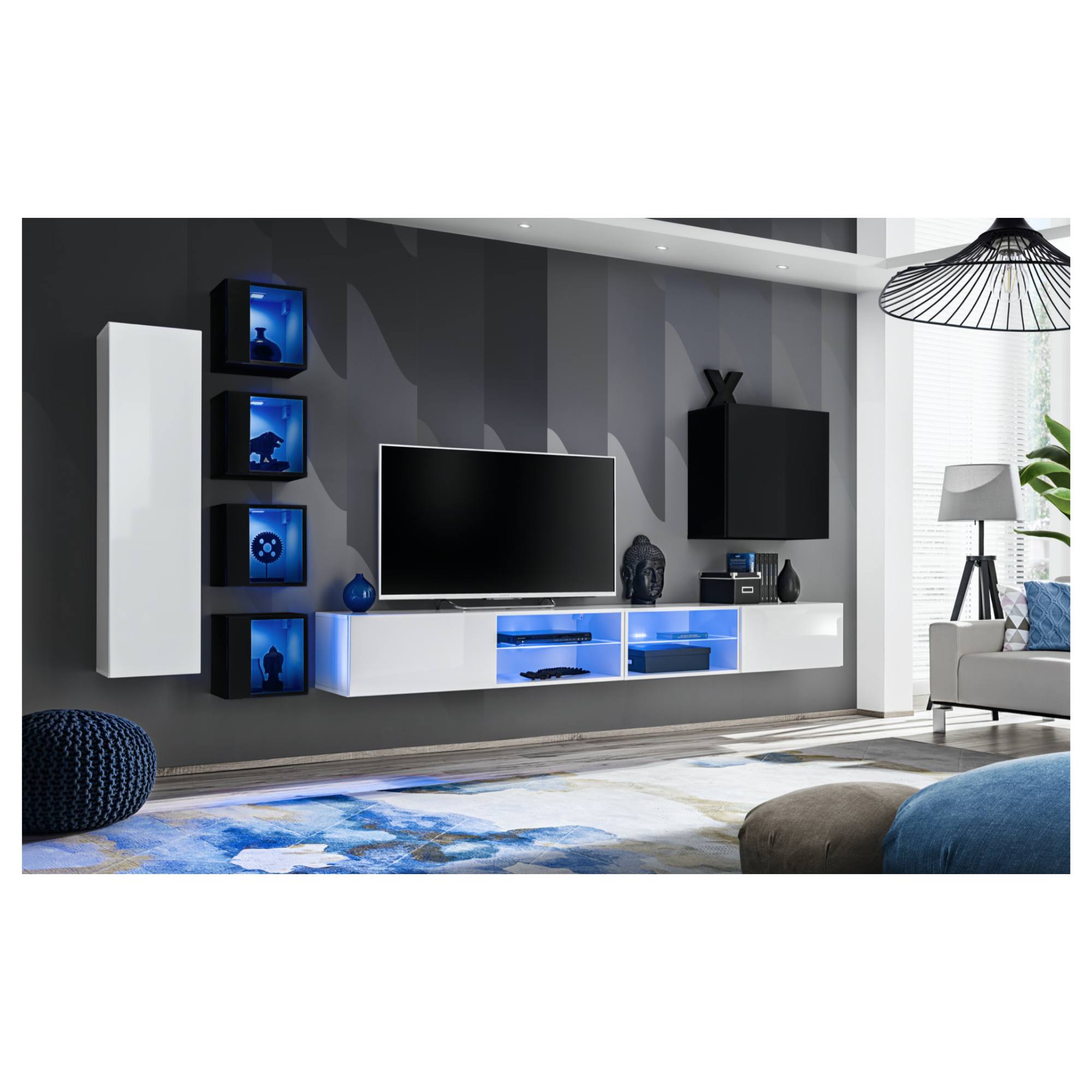 Dvě nástěnné TV komody kombinují krytý a otevřený úložný prostor a poskytují hodně odkládacího místa i na povrchu. Čtyři nástěnné prosklené vitríny nabízí dostatek úložného prostoru pro předměty, které chcete mít neustále na očích. LED osvětlení přidá na futuristickém vzhledu. Nástěnný blok i skříňka jsou vybaveny plnými dvířky a uvnitř doplněny o vložené police. Obývací stěnu si můžete pořídit hned v několika provedeních a přizpůsobit tak obývací pokoj vzhledu celé domácnosti.