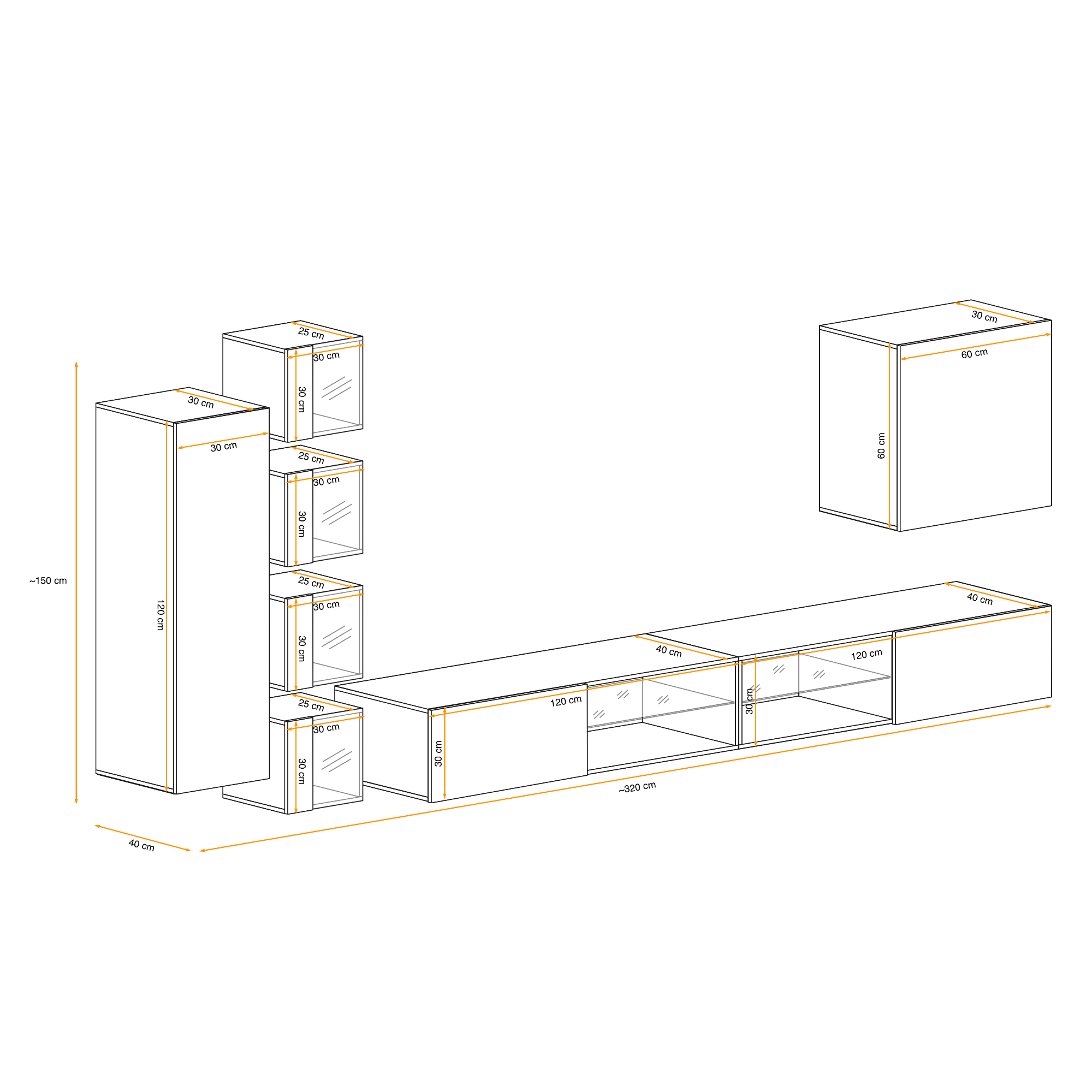 - Skládá se z: 2x nástěnná TV komoda, 4x nástěnná vitrína, nástěnná skříňka, nástěnný blok