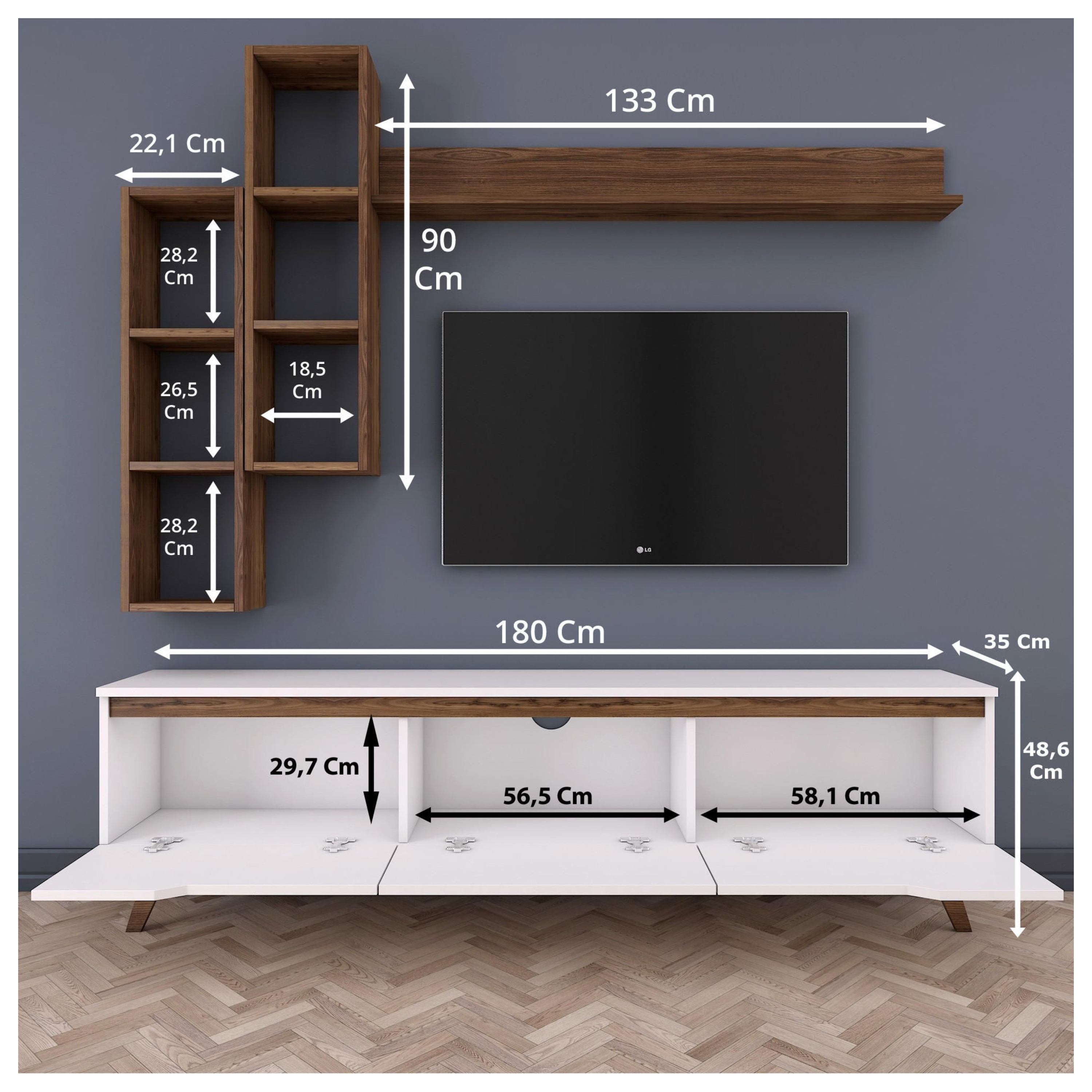 - Skládá se z: TV komoda, 2x nástěnný regál, nástěnná police