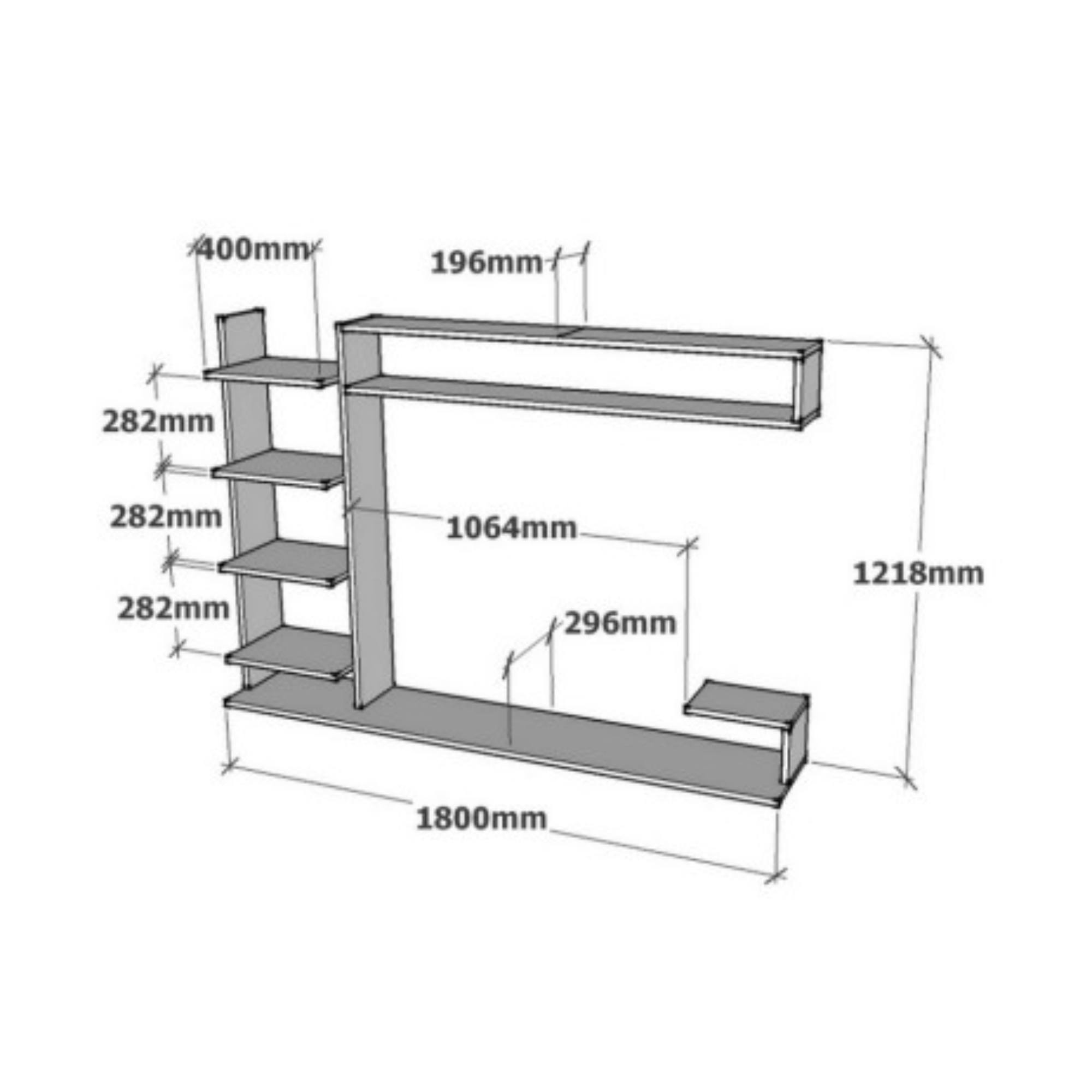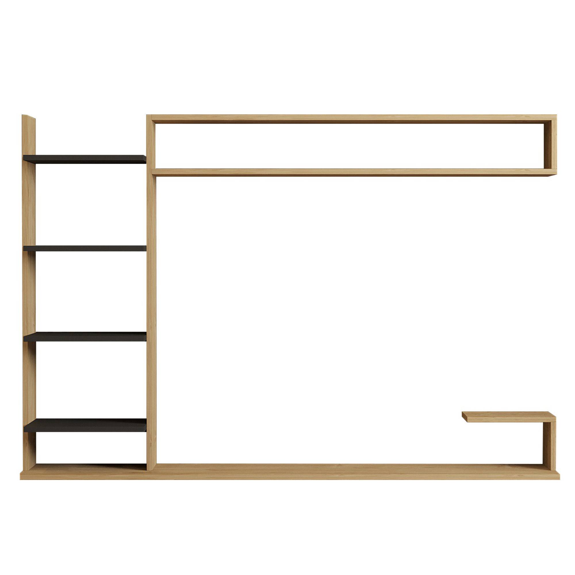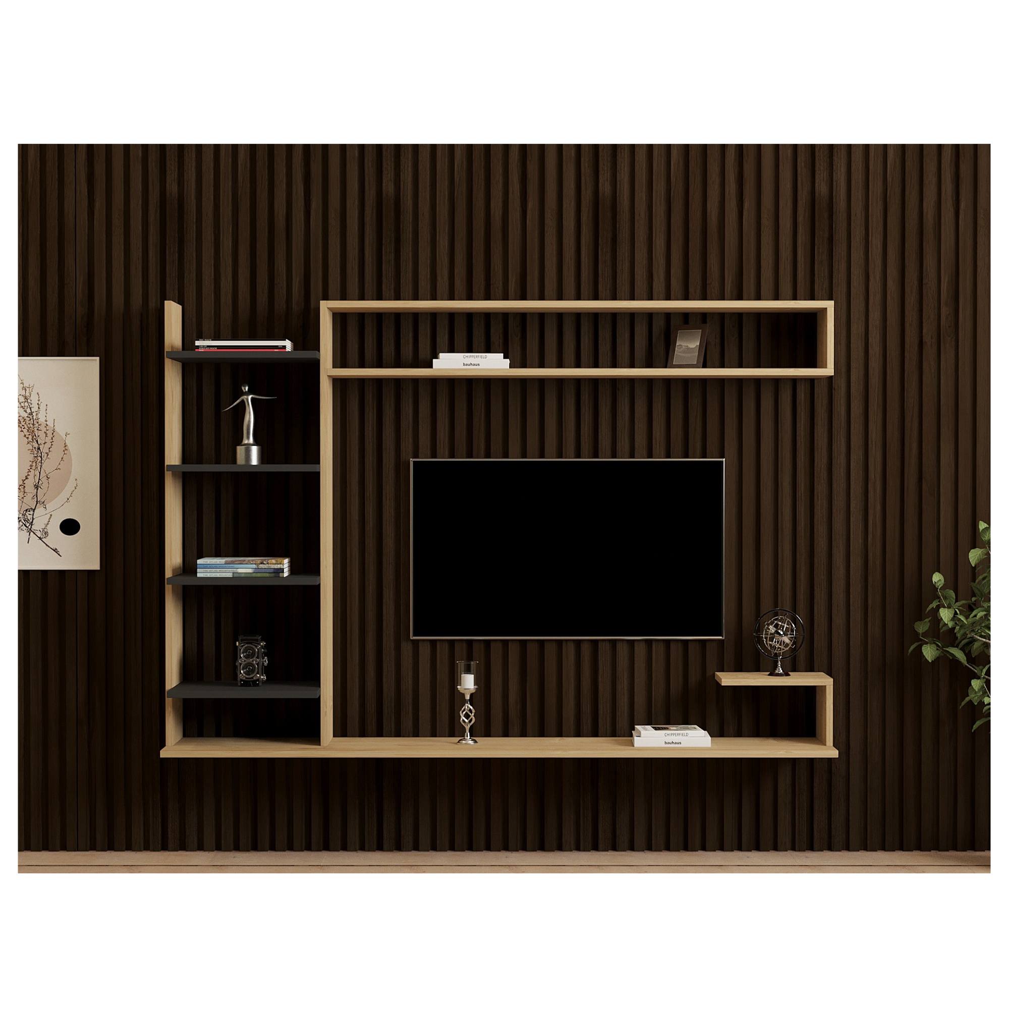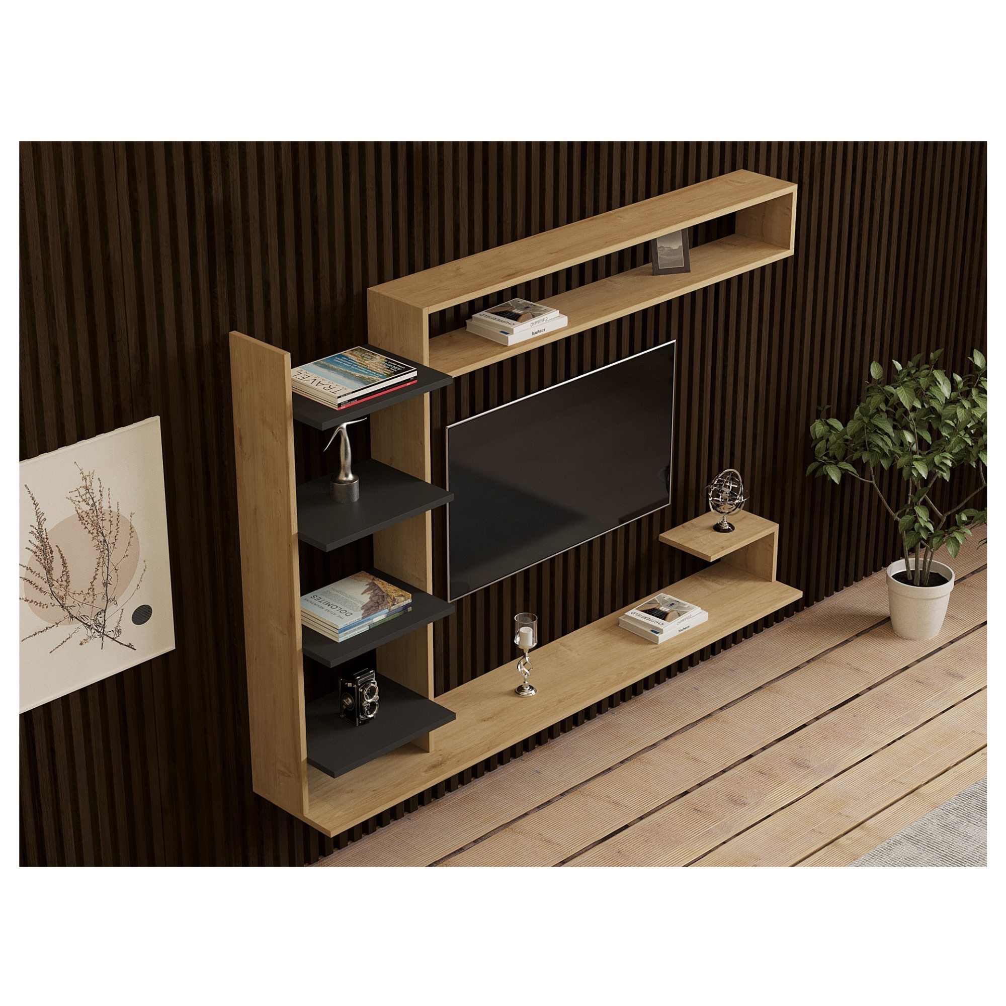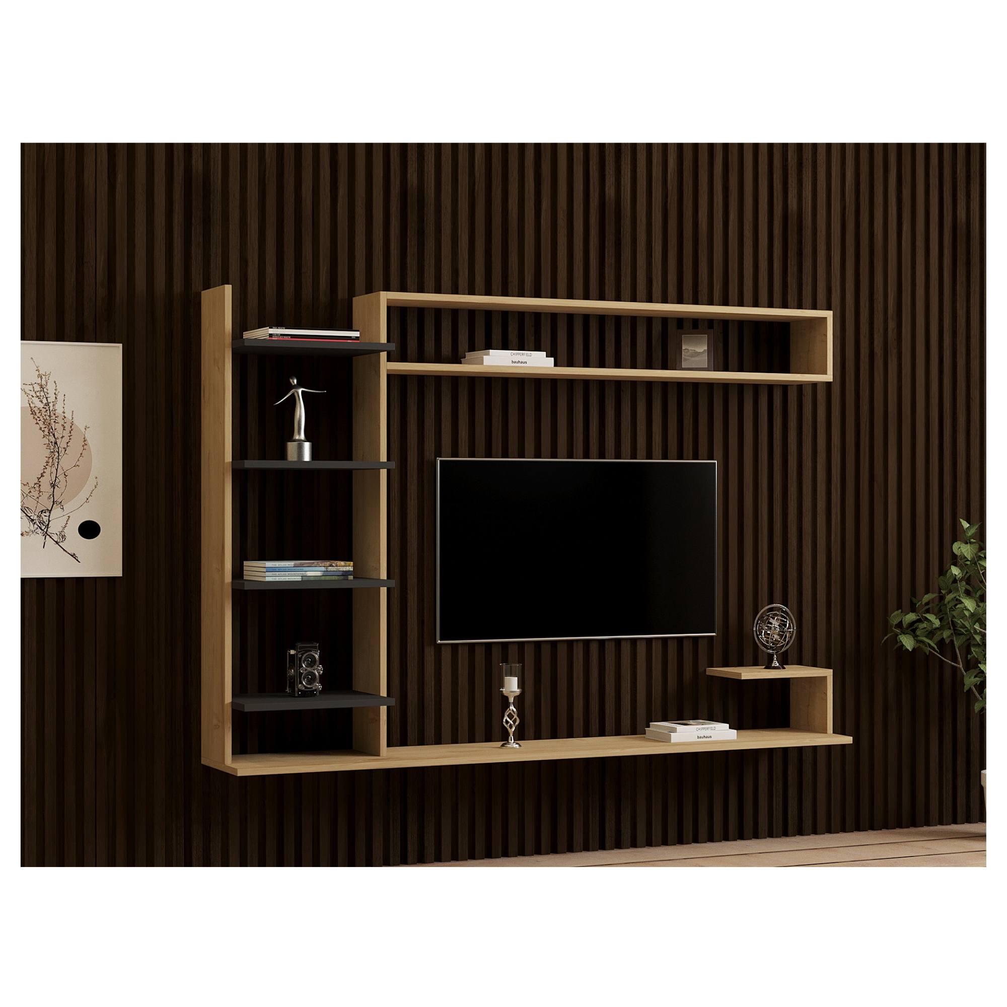 Stěna nabízí dostatek úložného prostoru. Na její vložené police můžete nejen uložit TV příslušenství nebo různé drobnosti, které potřebujete mít po ruce, ale i vystavit dekorace.