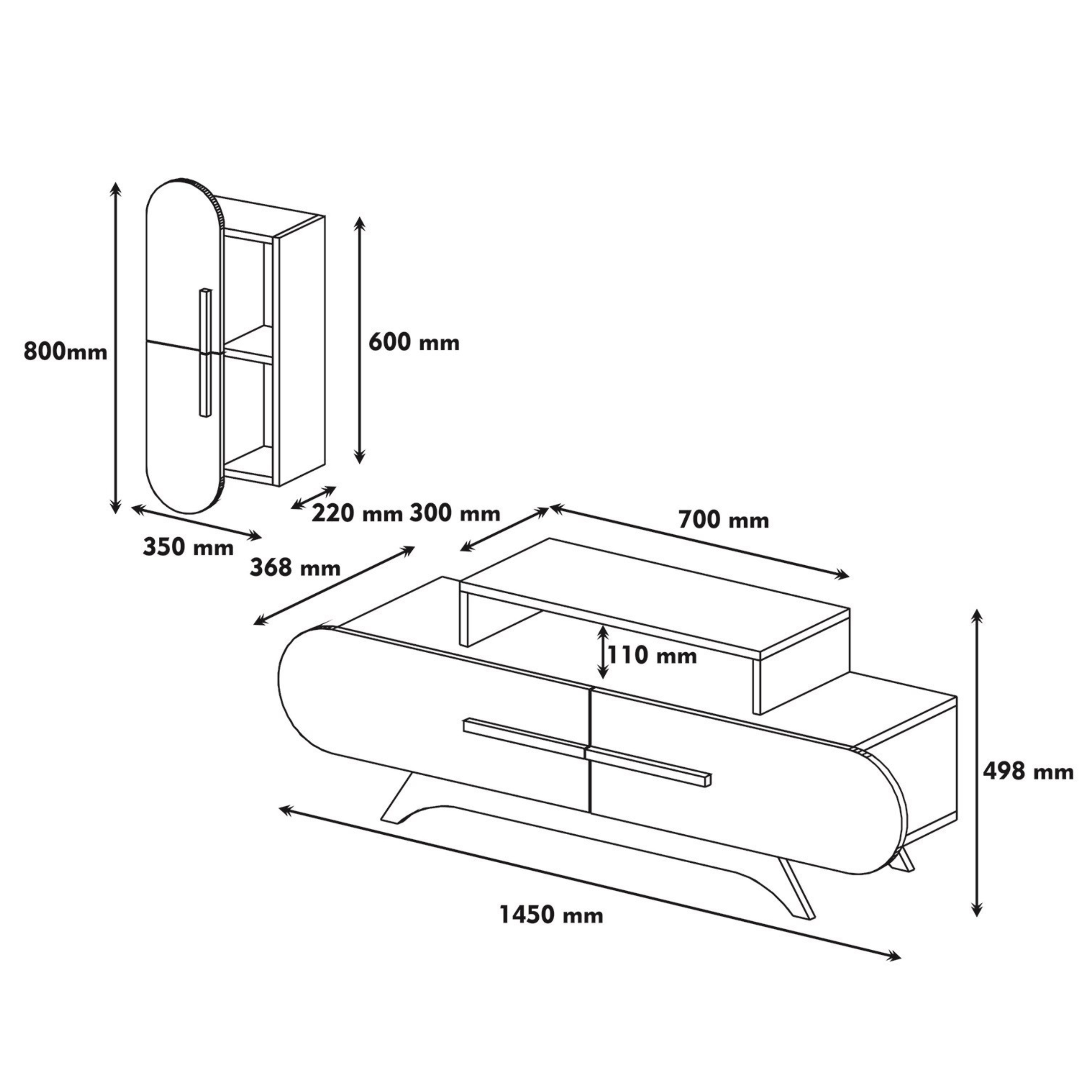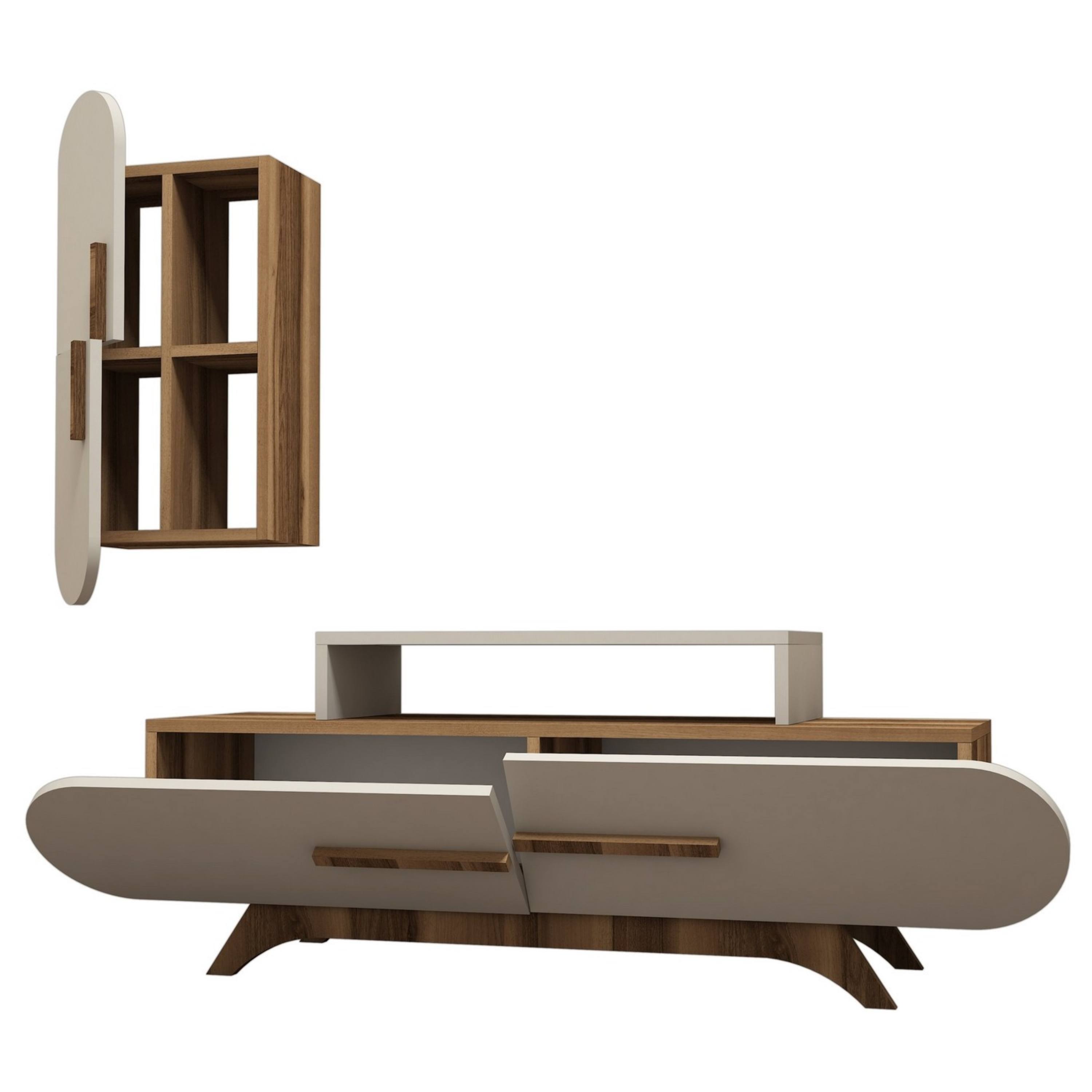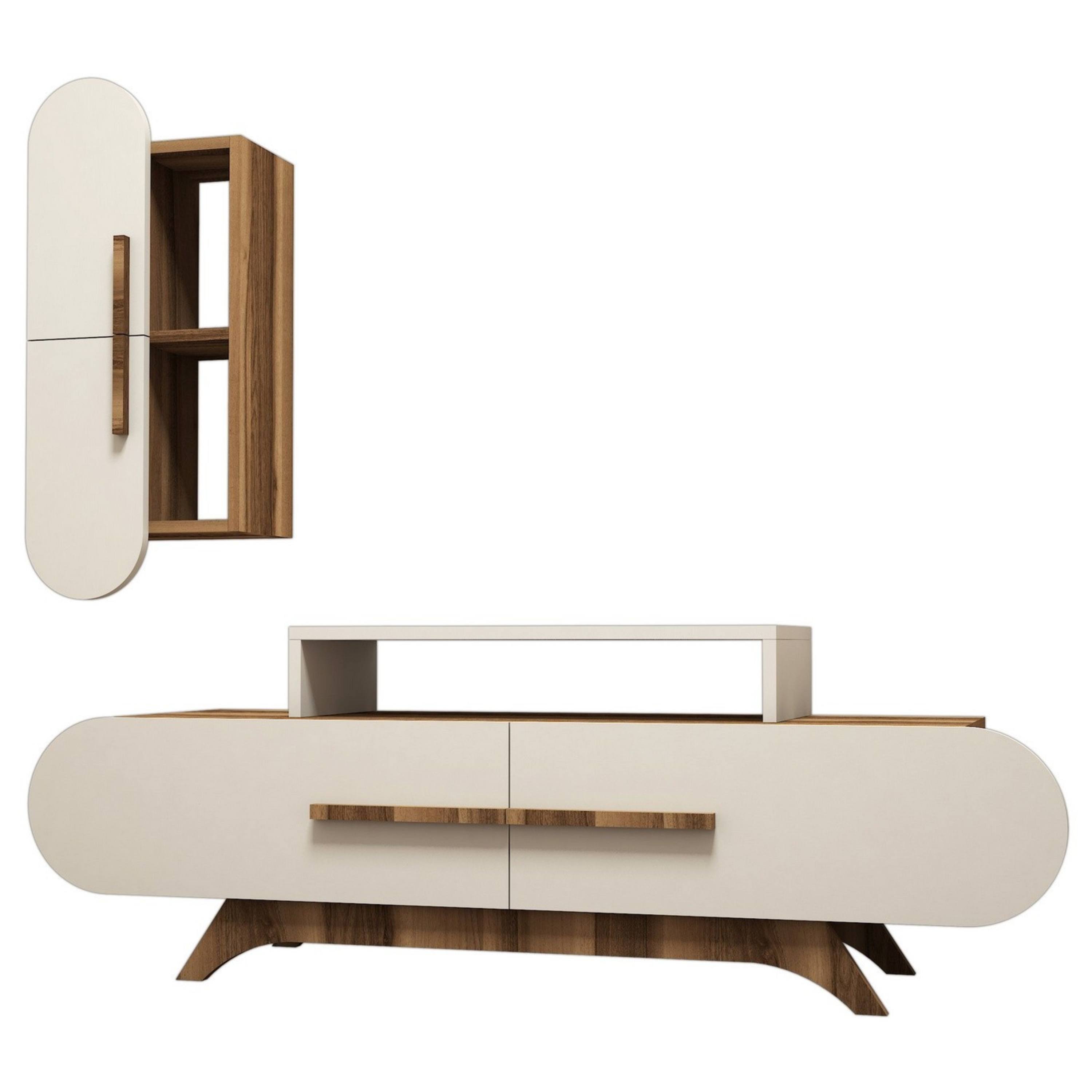 Sestava se skládá z TV komody a nástěnné skříňky, které společně nabízejí dostatek prostoru pro uložení elektroniky i dekorací. TV komoda je vybavena 2 výklopnými dveřmi, za nimiž se nachází praktický úložný prostor. Horní deska poskytuje místo nejen pro televizor, ale i další zařízení. Nástěnná skříňka doplňuje celek o další členitý úložný prostor za otočnými dveřmi. Díky promyšlenému provedení je sestava vzdušná a zároveň velmi funkční.