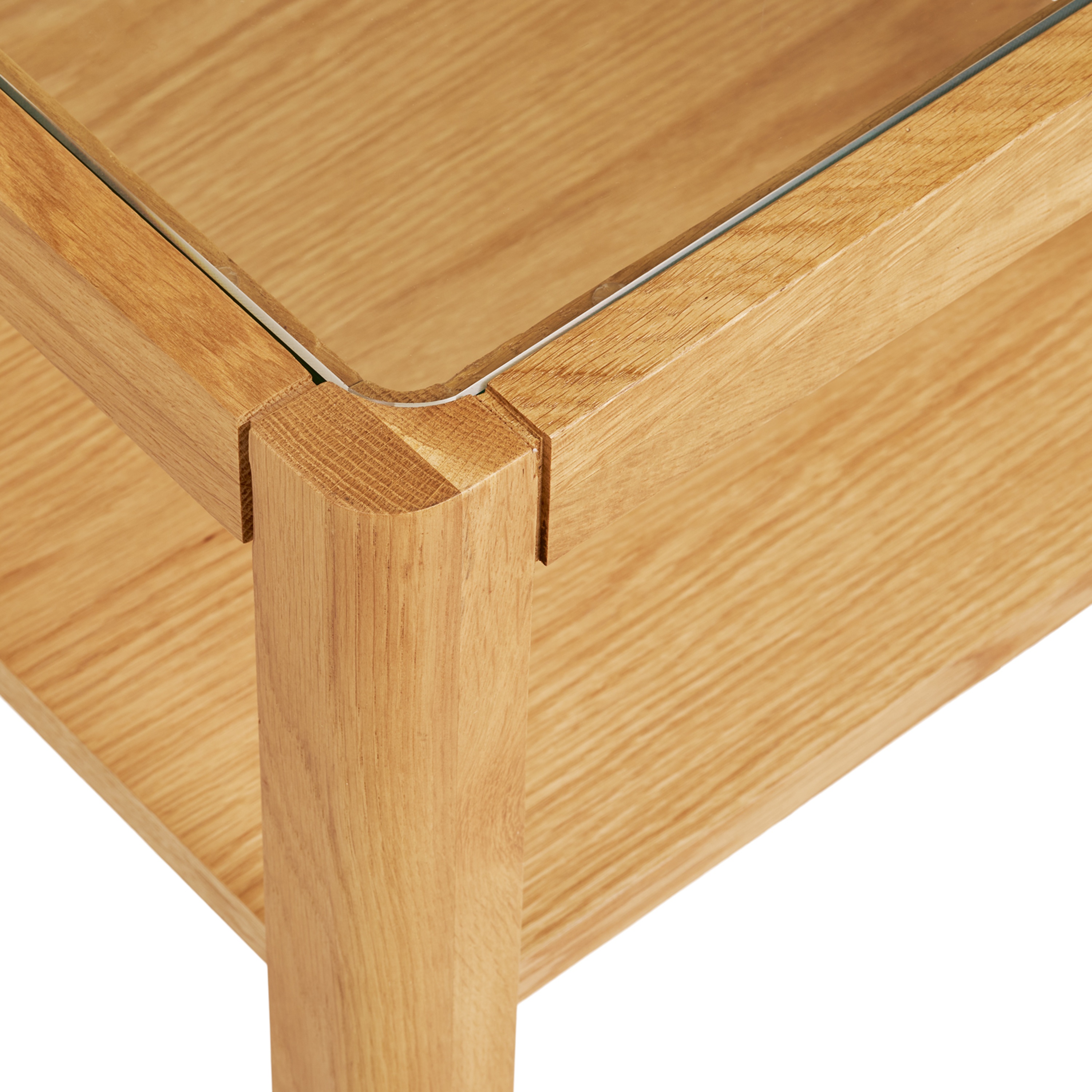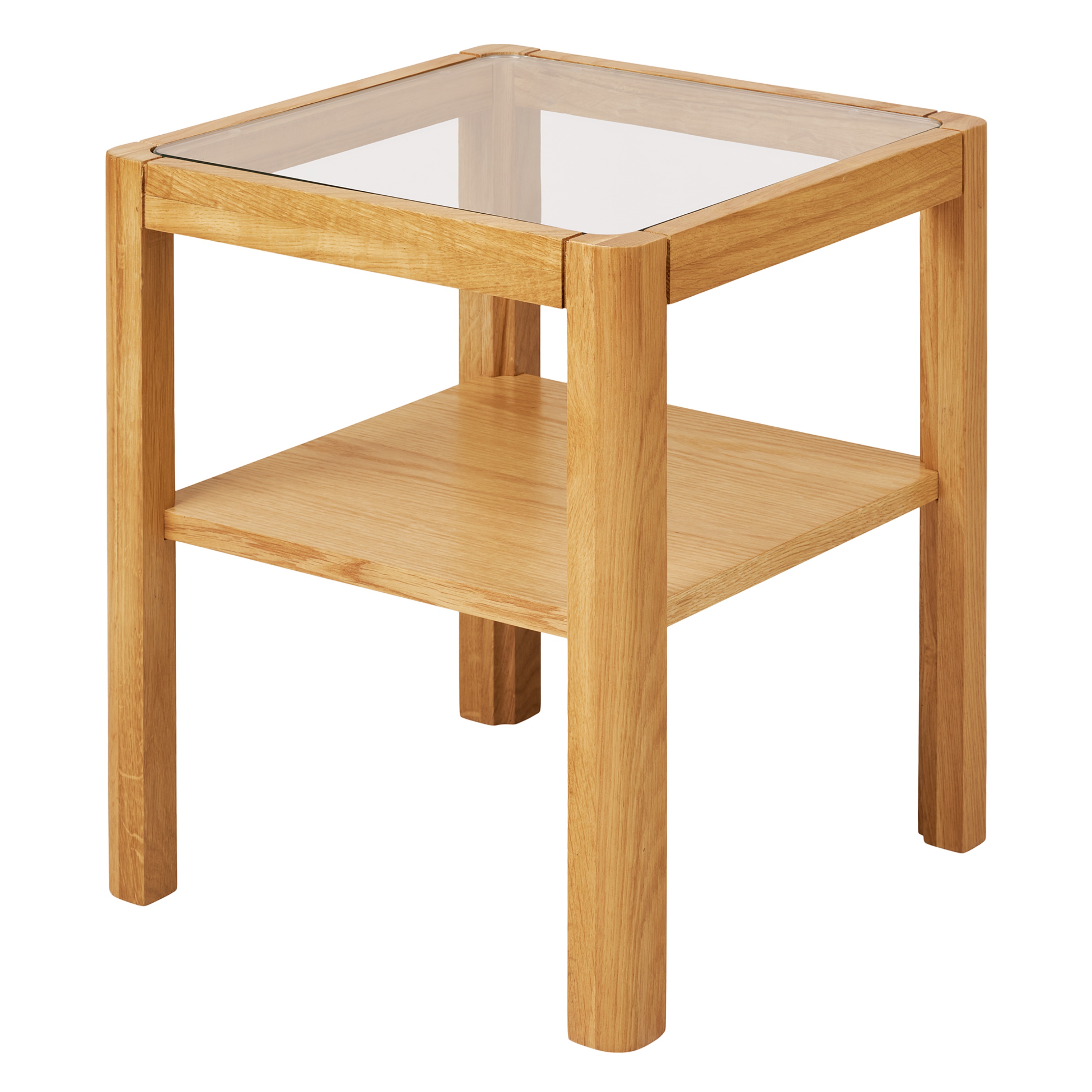 Odkládací stolek LUERMORAN zaujme nadčasovým designem, který kombinuje vzdušnou skleněnou desku s přírodním dubovým dekorem.