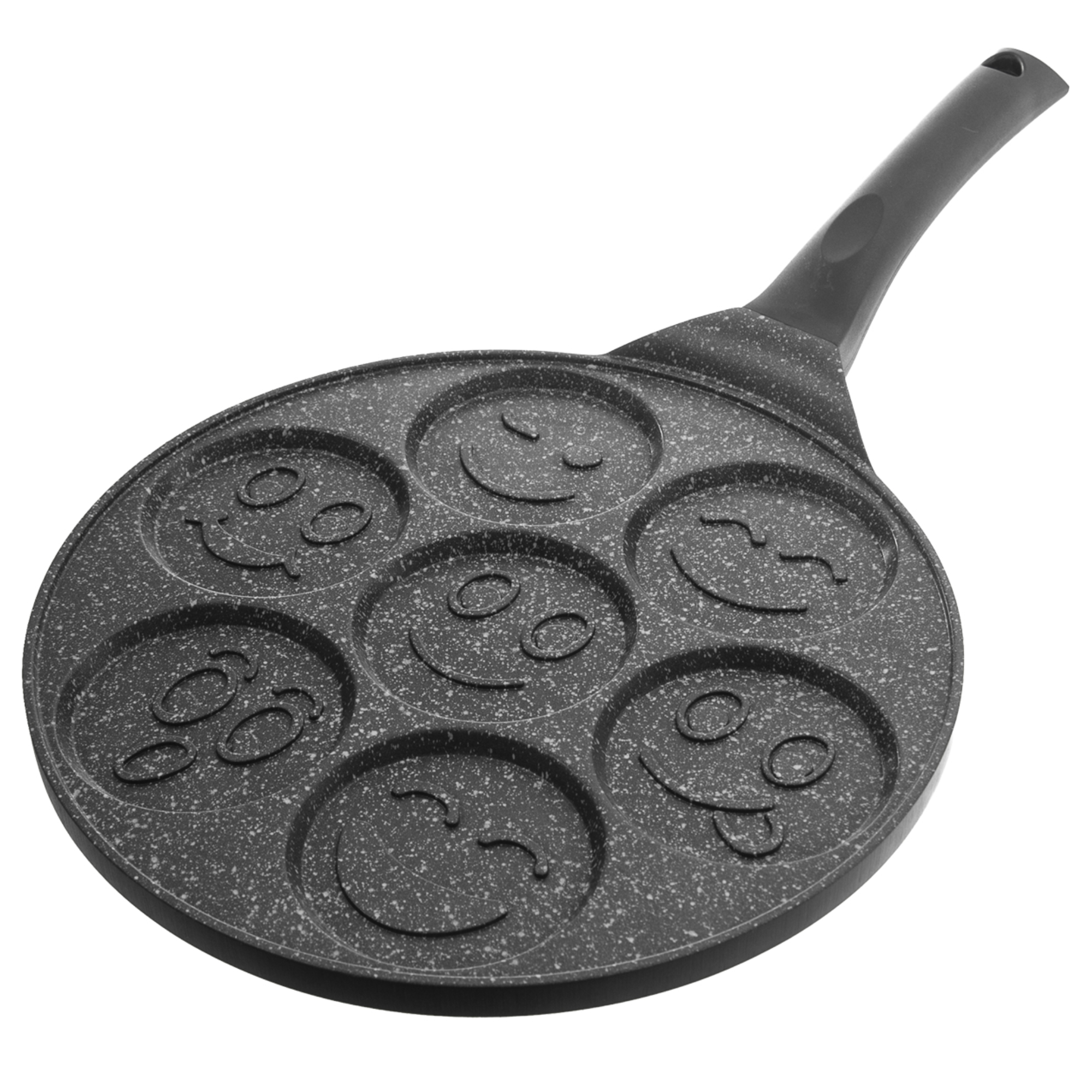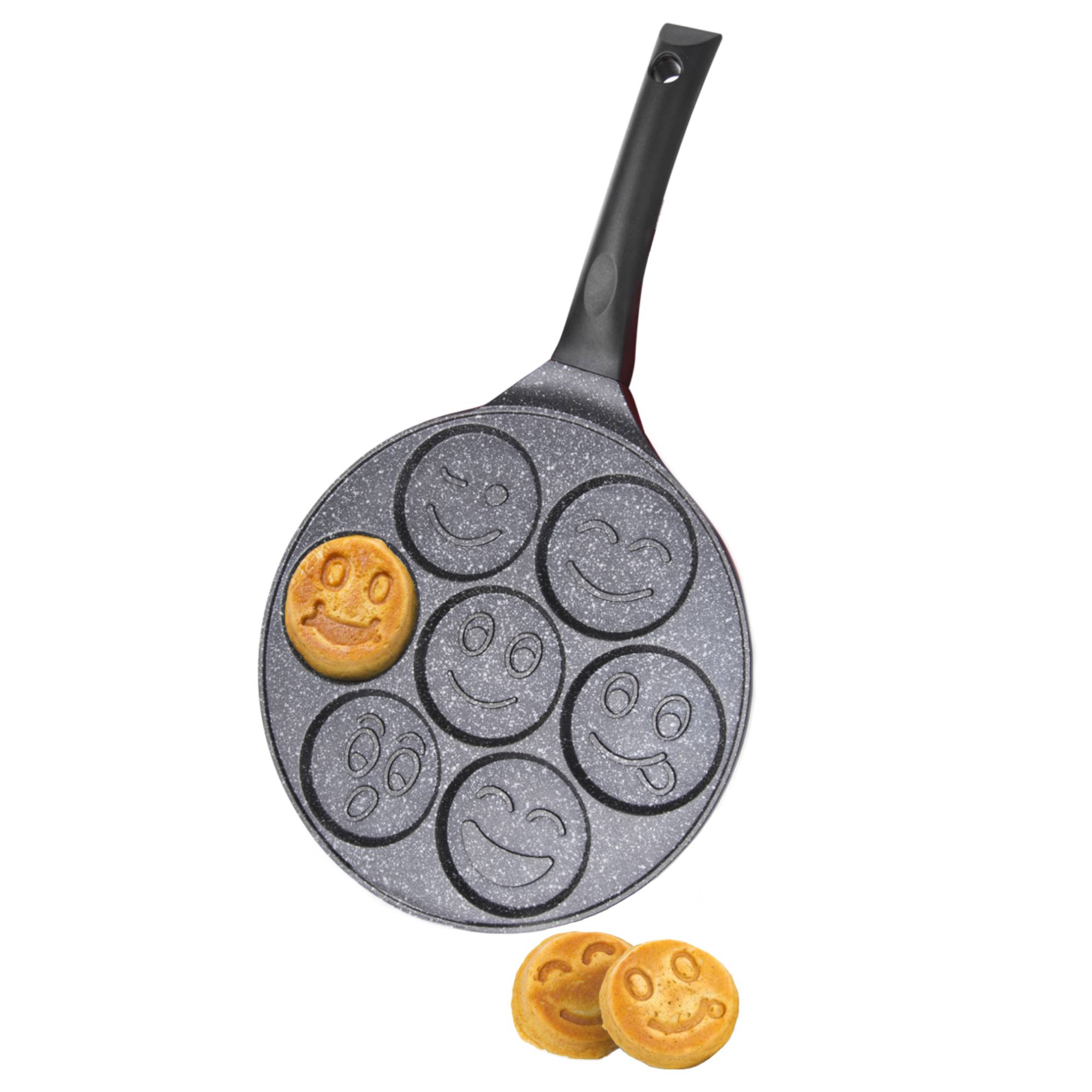 Pánev na lívance GRANDE s průměrem 27 cm se stane skvělým designovým a praktickým pomocníkem do každé domácnosti. Pánev má 7 sekcí s veselými obličeji, které se otisknou do připravovaného pokrmu. Je vyrobená z hliníku, který je potažen kvalitním antiadhezním povrchem, ten zabraňuje připékání pokrmů na pánvičce. Rukojeť se při používání nezahřeje a má šikovný otvor na zavěšení.
