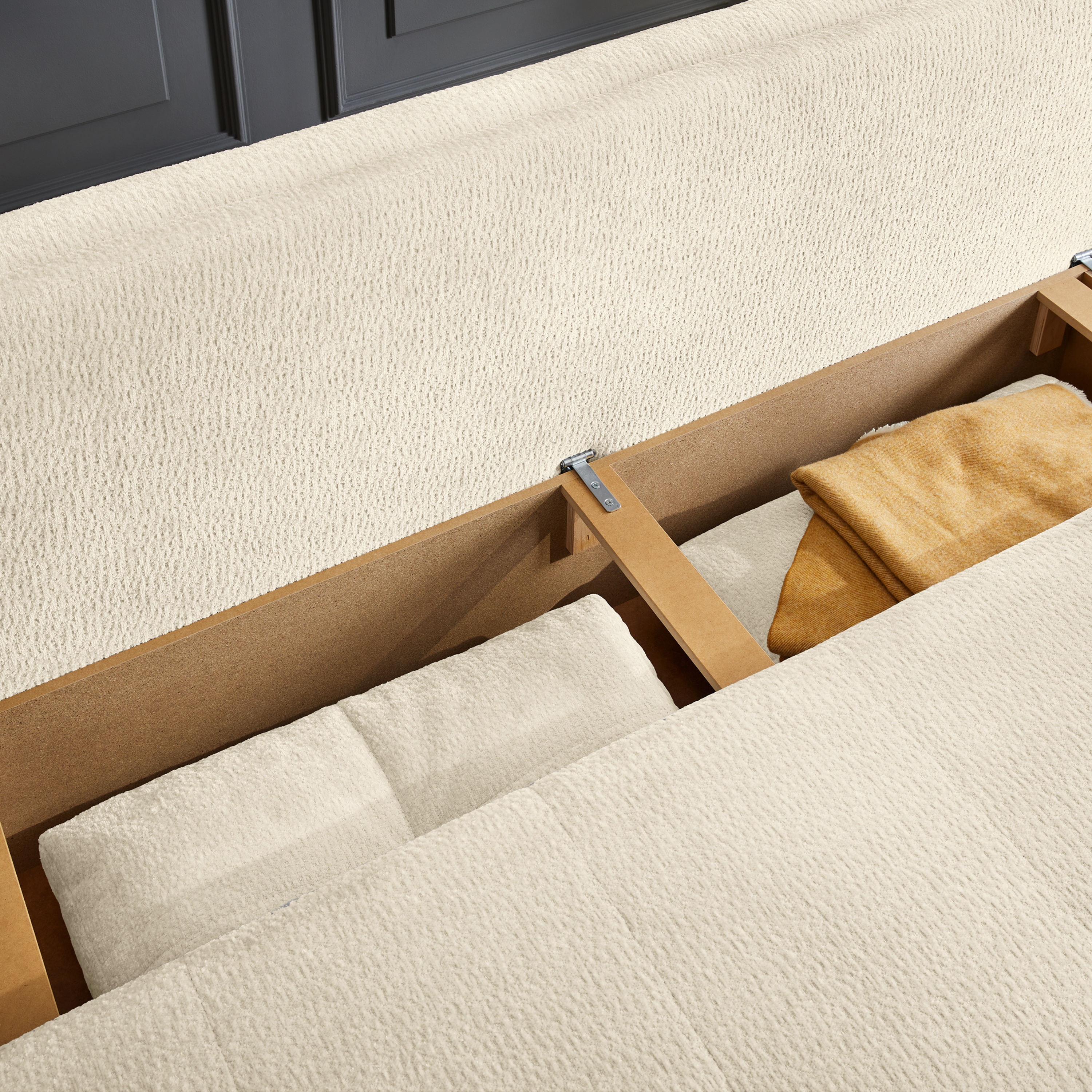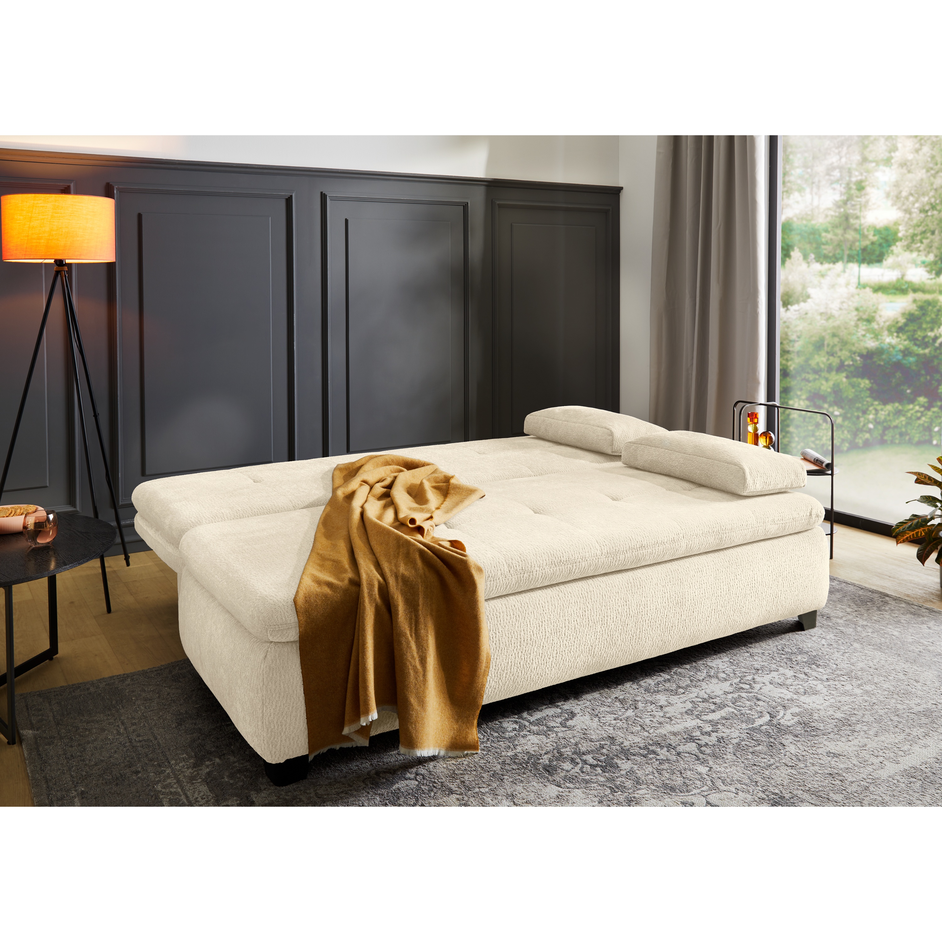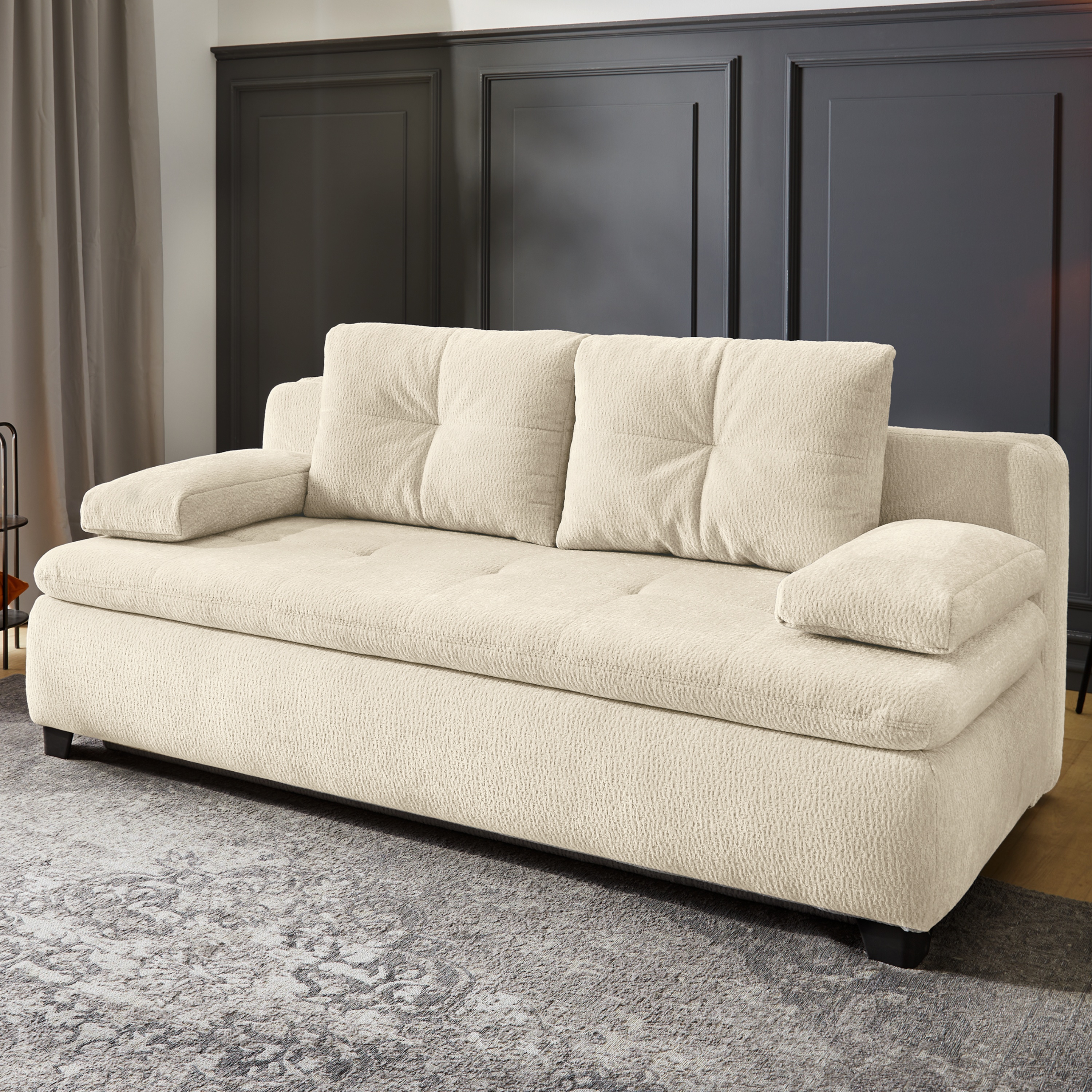 Pohovku můžete díky praktické rozkládací funkci přeměnit na dodatečné lůžko pro občasné přespání. Součástí konstrukce je také integrovaný úložný prostor, díky kterému může mít náhradní lůžkoviny a jiné předměty snadno přístupné. Celočalouněné provedení vám dovolí umístit pohovku dle dispozice interiéru.