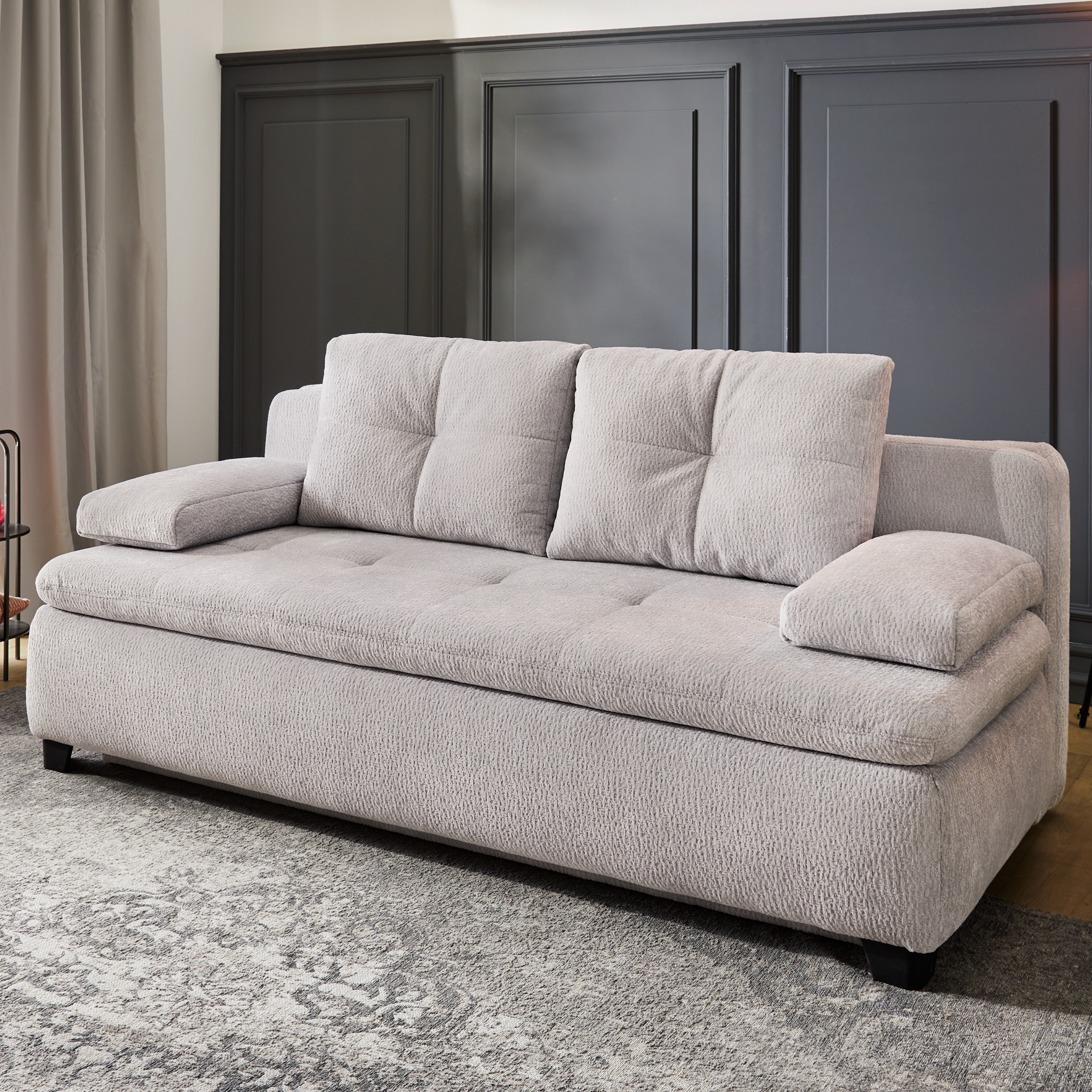 Pohovku můžete díky praktické rozkládací funkci přeměnit na dodatečné lůžko pro občasné přespání. Součástí konstrukce je také integrovaný úložný prostor, díky kterému může mít náhradní lůžkoviny a jiné předměty snadno přístupné. Celočalouněné provedení vám dovolí umístit pohovku dle dispozice interiéru.
