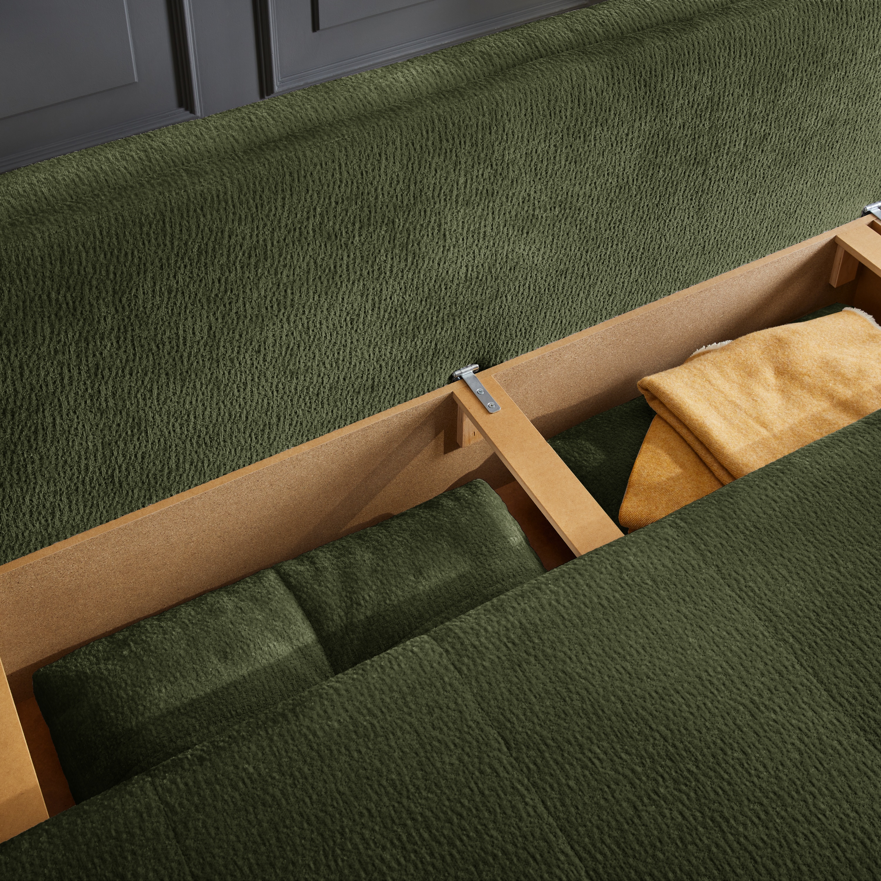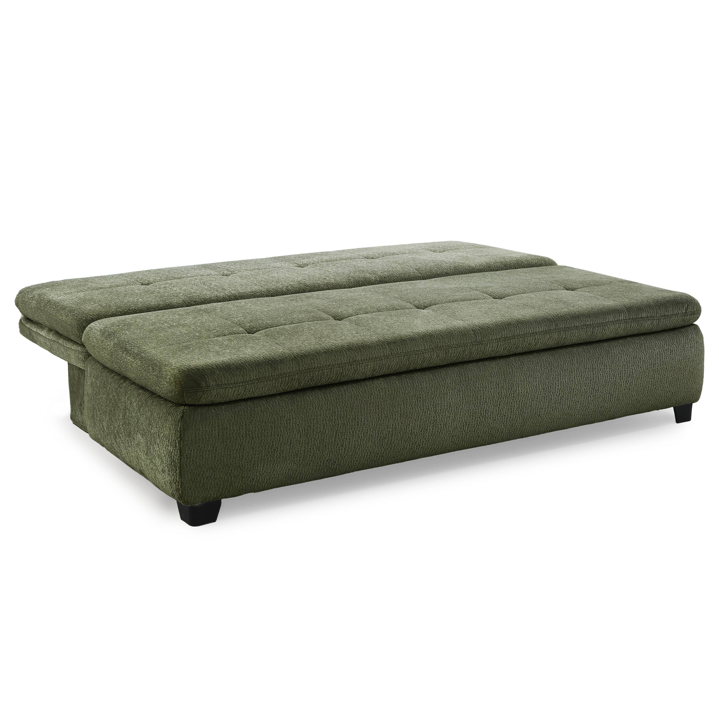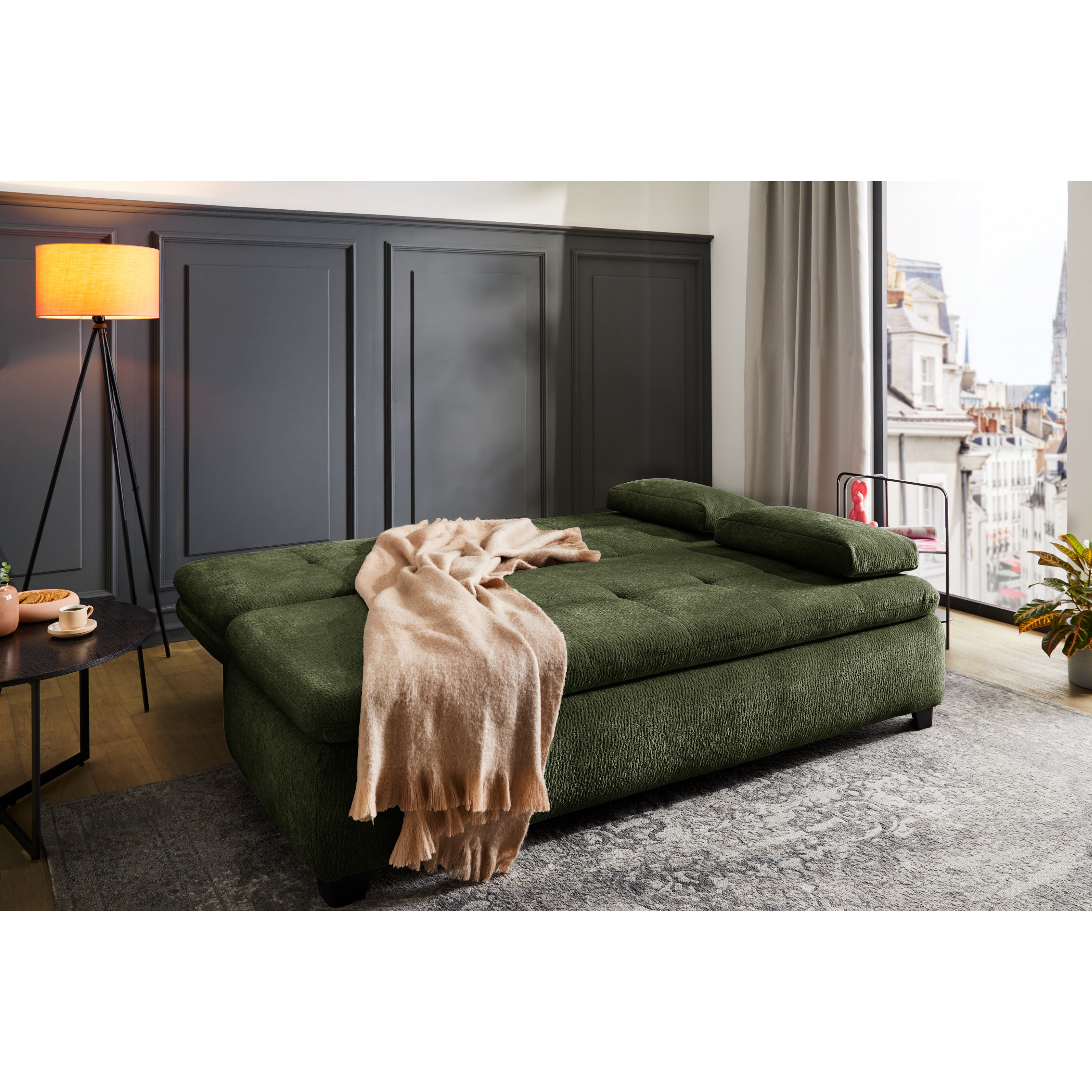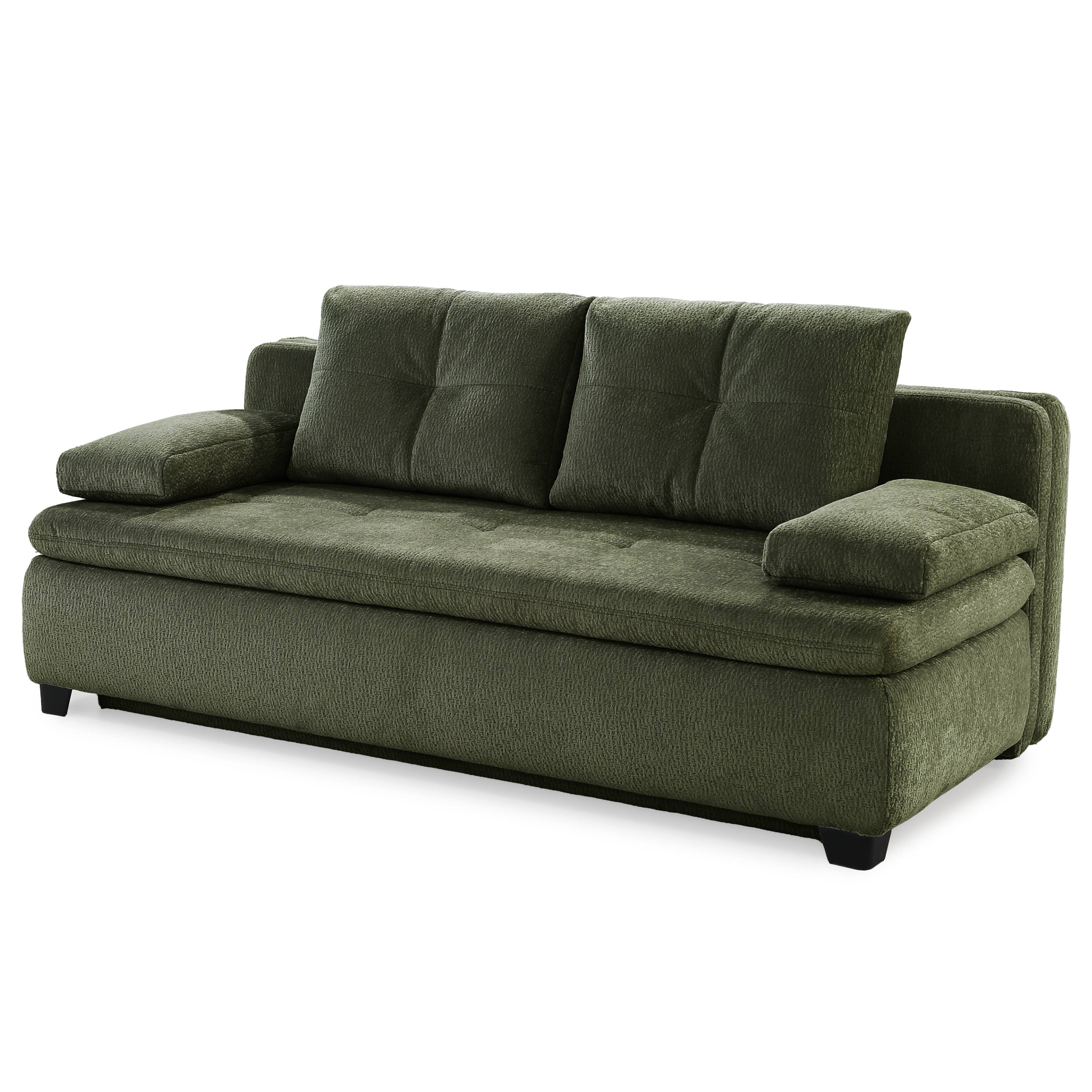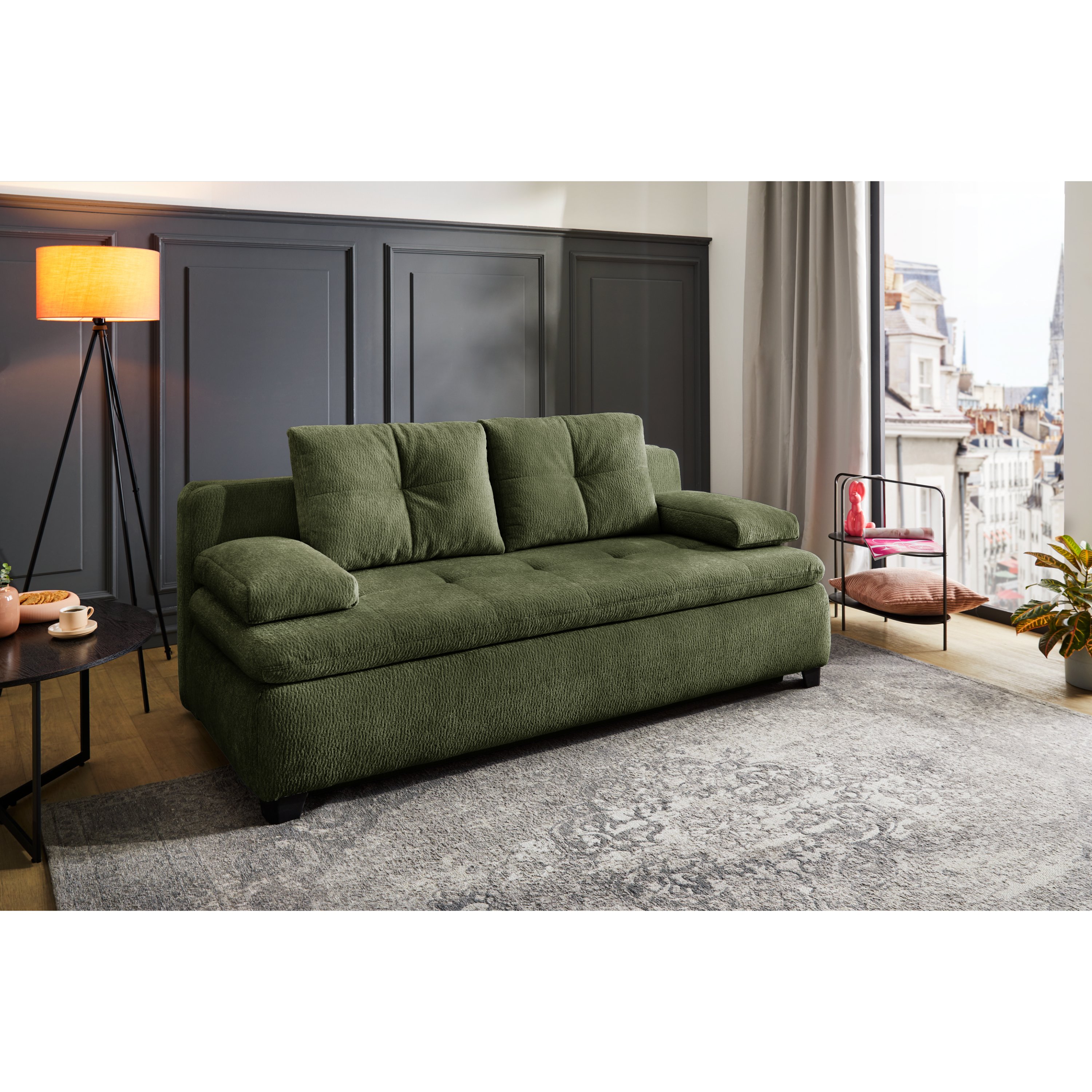 Pohovku můžete díky praktické rozkládací funkci přeměnit na dodatečné lůžko pro občasné přespání. Součástí konstrukce je také integrovaný úložný prostor, díky kterému může mít náhradní lůžkoviny a jiné předměty snadno přístupné. Celočalouněné provedení vám dovolí umístit pohovku dle dispozice interiéru.