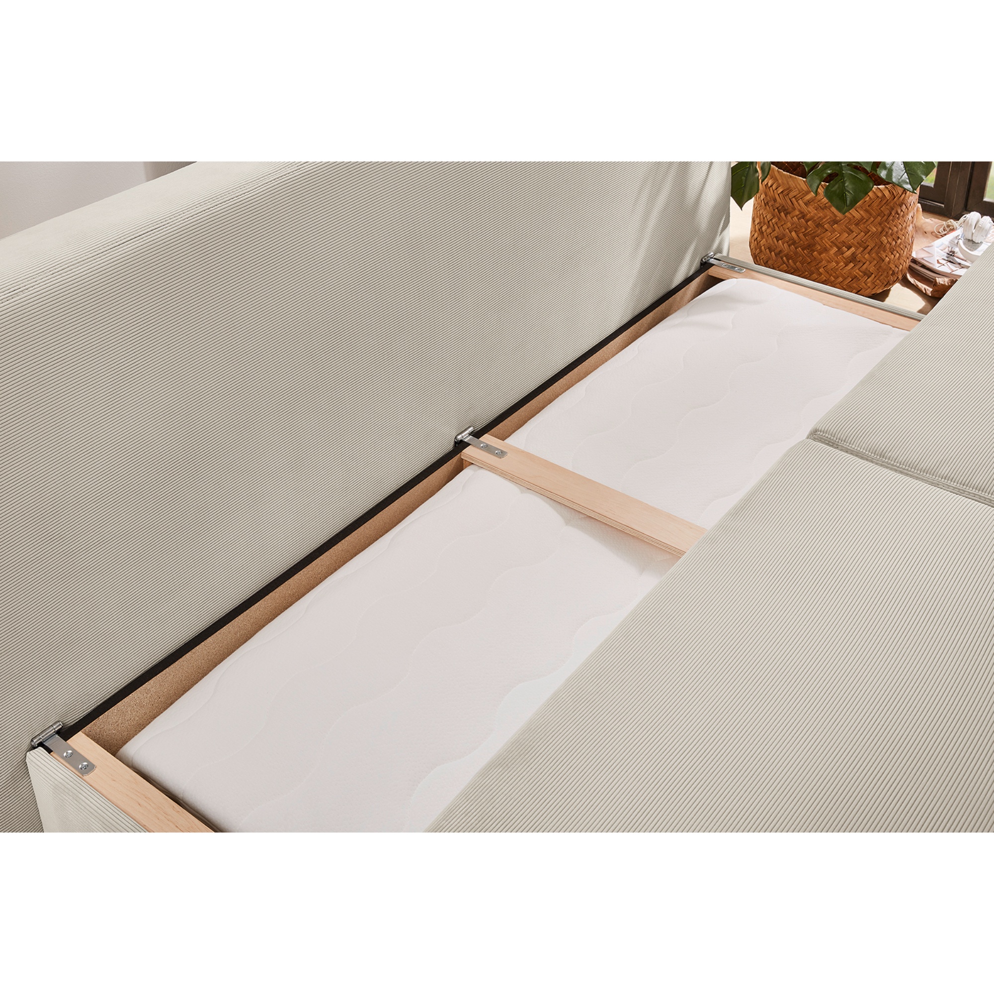 Zádové a područkové polštáře poskytnou měkkou oporu těla při sezení. Bezpochyby oceníte také její variabilitu, kdy ji můžete rozložit do lůžka v případě, že u vás potřebuje přespat návštěva. V úložném prostoru pod gaučem uschováte lůžkoviny, které tak budete mít v případě potřeby opět po ruce, i odnímatelné polštáře s dodávaným topperem, které navíc můžete využít i pro spaní.