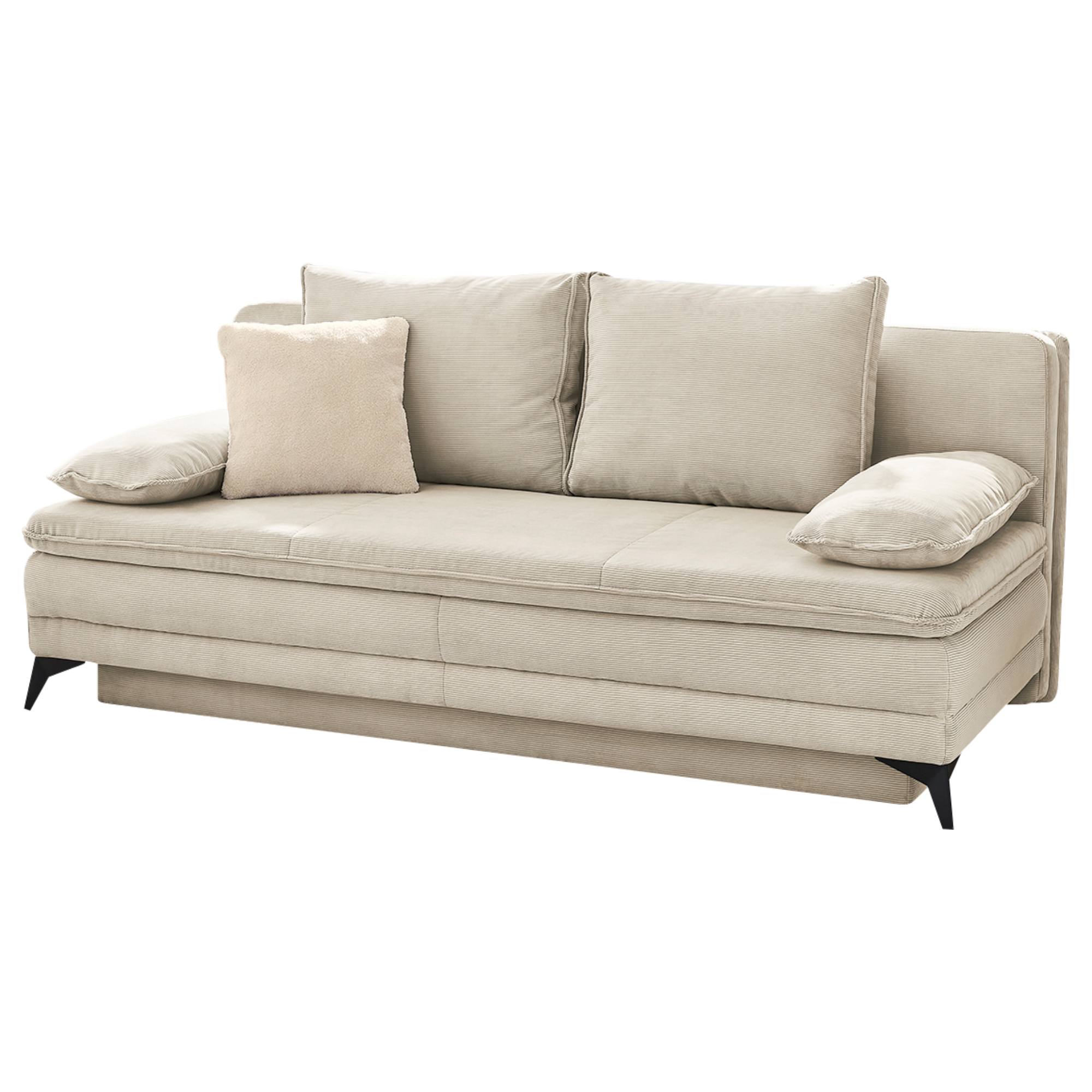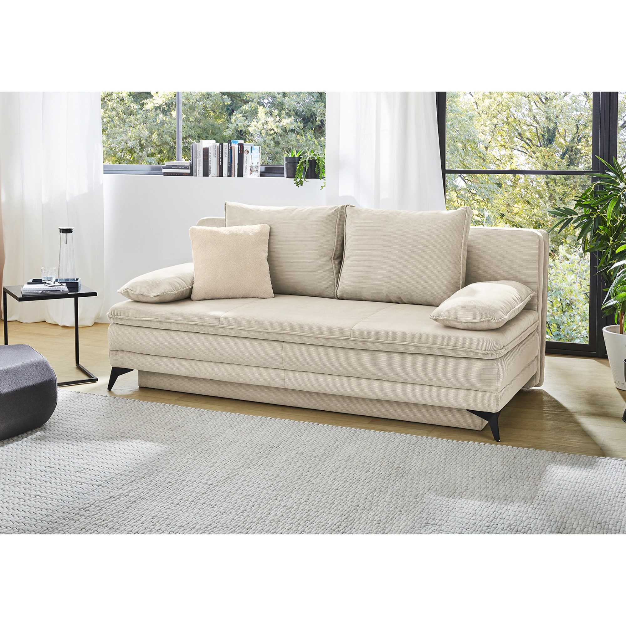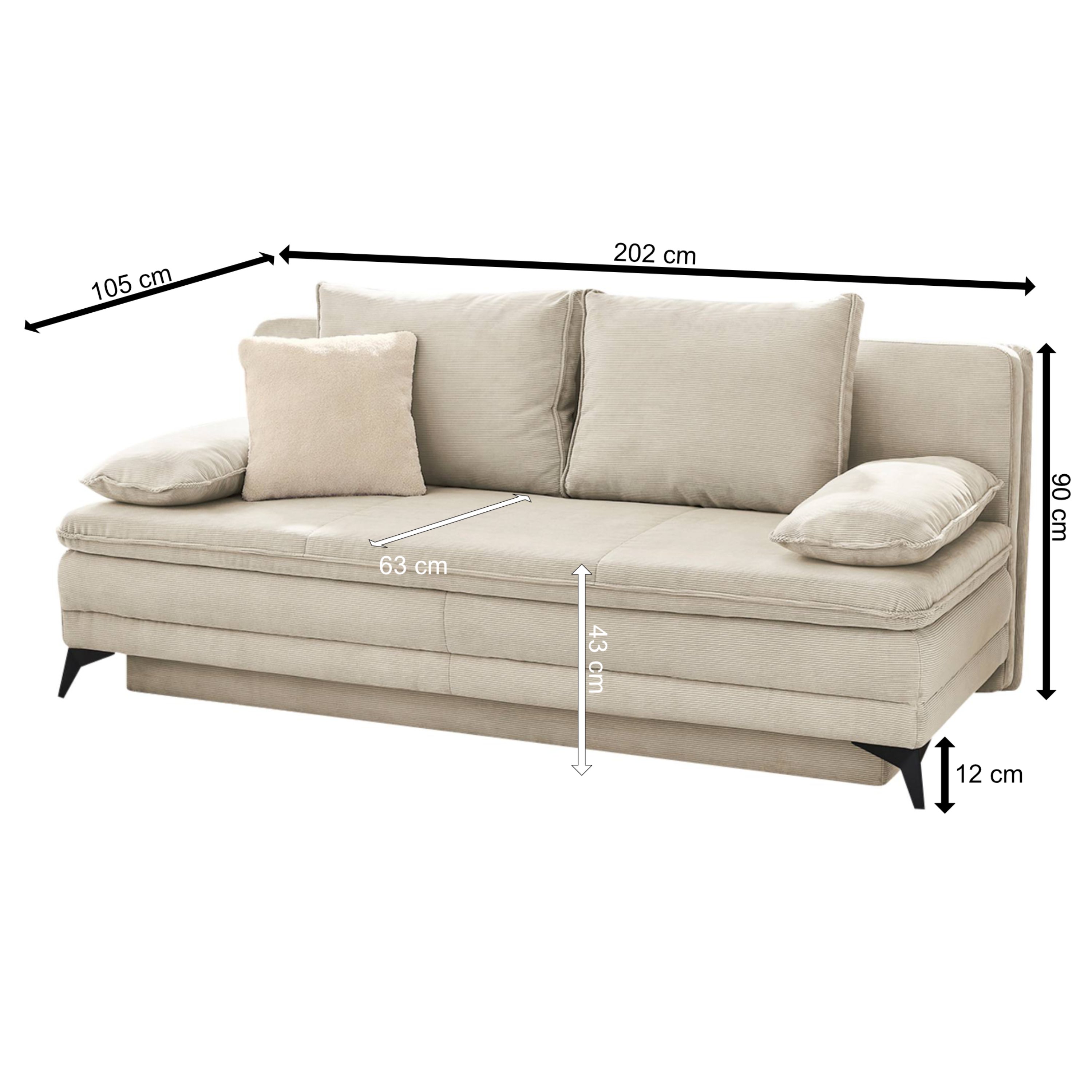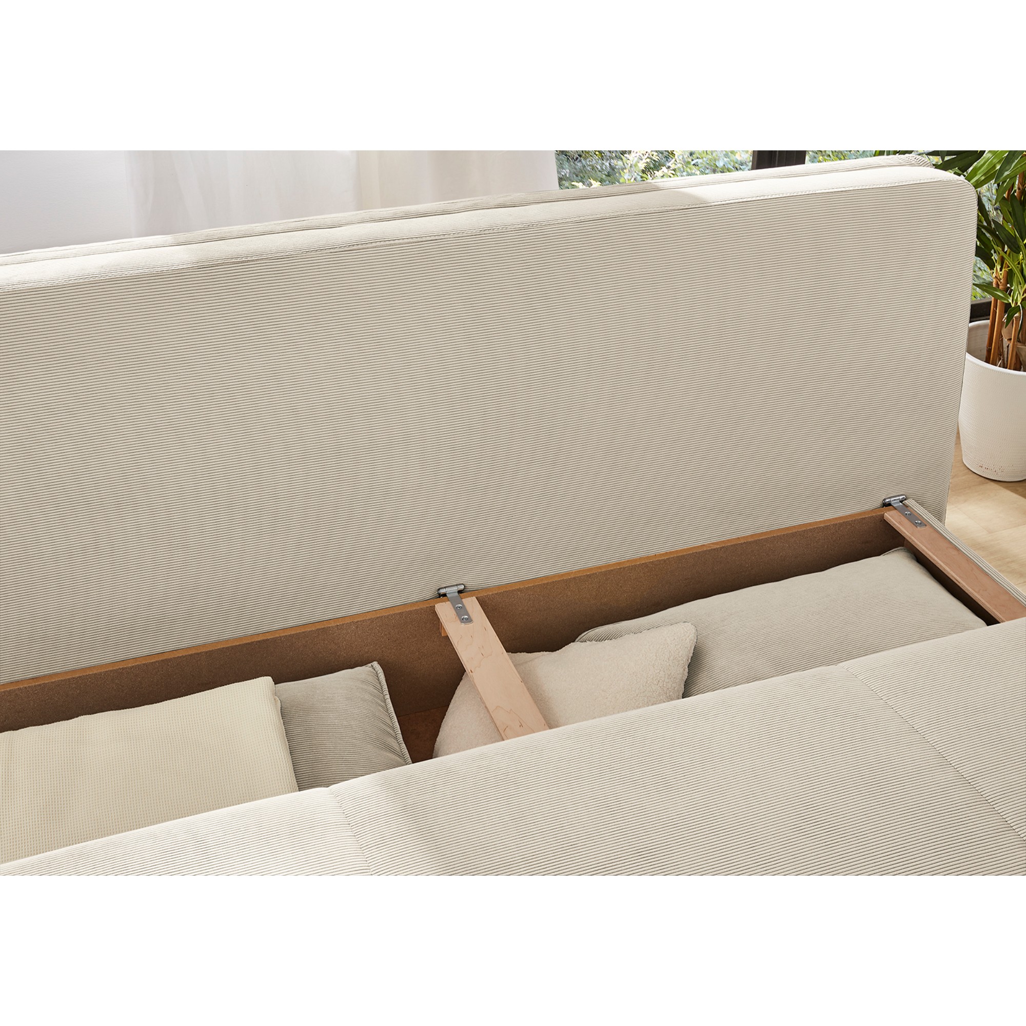 Pohovku s pěnovým jádrem a vlnovým odpružením na povrchu doplňuje topper vyrobený ze studené pěny, který je pevně všitý do celé plochy sedáku a lůžka. Ten vás během sezení i spánku udrží na jednom místě a zajistí potřebné pohodlí. Opěrnou část doplňují dva odnímatelné zádové polštáře, které vybízí k odpočinku. Ruce si můžete opřít o područkový polštář umístěný na každé straně pohovky. Vše je potaženo na dotek příjemnou hladkou tkaninou ze 100% polyesteru. Celou konstrukci podpírají černé kovové nohy. Pomocí mechanismu se sklopnými zády bez problému vytvoříte dodatečné lůžko pro občasné přespání. Pohovku nebo lůžko doplníte dekorativním polštářkem v neutrální barvě s plyšovým vzhledem. Součástí konstrukce je také úložný prostor pro uskladnění lůžkovin.