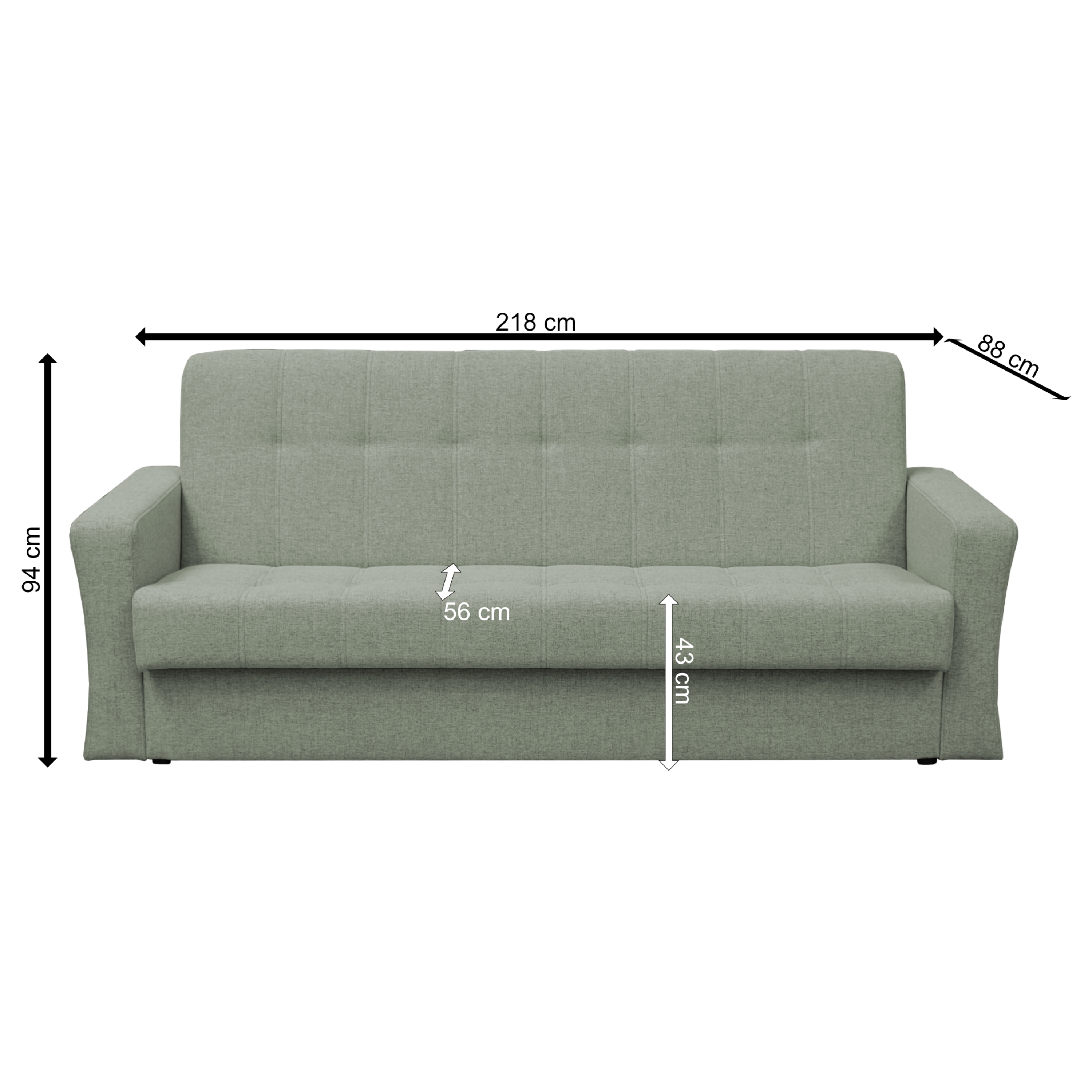Poskytne komfortní sezení až pro 3 osoby a stane se skvělým společníkem při odpolední siestě nebo večerní relaxaci. Díky systému Click-clack vytvoříte během chvilky z pohovky lůžko pro příležitostné přespání. V úložném prostoru pod sedákem můžete uschovat lůžkoviny nebo deky.