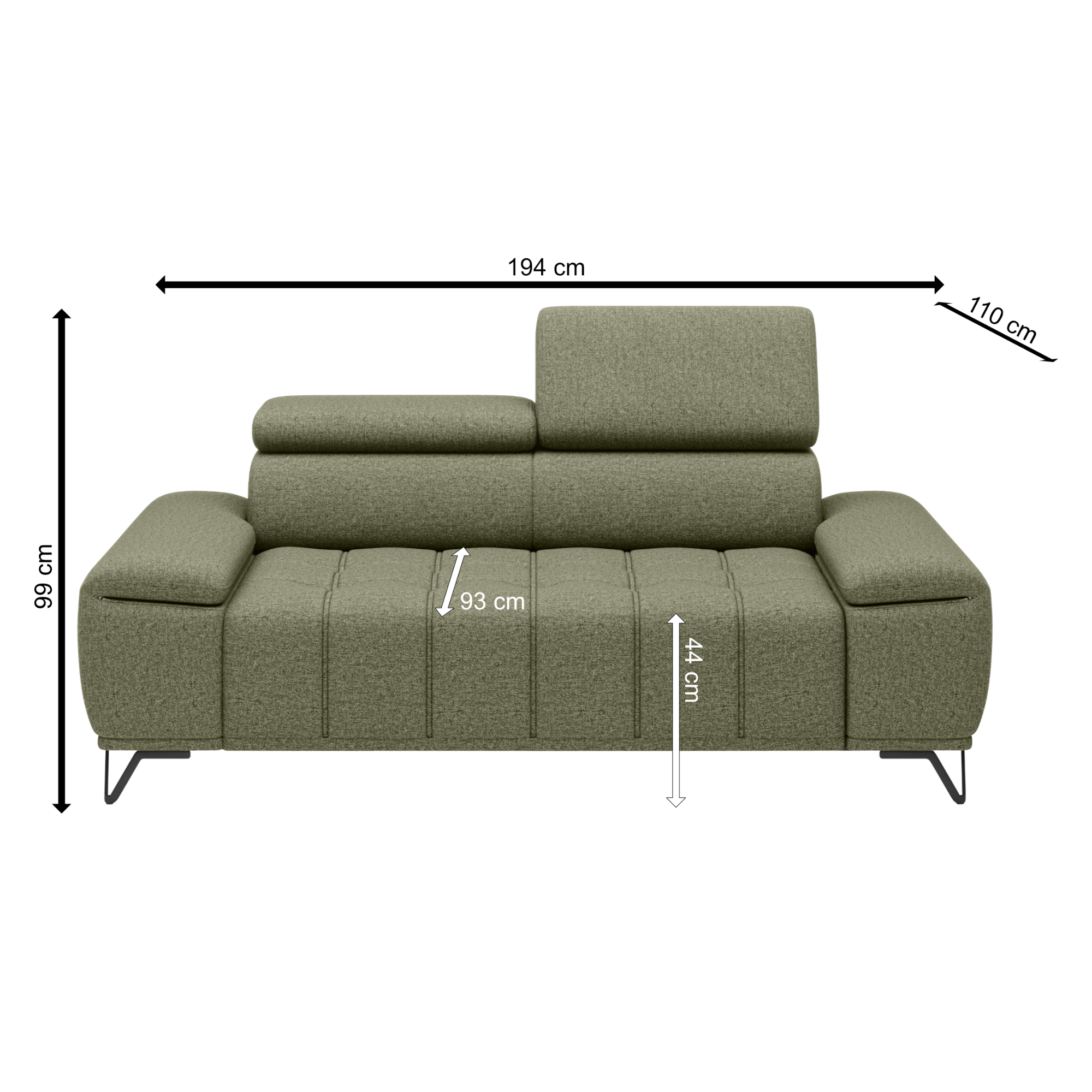 Svou velikostí poskytne dostatek prostoru pro komfortní sezení pro 2 osoby. O to pravé pohodlí se postarají polohovatelné opěrky hlavy a elektrický vysouvací systém sedáku. Stačí jen pouhé stisknutí tlačítka a můžete si upravit hloubku sedu z 66 cm na 93 cm. Tyto sofistikované funkce dovedou váš pocit z relaxace a odpočinku k dokonalosti. Vysoké kovové nožky oceníte i z praktického hlediska. Prostor pod gaučem zůstává snadno dostupný, a tak i podlaha pod ním se snadno udržuje v čistotě. Celočalouněné provedení vám dovolí umístit sedačku do prostoru i ke stěně.