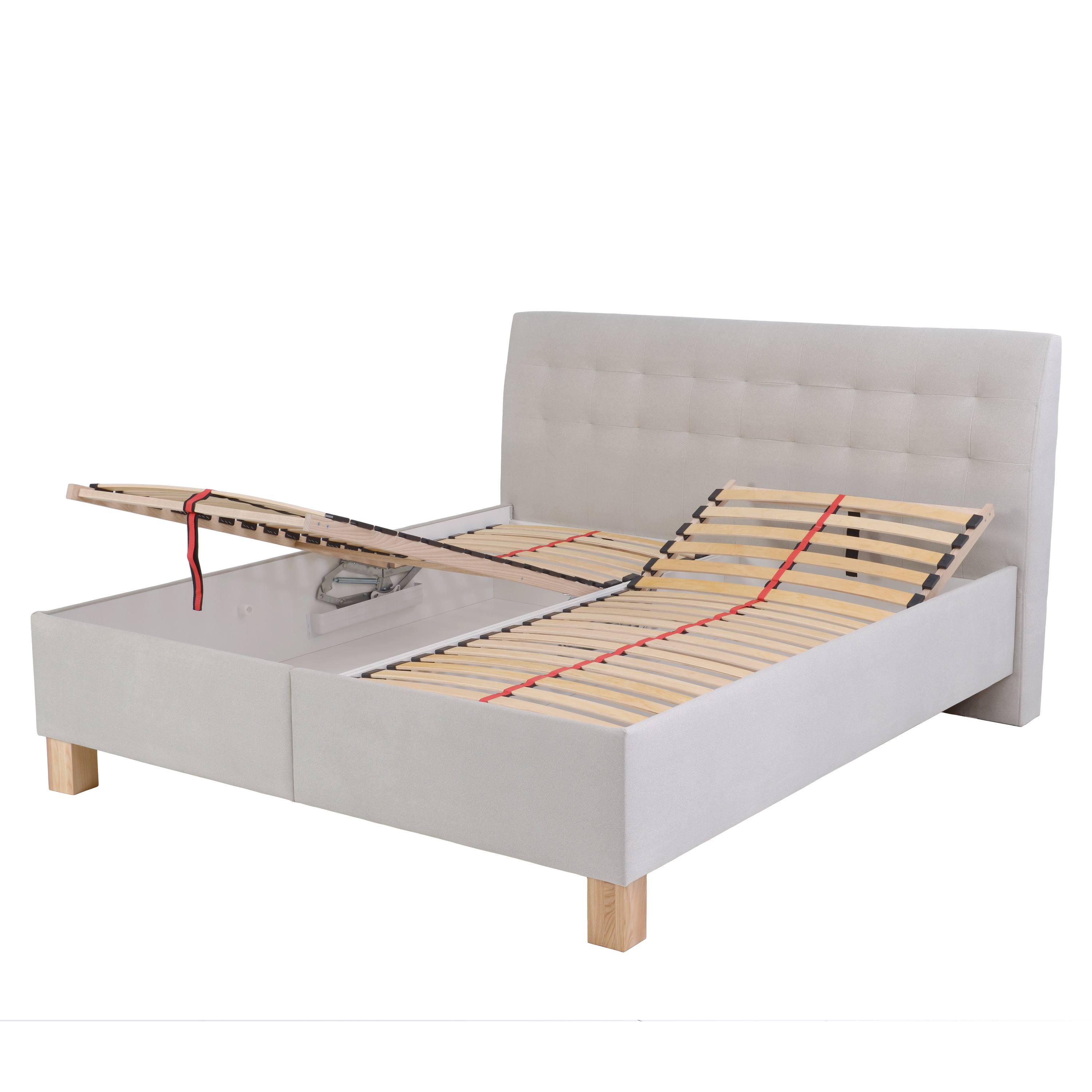 Dominantním prvkem je vysoké čelo s decentním dekorativním prošíváním, které kromě estetické funkce umožňuje pohodlné opření. Celkový vzhled postele podtrhují nohy z bukového dřeva v přírodním odstínu. Postel nabízí také praktický úložný prostor v rámu se snadným čelním přístupem.