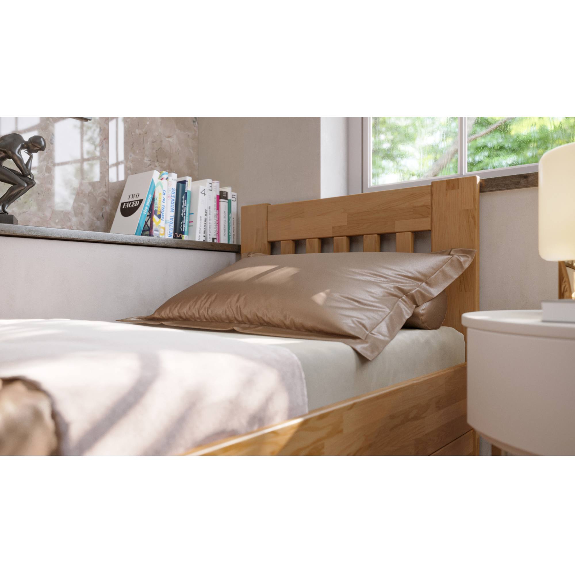 Konstrukce je vyrobena z kvalitního masivního dřeva, které se může pochlubit svojí pevností, odolností, vysokou nosností a dlouhou životností. Povrchová olejovaná úprava jeho životnost ještě prodlužuje a také zvyšuje odolnost proti oděru. Díky této úpravě nejsou škrábance tolik vidět a dají se snadněji odstranit. Postel je dodávána bez matrace a roštu, ale věříme, že si ty ideální pro zkompletování lůžka vyberete z našeho širokého sortimentu.