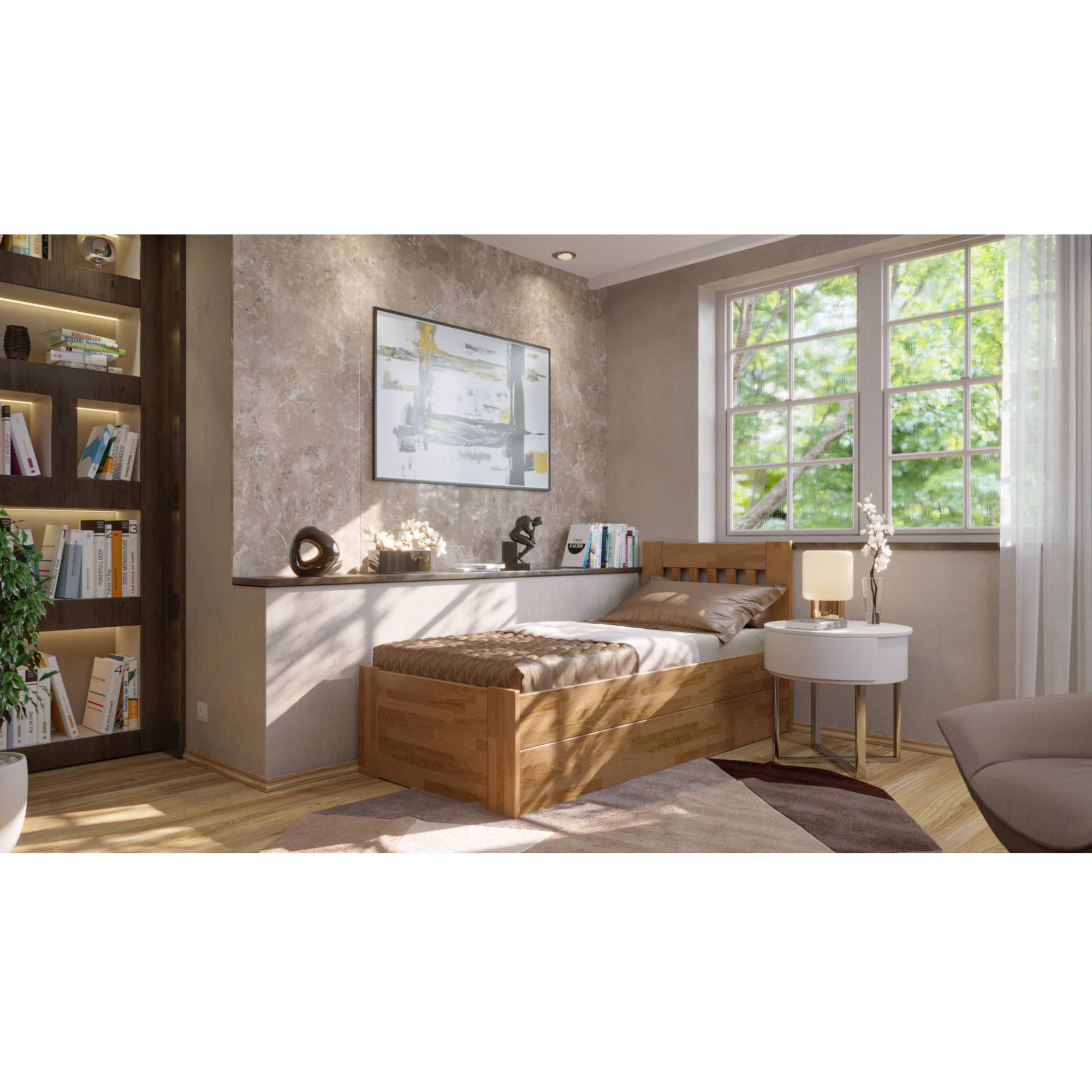 Jednolůžková postel APOLONIE BOX I se vzhledem ke svému minimalistickému, nadčasovému zpracování hodí téměř do jakéhokoli stylu interiéru. Je skvělou volbou do dětských či studentských pokojů, pokojů pro hosty a malých ložnic.