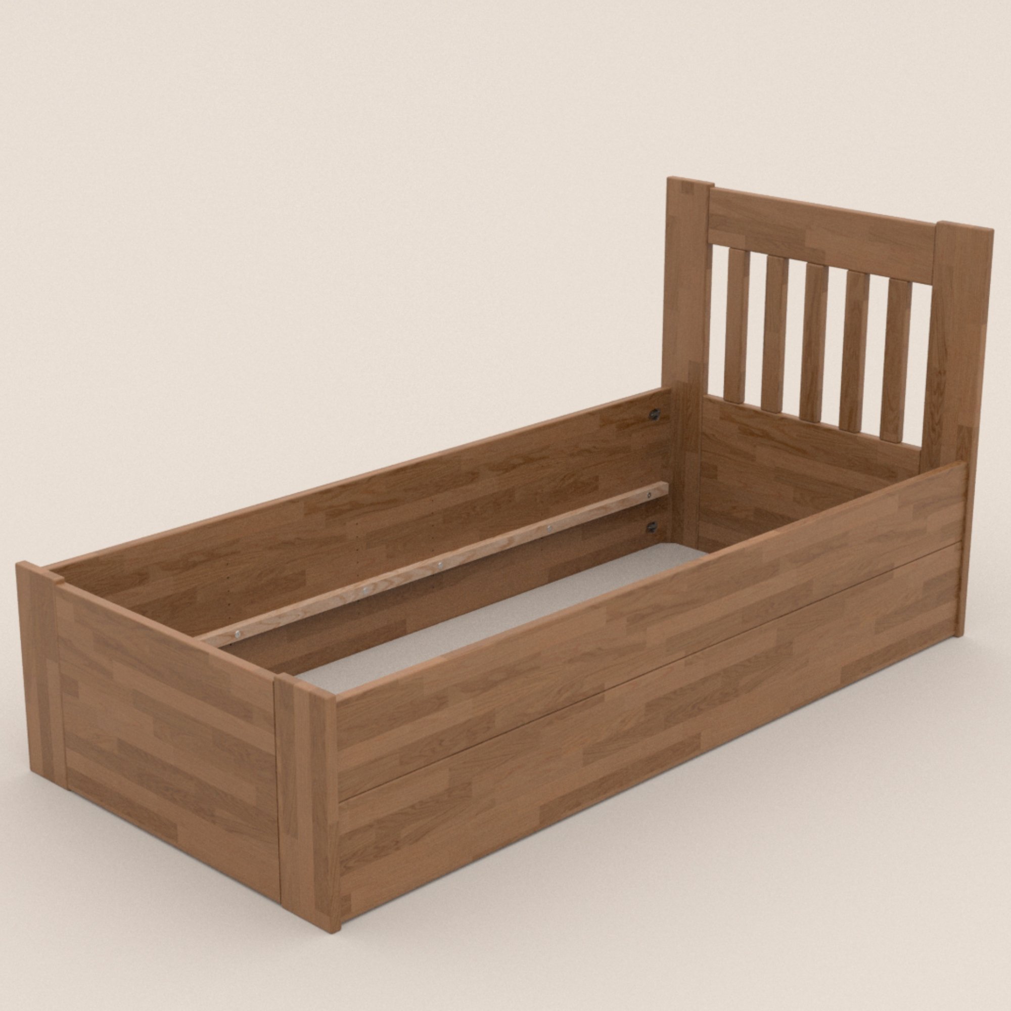 Konstrukce je vyrobena z kvalitního masivního dřeva, které se může pochlubit svojí pevností, odolností, vysokou nosností a dlouhou životností. Povrchová olejovaná úprava jeho životnost ještě prodlužuje a také zvyšuje odolnost proti oděru. Díky této úpravě nejsou škrábance tolik vidět a dají se snadněji odstranit. Postel je dodávána bez matrace a roštu, ale věříme, že si ty ideální pro zkompletování lůžka vyberete z našeho širokého sortimentu.