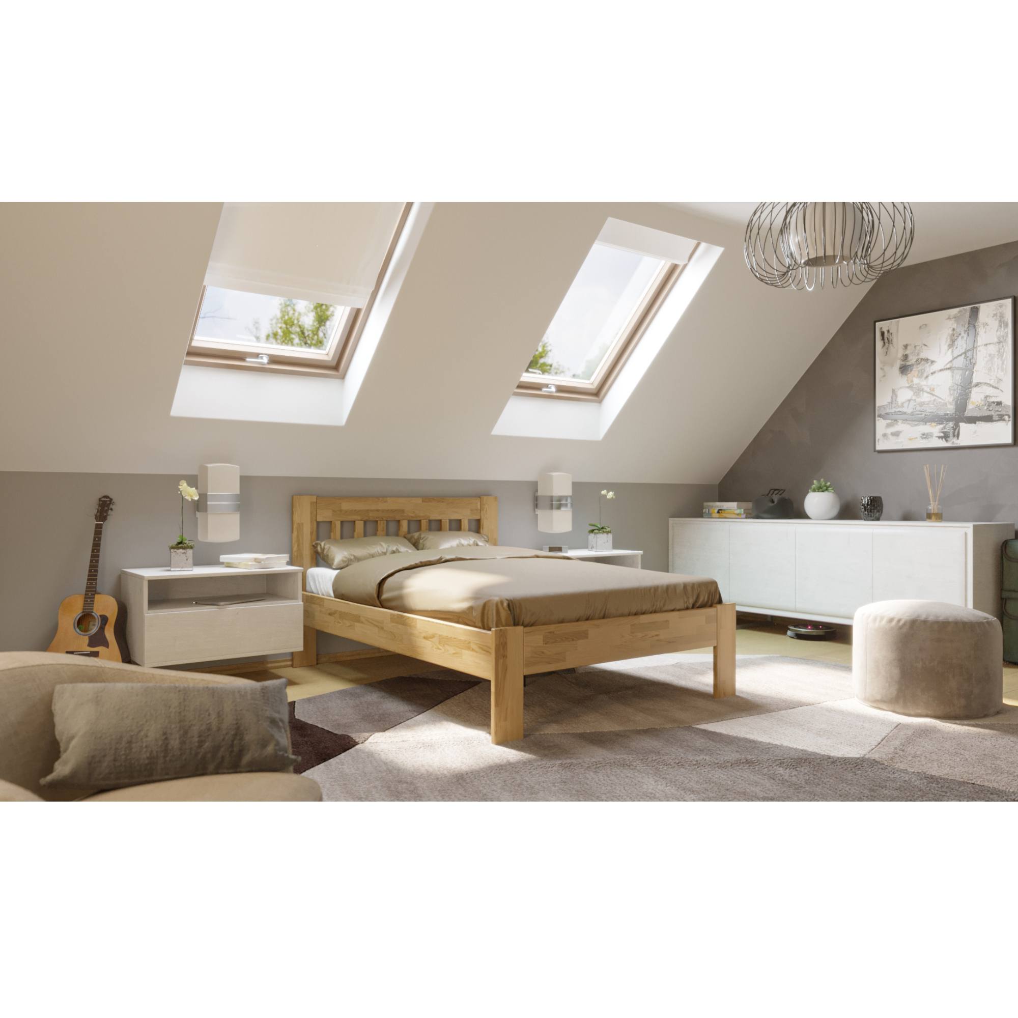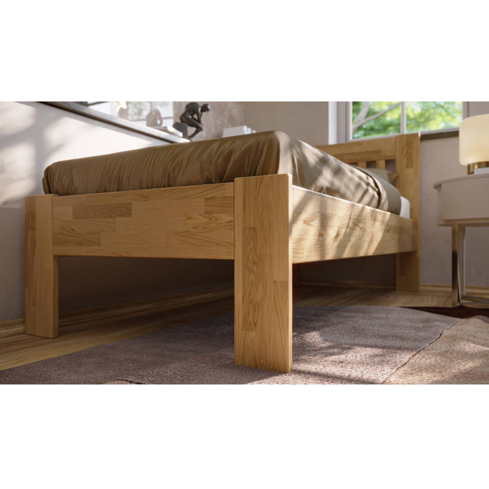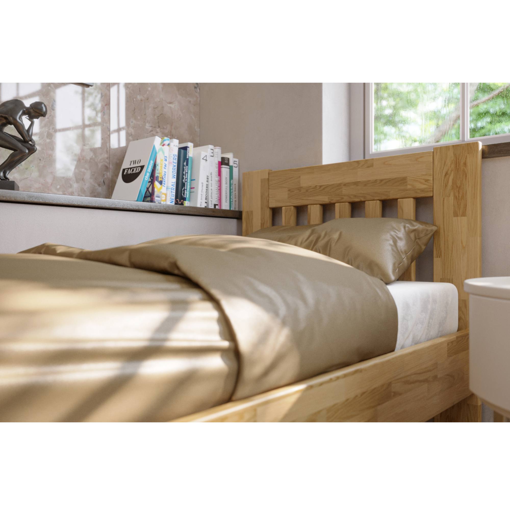 Konstrukce je vyrobena z kvalitního, masivního bukového či dubového dřeva v závislosti na jednotlivých variantách postele. Dřevo se může pochlubit svojí pevností, odolností, vysokou nosností a dlouhou životností. Povrchová olejovaná úprava jeho životnost ještě prodlužuje a také zvyšuje odolnost proti oděru. Díky této úpravě nejsou škrábance tolik vidět a dají se snadněji odstranit. Pod postelí se vám bude snadno uklízet díky vysokým, pevným noháma projede pod ní i robotický vysavač. Postel je dodávána bez matrace a roštu, ale věříme, že si ty ideální pro zkompletování lůžka vyberete právě z našeho širokého sortimentu.
