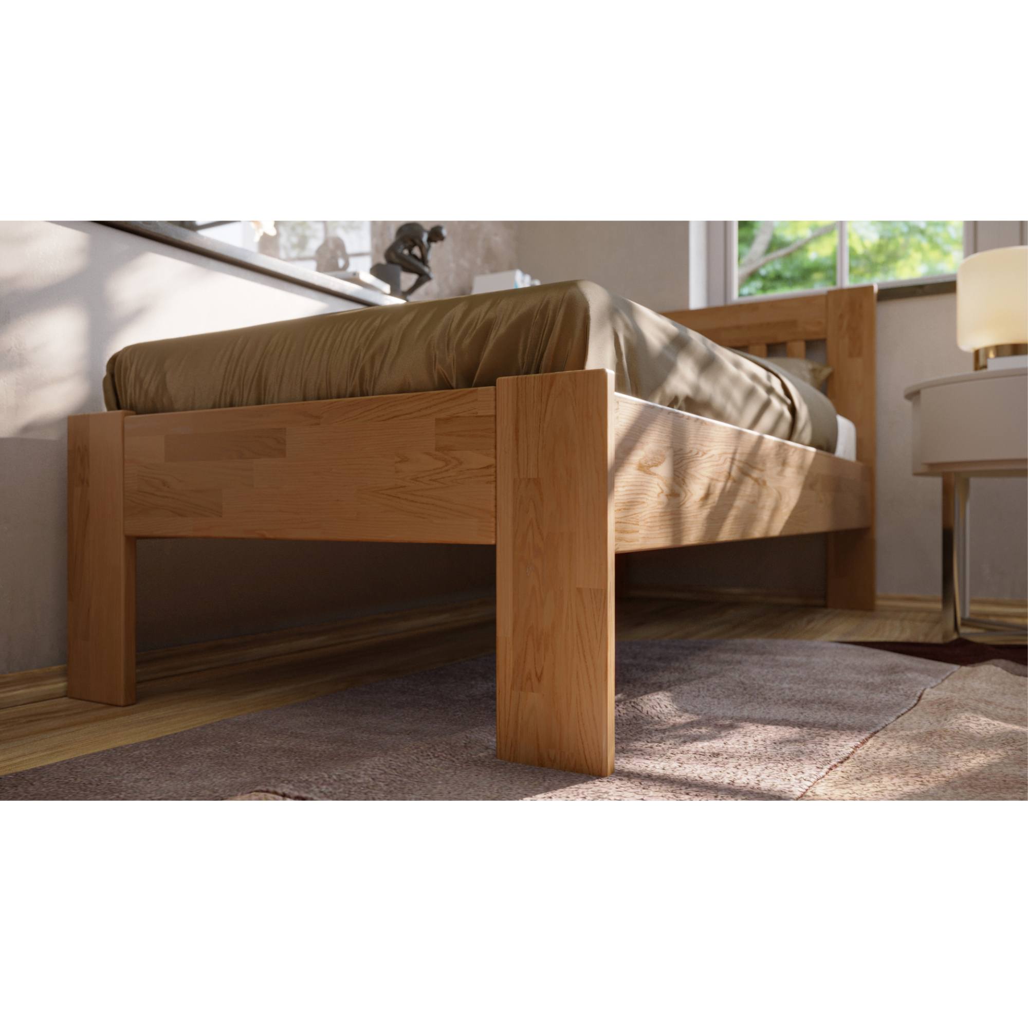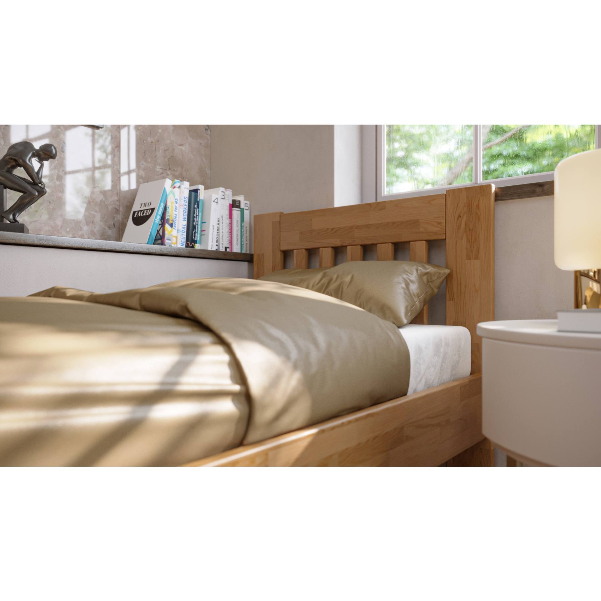 Konstrukce je vyrobena z kvalitního, masivního bukového či dubového dřeva v závislosti na jednotlivých variantách postele. Dřevo se může pochlubit svojí pevností, odolností, vysokou nosností a dlouhou životností. Povrchová olejovaná úprava jeho životnost ještě prodlužuje a také zvyšuje odolnost proti oděru. Díky této úpravě nejsou škrábance tolik vidět a dají se snadněji odstranit. Pod postelí se vám bude snadno uklízet díky vysokým, pevným noháma projede pod ní i robotický vysavač. Postel je dodávána bez matrace a roštu, ale věříme, že si ty ideální pro zkompletování lůžka vyberete právě z našeho širokého sortimentu.