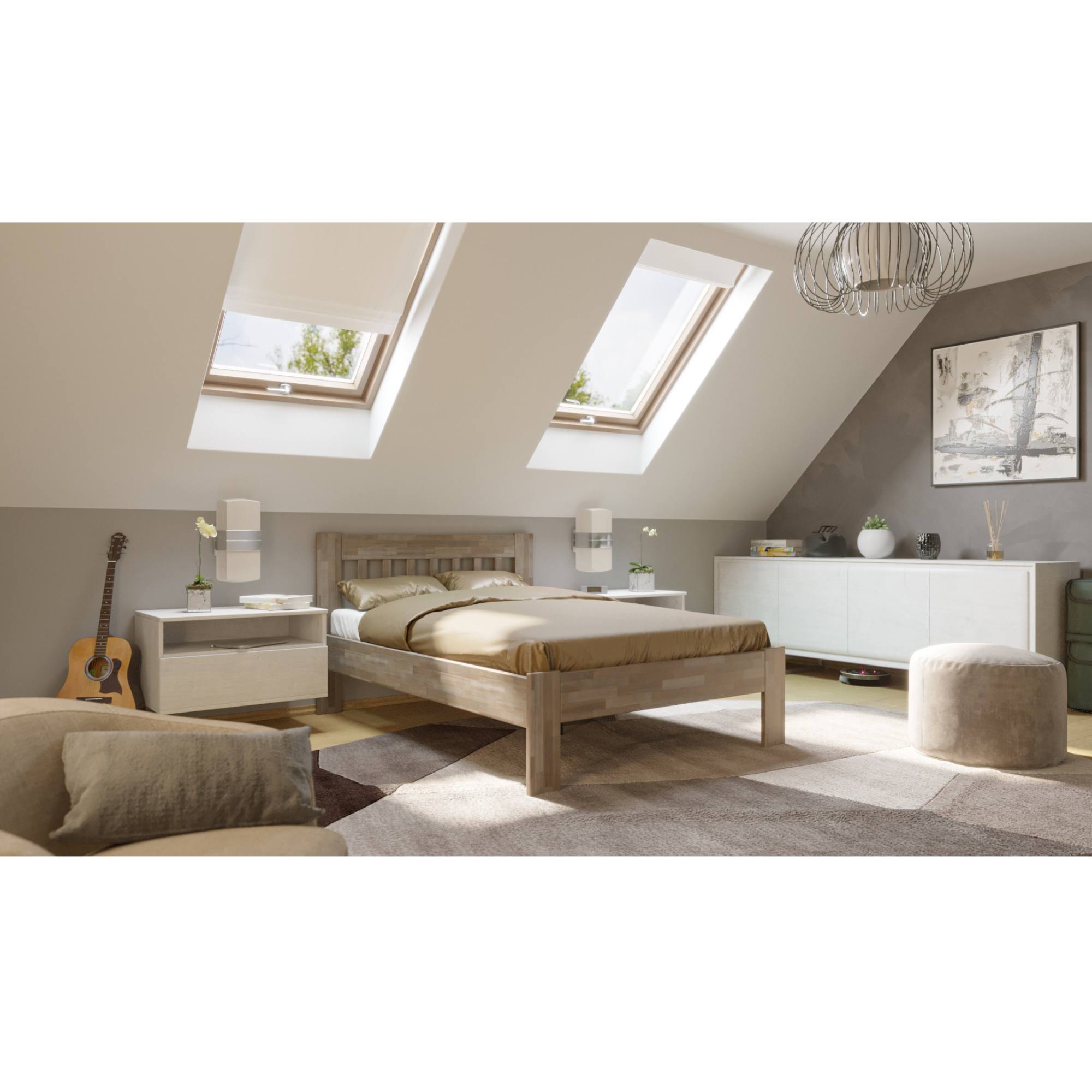 Dřevěná konstrukce zajišťuje pevnost, odolnost, vysokou nosnost a delší životnost postele. Povrchová olejovaná úprava dodává na odolnosti proti oděru. Díky ní nejsou škrábance na první pohled viditelné a dají se odstranit čištěním či lokální opravou. Vysoké, dřevěné nohy zajišťují celkovou stabilitu postele a prostor pod ní můžete snadno uklidit pomocí robotického vysavače. Matraci a rošt je nutné dokoupit samostatně, ale věříme, že si ty perfektní přímo pro vás vyberete z našeho širokého sortimentu.