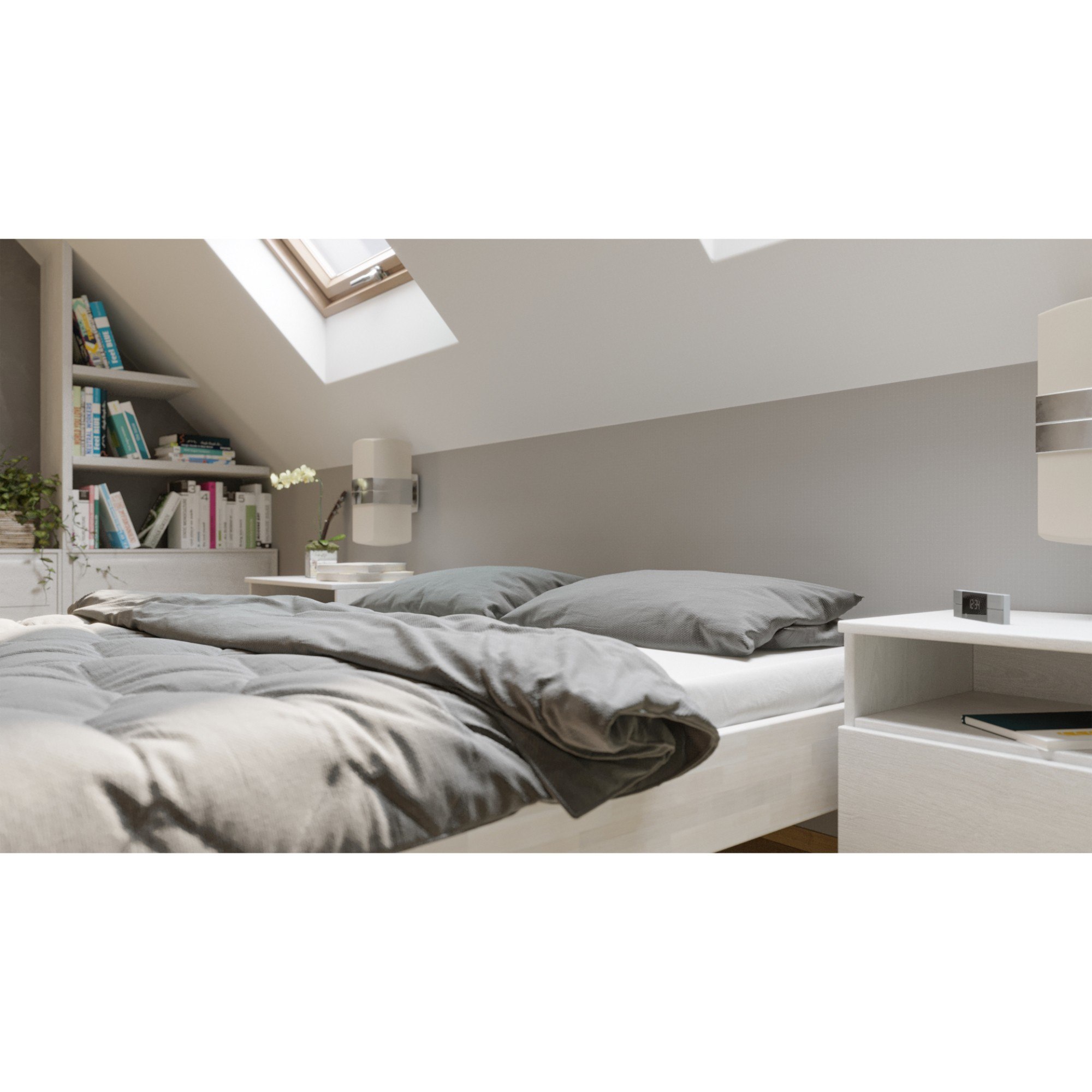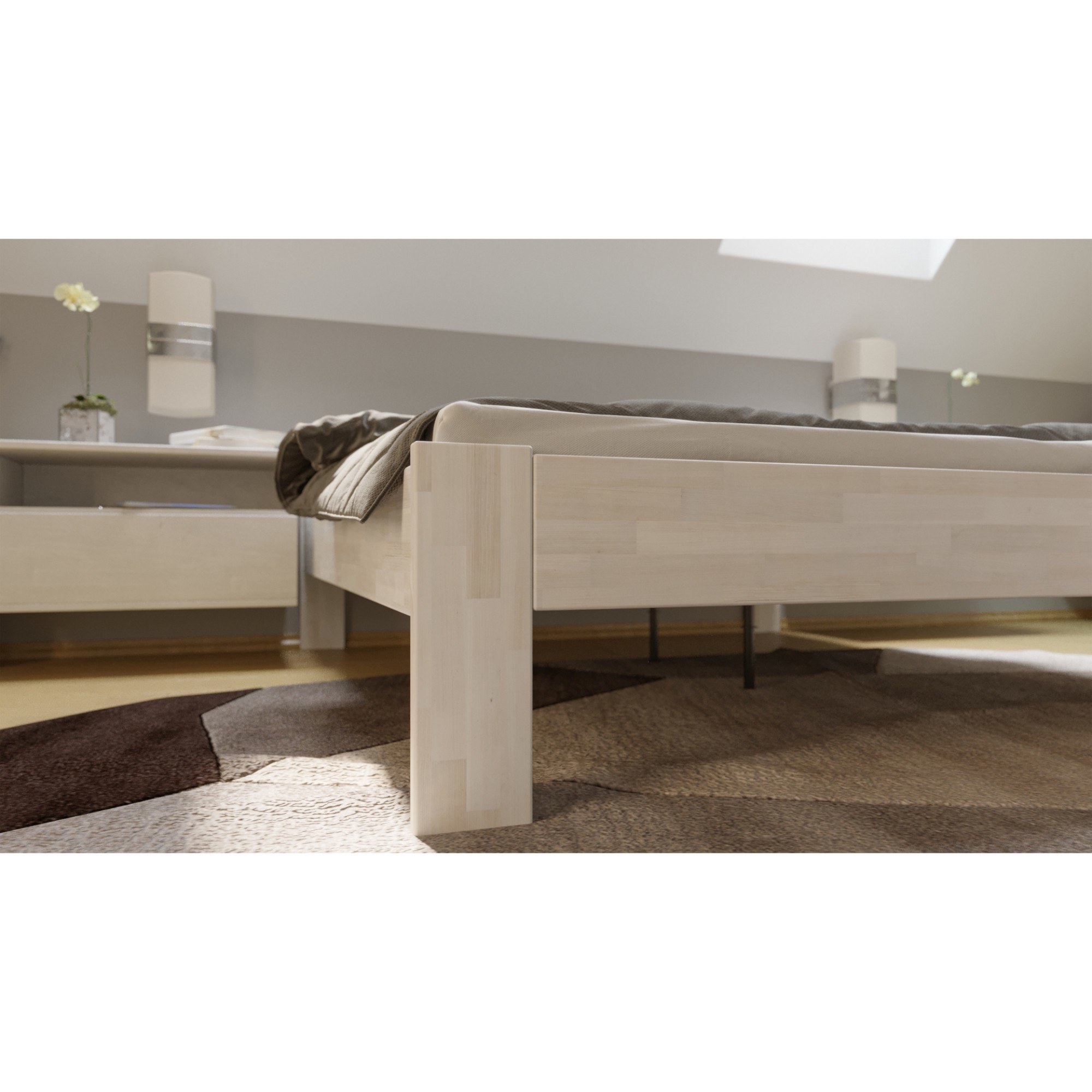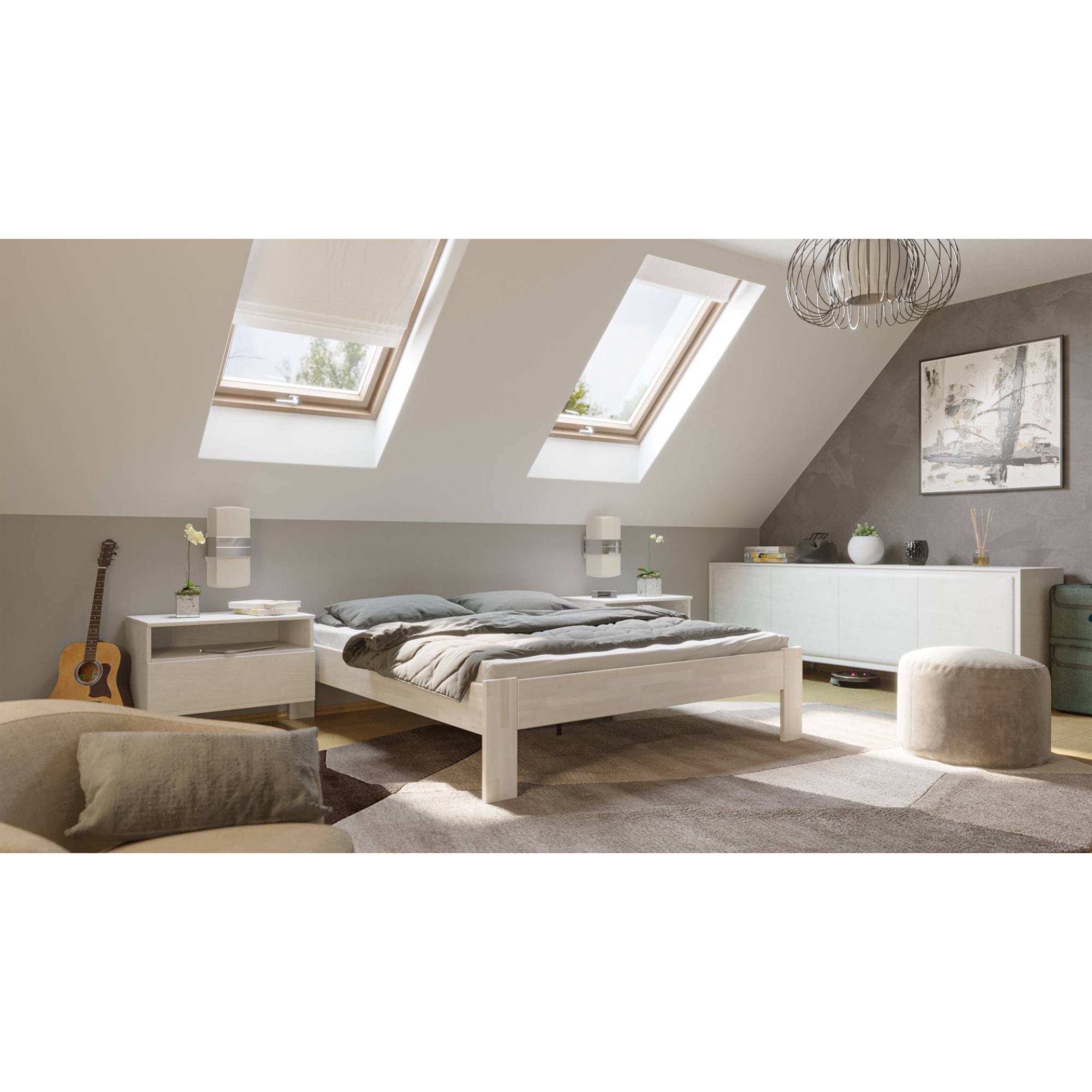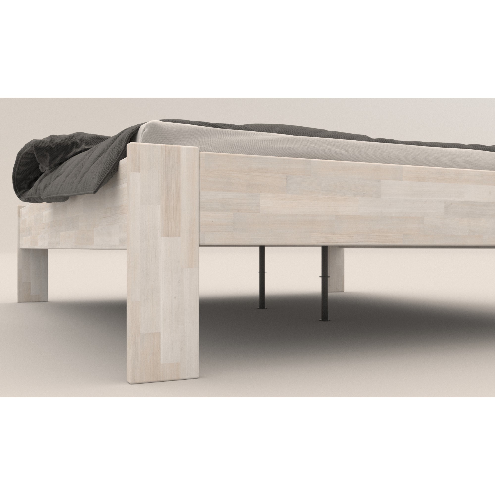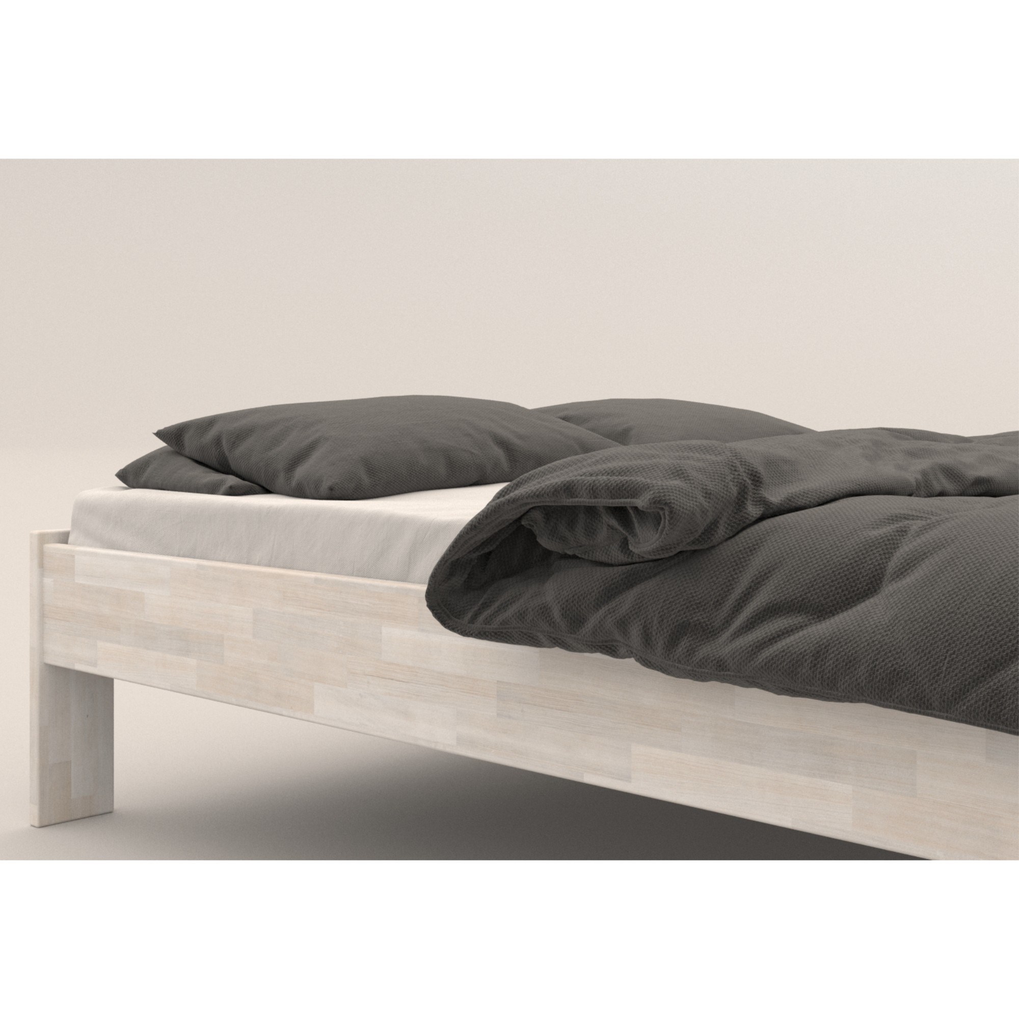 - Doplňující poznámka: Postel z bukového masivního dřeva je mořená do bílého odstínu. Nosnost 130 kg pro jednu ložnou plochu.