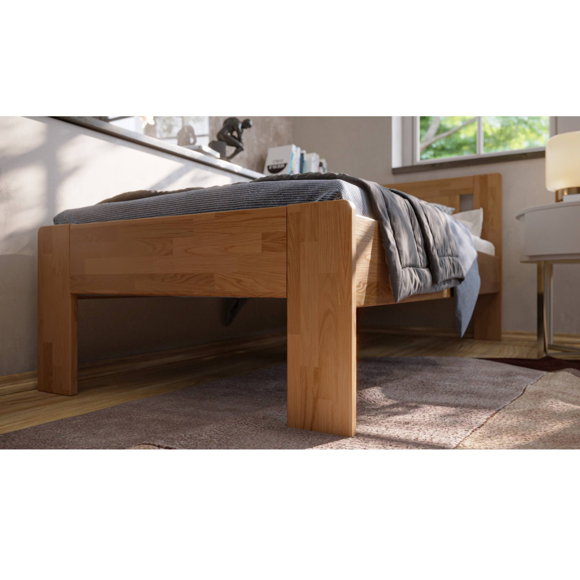 Konstrukce je vyrobena z masivního bukového či dubového dřeva, zaleží jen na vás, jaký typ dřeva si vyberete. Dřevo se může pochlubit svojí pevností, odolností, vysokou nosností a dlouhou životností. Povrchová olejovaná úprava jeho životnost ještě prodlužuje a také zvyšuje odolnost proti oděru. Díky této úpravě nejsou škrábance tolik vidět a dají se snadněji odstranit. Pod postelí se vám bude snadno uklízet díky vysokým, pevným nohám. Postel je dodávána bez matrace a roštu, ale věříme, že si ty ideální pro zkompletování lůžka vyberete z našeho širokého sortimentu.