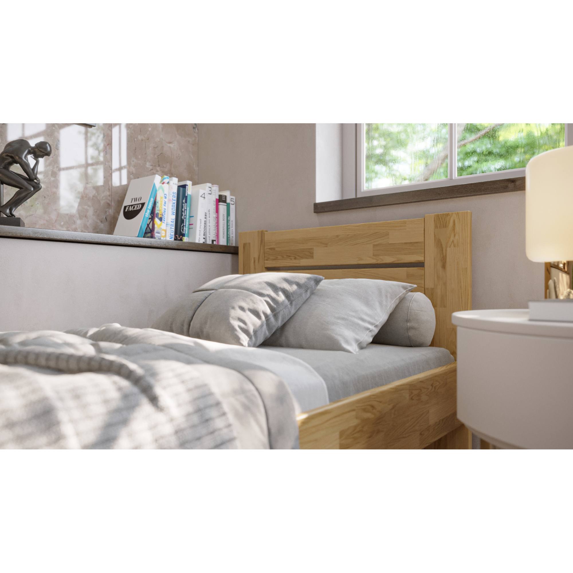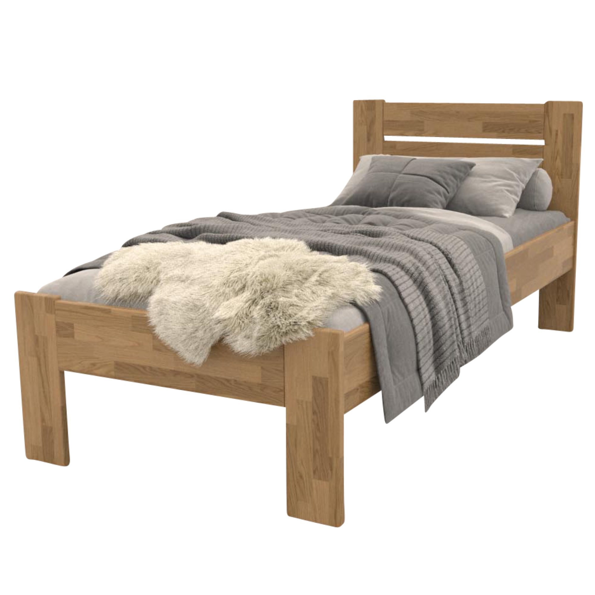 Vyrobena je z masivního bukového a dubového dřeva, zaleží jen na vás, jaký typ dřeva si vyberete. Masivní dřevo má vysokou nosnost, odolnost a dlouhou životnost. Povrchová olejová úprava jeho životnost ještě prodlužuje a zároveň poskytuje odolnost proti oděru. Pohodlné opření během odpočinku zajišťuje vyšší čelo. O celkovou stabilitu postele se starají pevné dřevěné nohy, které zároveň umožňují snadný úklid pod postelí. Postel je dodávána bez matrace a roštu, ale věříme, že si ty ideální vyberete z našeho širokého sortimentu a vytvoříte kompletní lůžko dle vašich představ.