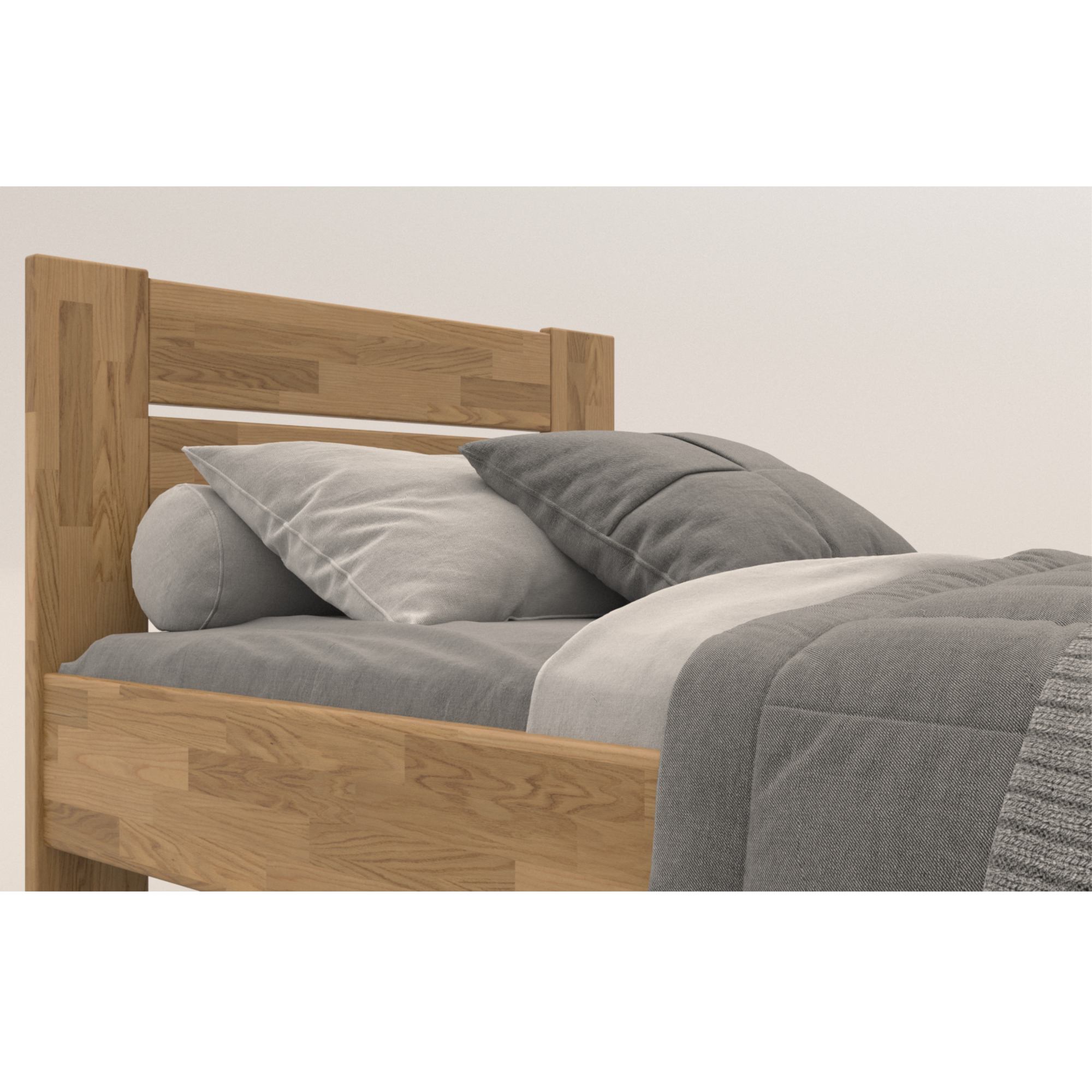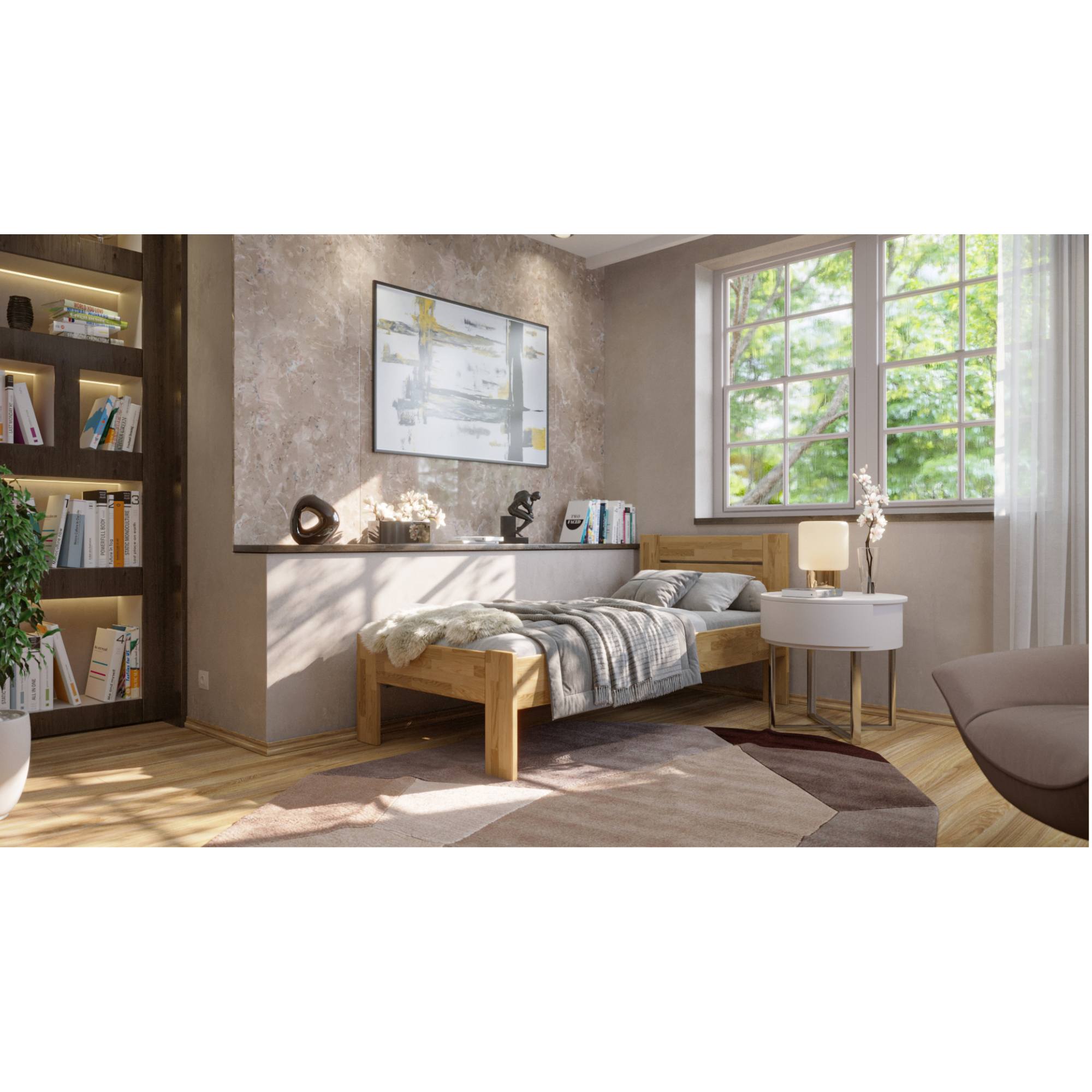 Vyrobena je z masivního bukového a dubového dřeva, zaleží jen na vás, jaký typ dřeva si vyberete. Masivní dřevo má vysokou nosnost, odolnost a dlouhou životnost. Povrchová olejová úprava jeho životnost ještě prodlužuje a zároveň poskytuje odolnost proti oděru. Pohodlné opření během odpočinku zajišťuje vyšší čelo. O celkovou stabilitu postele se starají pevné dřevěné nohy, které zároveň umožňují snadný úklid pod postelí. Postel je dodávána bez matrace a roštu, ale věříme, že si ty ideální vyberete z našeho širokého sortimentu a vytvoříte kompletní lůžko dle vašich představ.