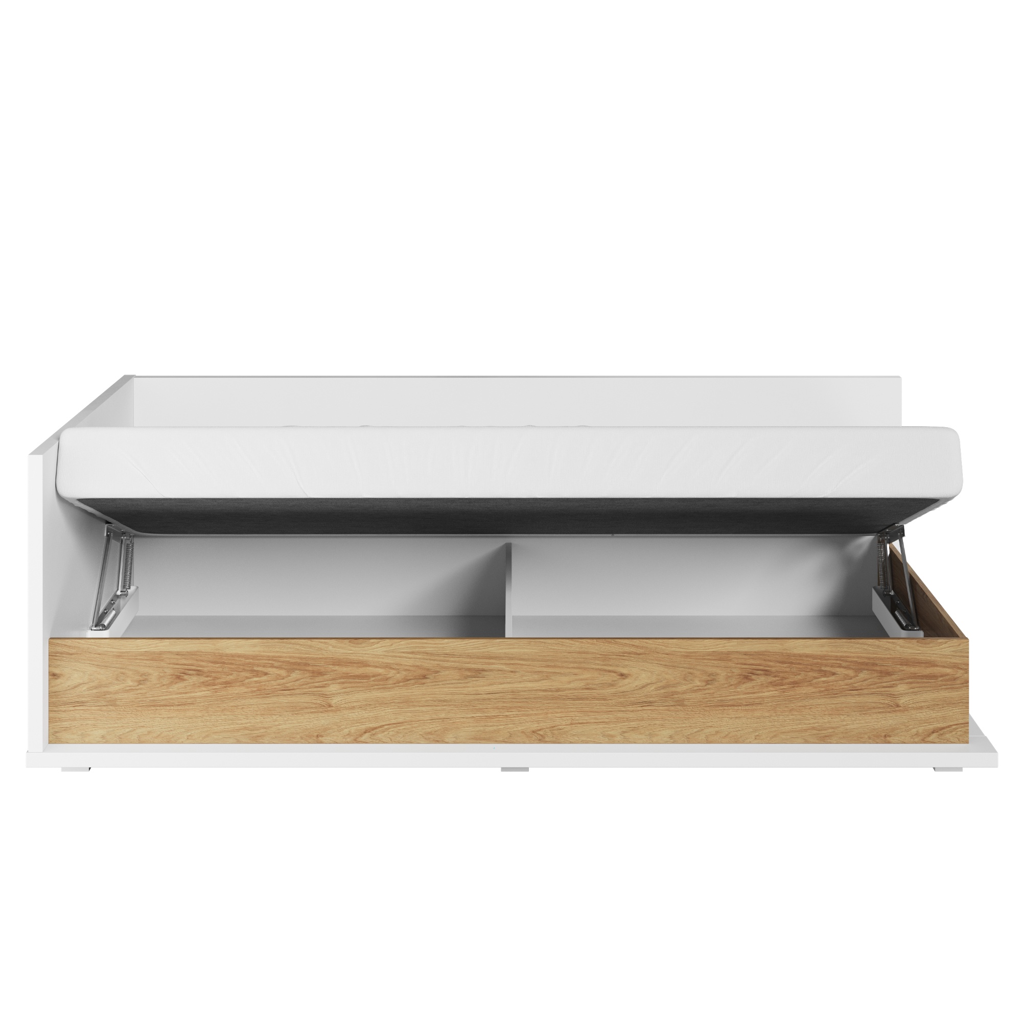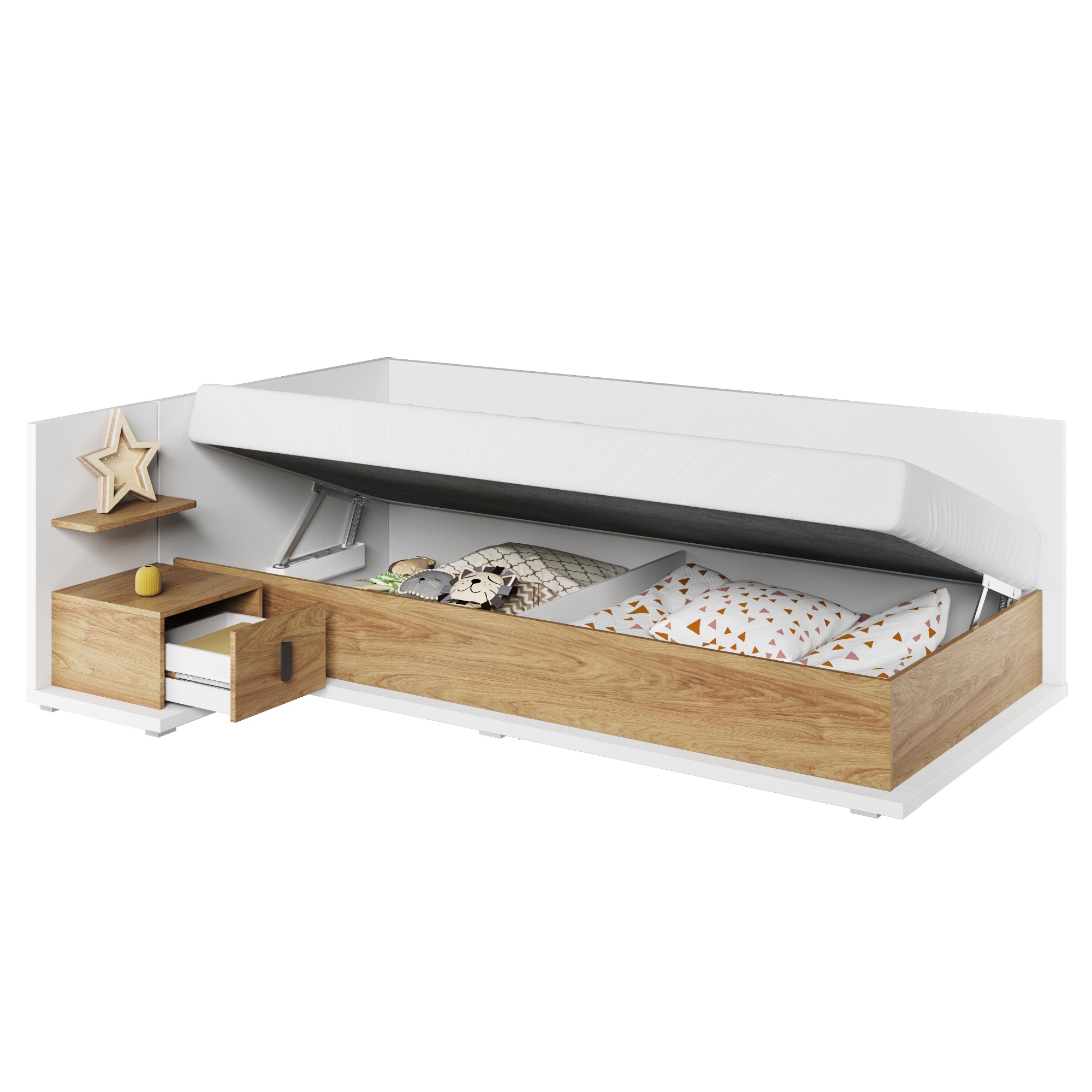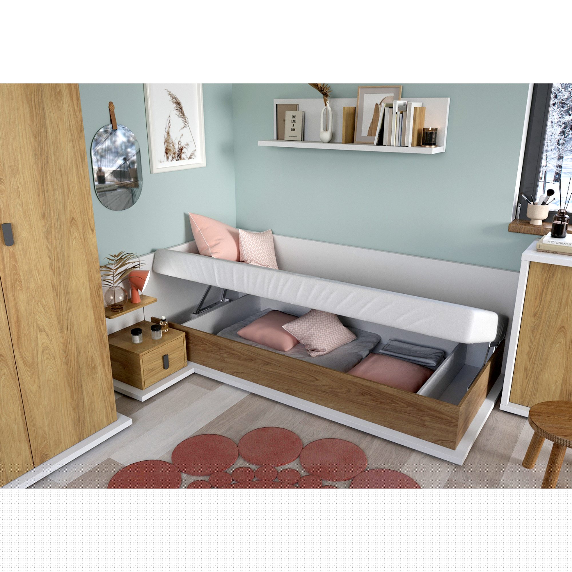 Úložný prostor pod zabudovaným lůžkem poskytuje dostatek místa pro lůžkoviny. Výklopný systém umožňuje snadnou manipulaci a díky tomu bude každodenní úklid peřin hračkou. Postel je dodávána jako kompletní lůžko včetně roštu a matrace s pružinovým bonelovým jádrem.