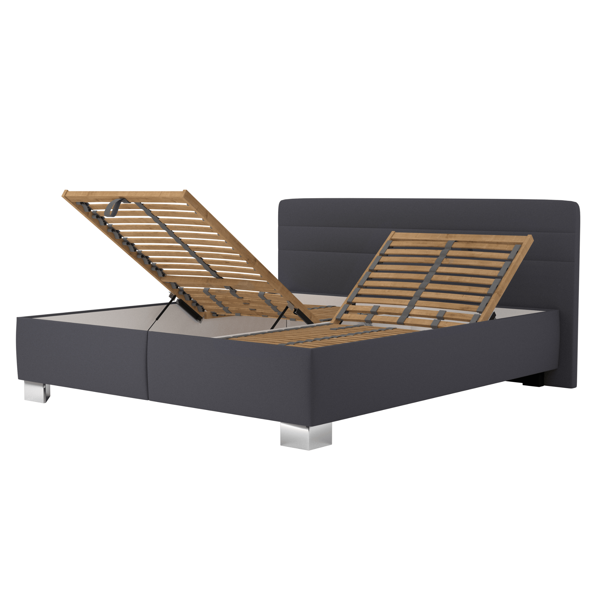 Konstrukce je potažena hladkou a na dotek příjemnou tkaninou ze 100% polyesteru. Vyšší čelo s decentním prošíváním je ideální pro komfortní opření během večerního odpočinku a zároveň chrání stěnu za postelí. Dodávána je včetně polyuretanových matrací o výšce cca 21 cm se snímatelným potahem, u kterých si můžete pouhým otočením vybrat mezi tužší a měkčí stranou. Součástí postele je také polohovací lamelový rošt s 28 lamelami umožňující nastavení tuhosti v bederní části a přizpůsobení se tak vašemu tělu. Polohu lze nastavit v oblasti hlavy a nohou pro co nejpohodlnější ležení. Středový popruh chrání proti přetížení a dělá rošt pevnější a stabilnější. Rošt snadno odklopíte pomocí pístů a otevřete tak úložný prostor ukrytý v rámu postele. Celou konstrukci doplňují nižší nohy, které posteli dodávají potřebnou stabilitu.