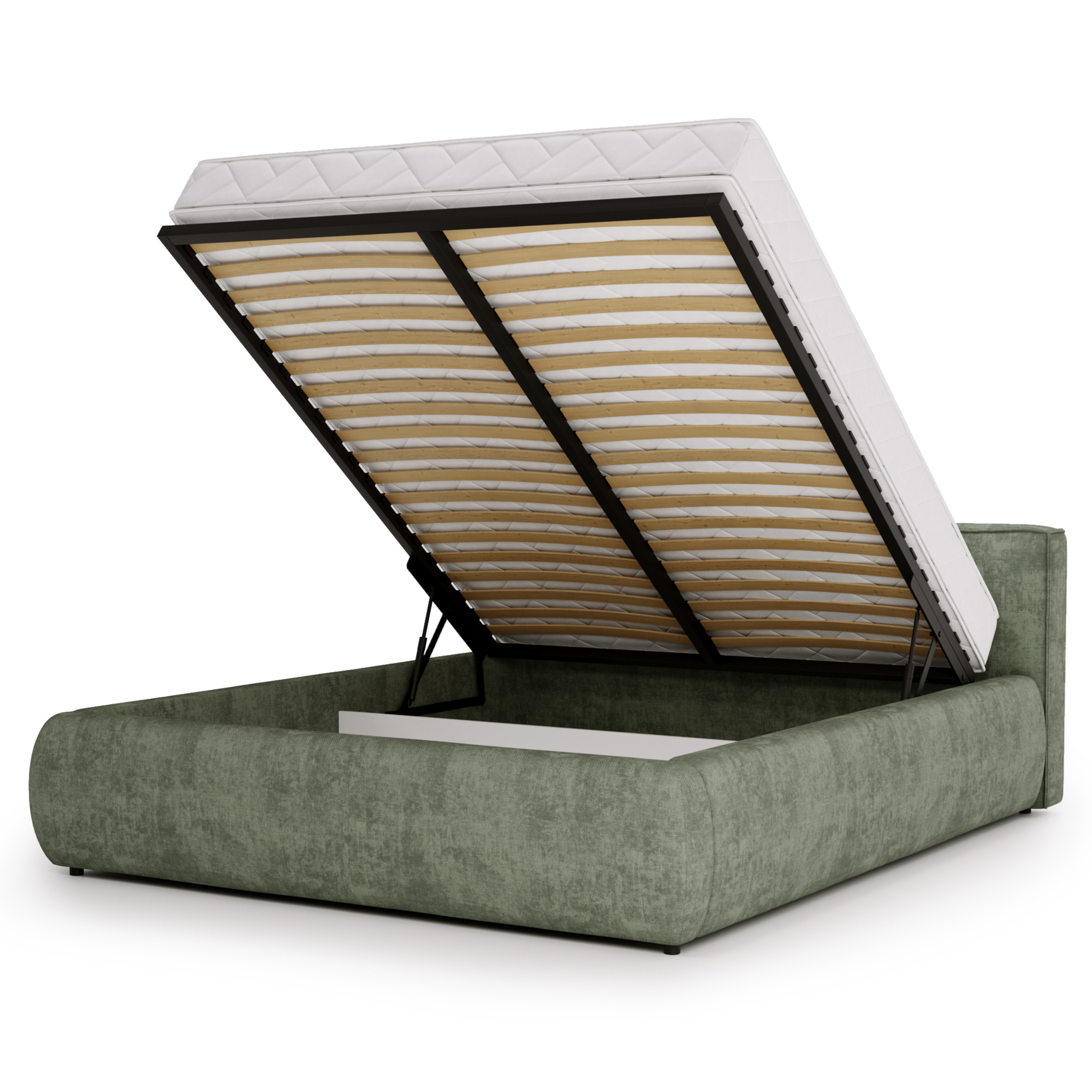Pro skladování aktuálně nepoužívaných lůžkovin a dalších předmětů můžete využít úložný prostor v rámu postele, který je snadno přístupný díky čelnímu výklopu kovového rámu s lamelovým roštem. Součástí postele je také komfortní 7-zónová matrace s jádrem z taštičkových pružin v kombinaci s pěnovými vrstvami.