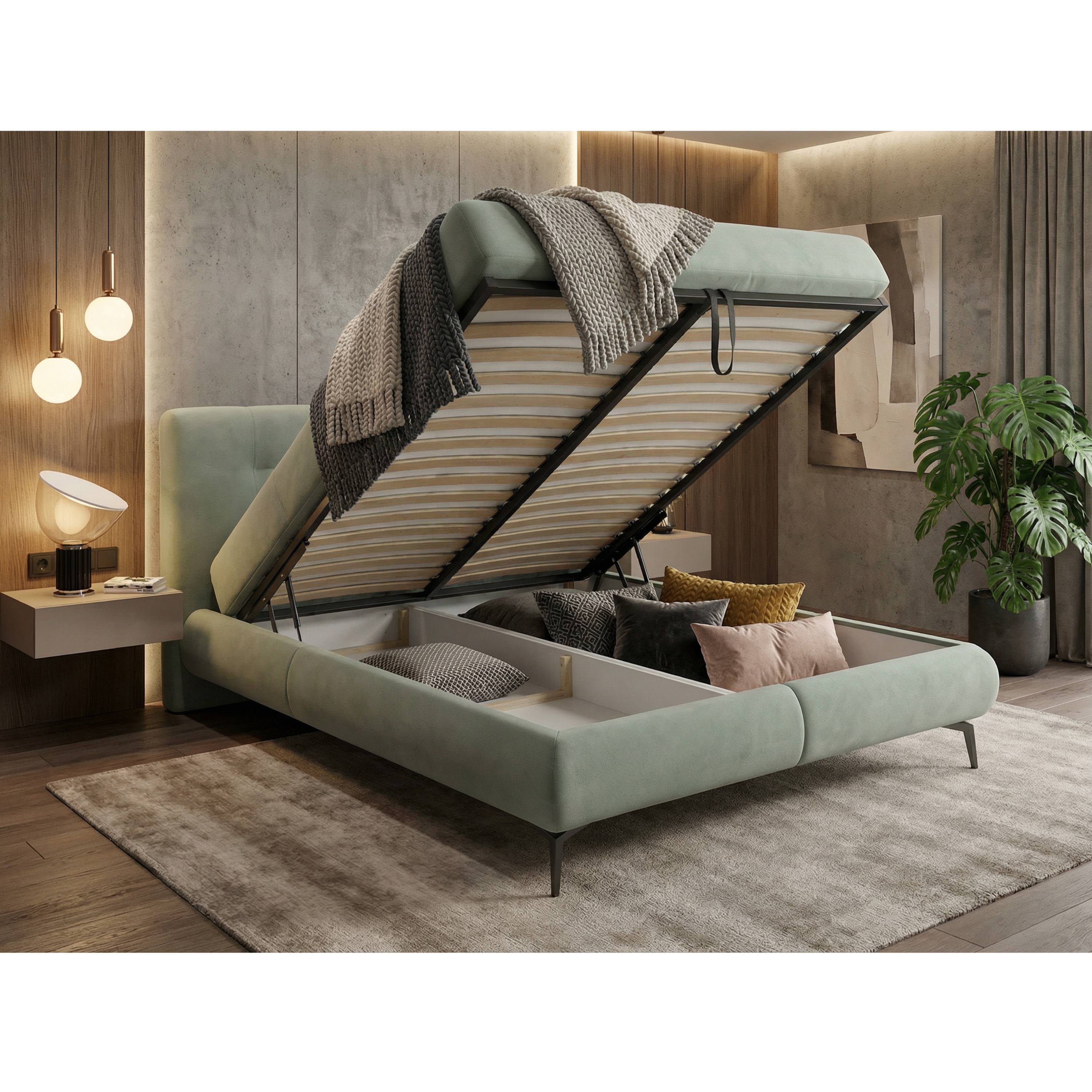 Postel je dodávána včetně 9-zónové matrace s jádrem z taštičkových pružin v kombinaci s pěnovou vrstvou kokosovými vlákny. Pro skladování aktuálně nepoužívaných lůžkovin a dalších předmětů můžete využít úložný prostor v rámu postele, který je snadno přístupný díky čelnímu výklopu matrace. Celkový vzhled postele doplňují kovové nohy v černé barvě, které také usnadňují úklid pod nábytkem.