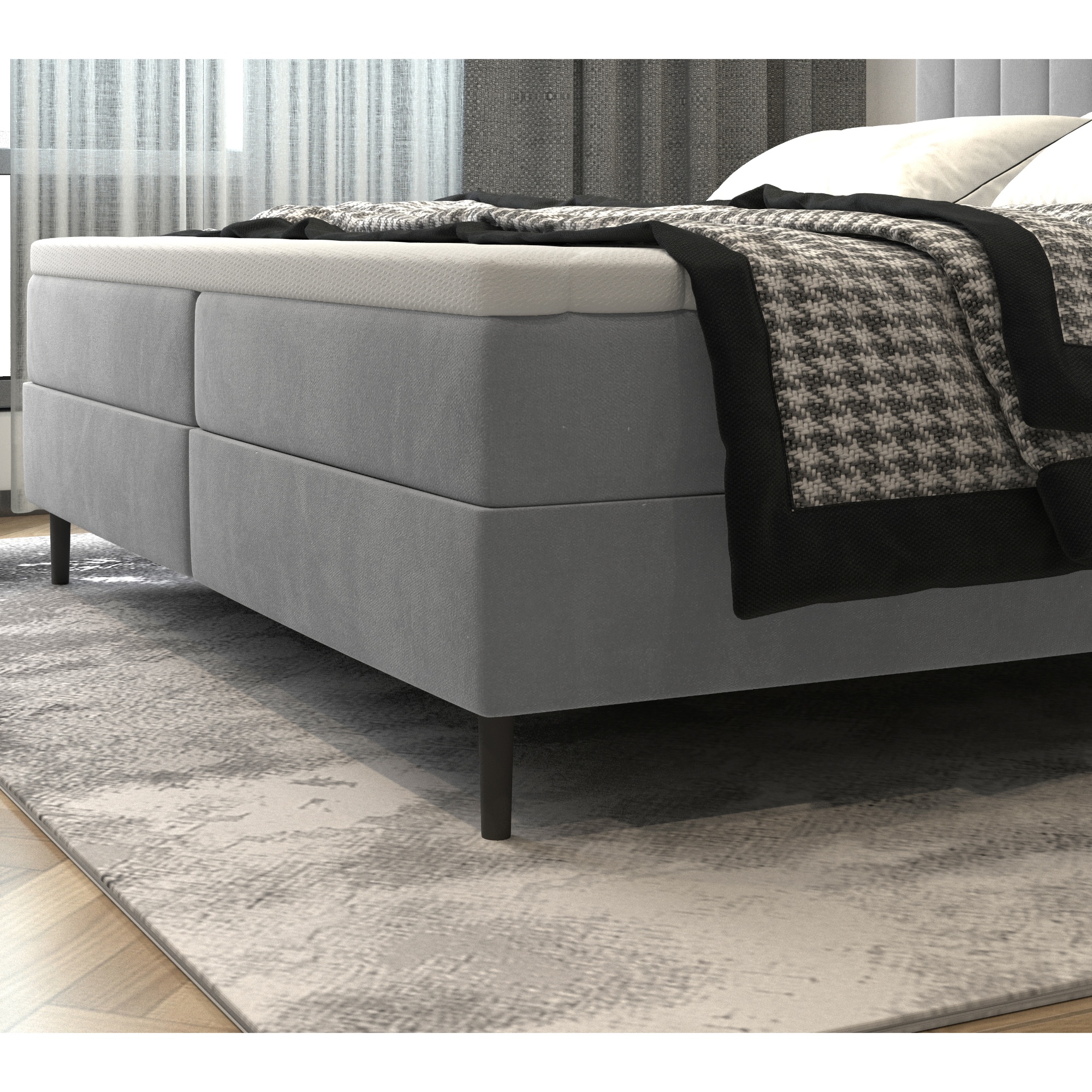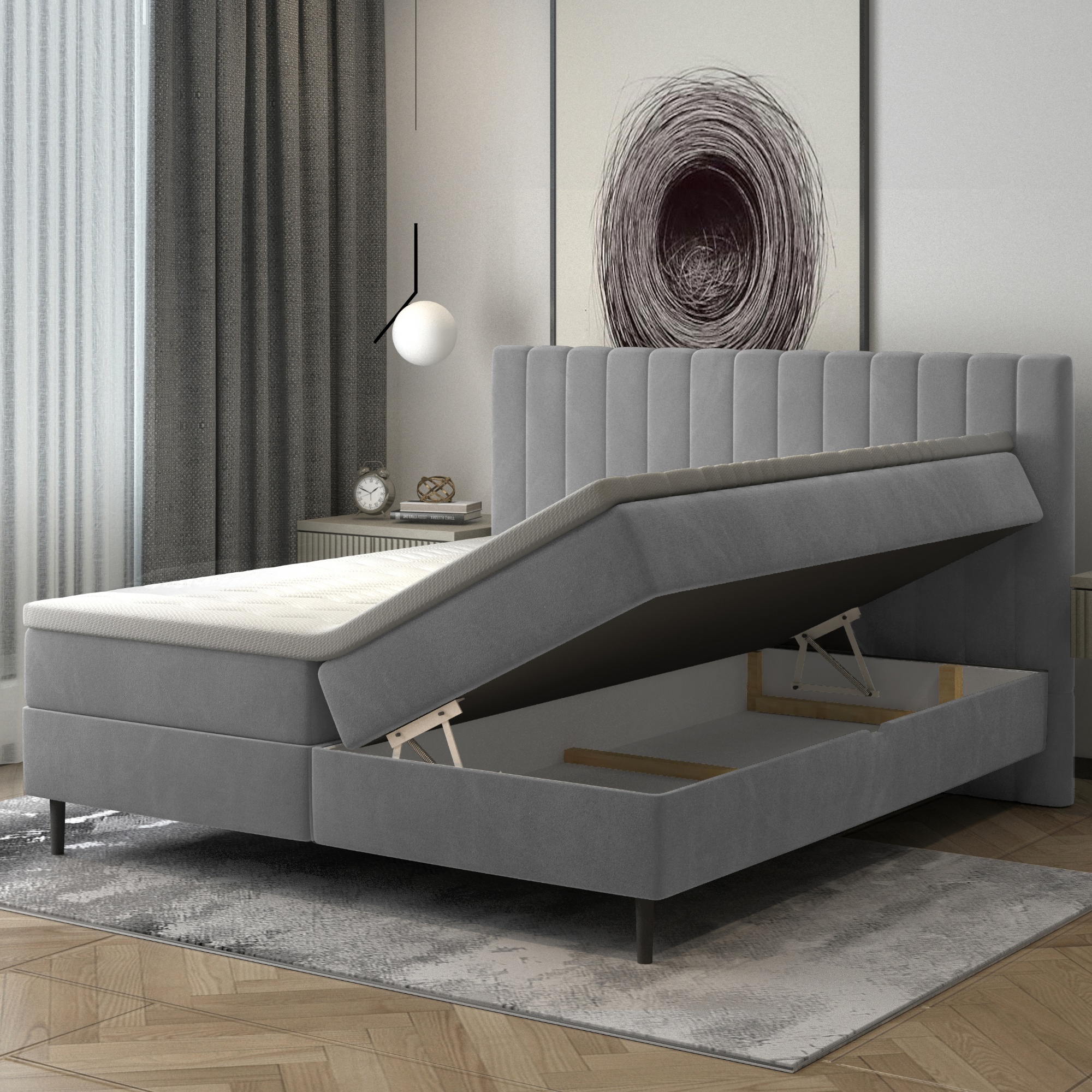 Postel disponuje matrací s bonellovými pružinami, které zajišťují pevnou oporu při ležení. Pro ještě větší komfort má postel ochranný topper, který sjednocuje celou ložnou plochu a chrání ostatní vrstvy před proležením. Systém bočního výklopu matrace pomocí plynových pístů umožňuje jednoduchý přístup do praktického úložného prostoru.